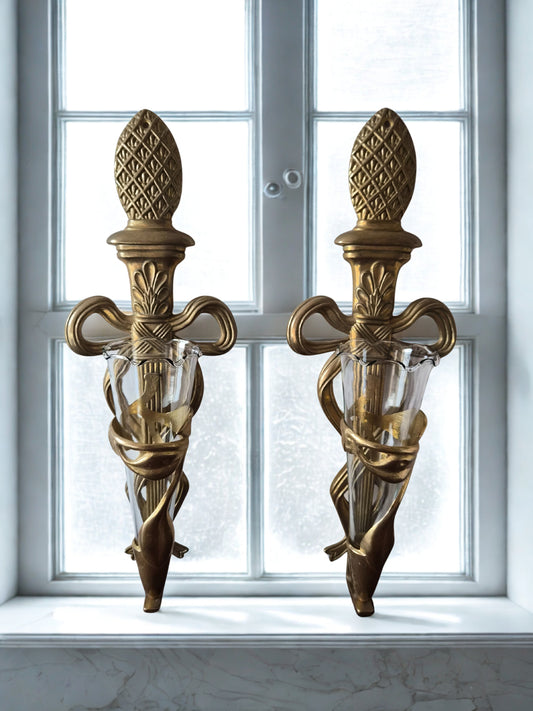 Brass Art Nouveau-Style Wall Sconces w/Glass Trumpet Vases
