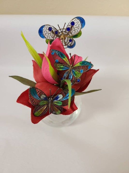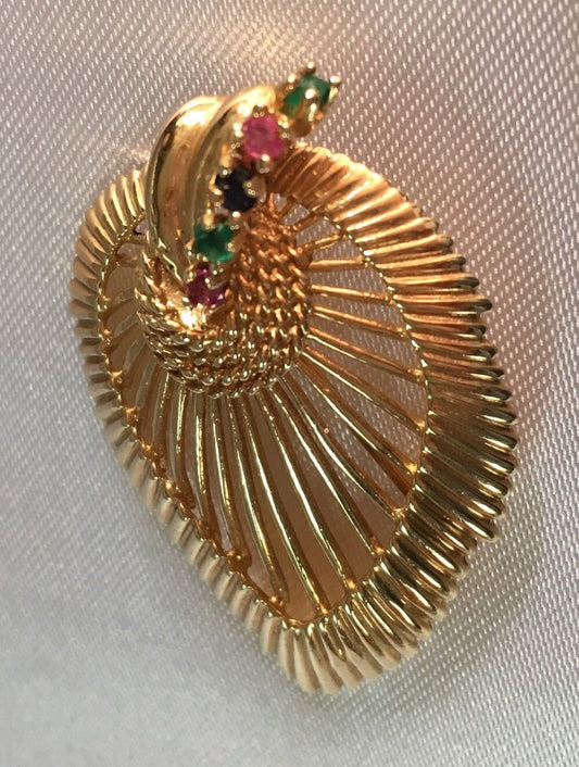 Estate, Vintage, 14K Yellow Gold Leaf Pin/Brooch/Enhancer with Emeralds, Rubies, and Sapphire