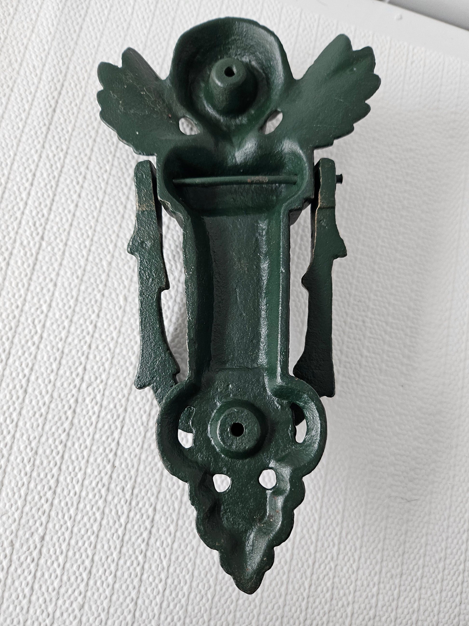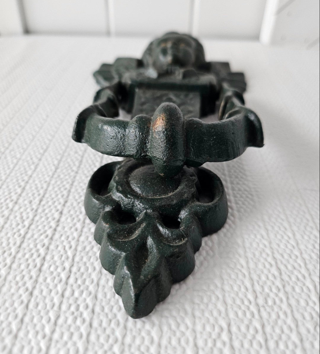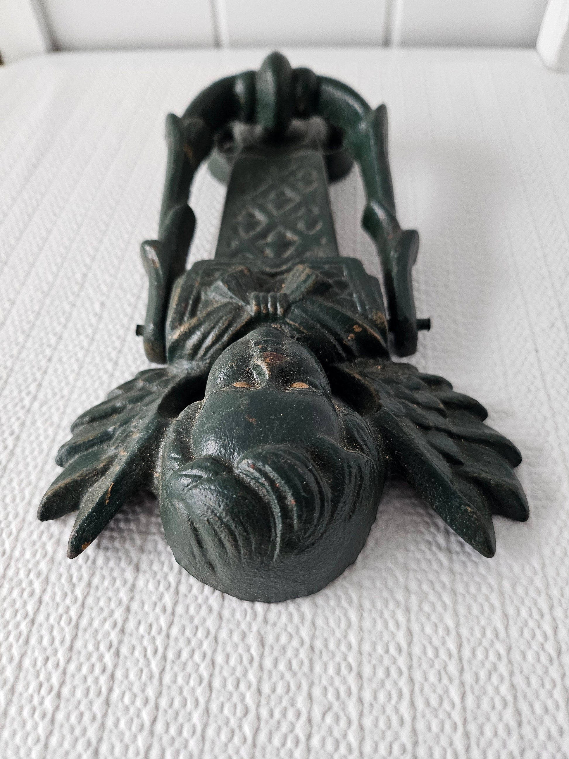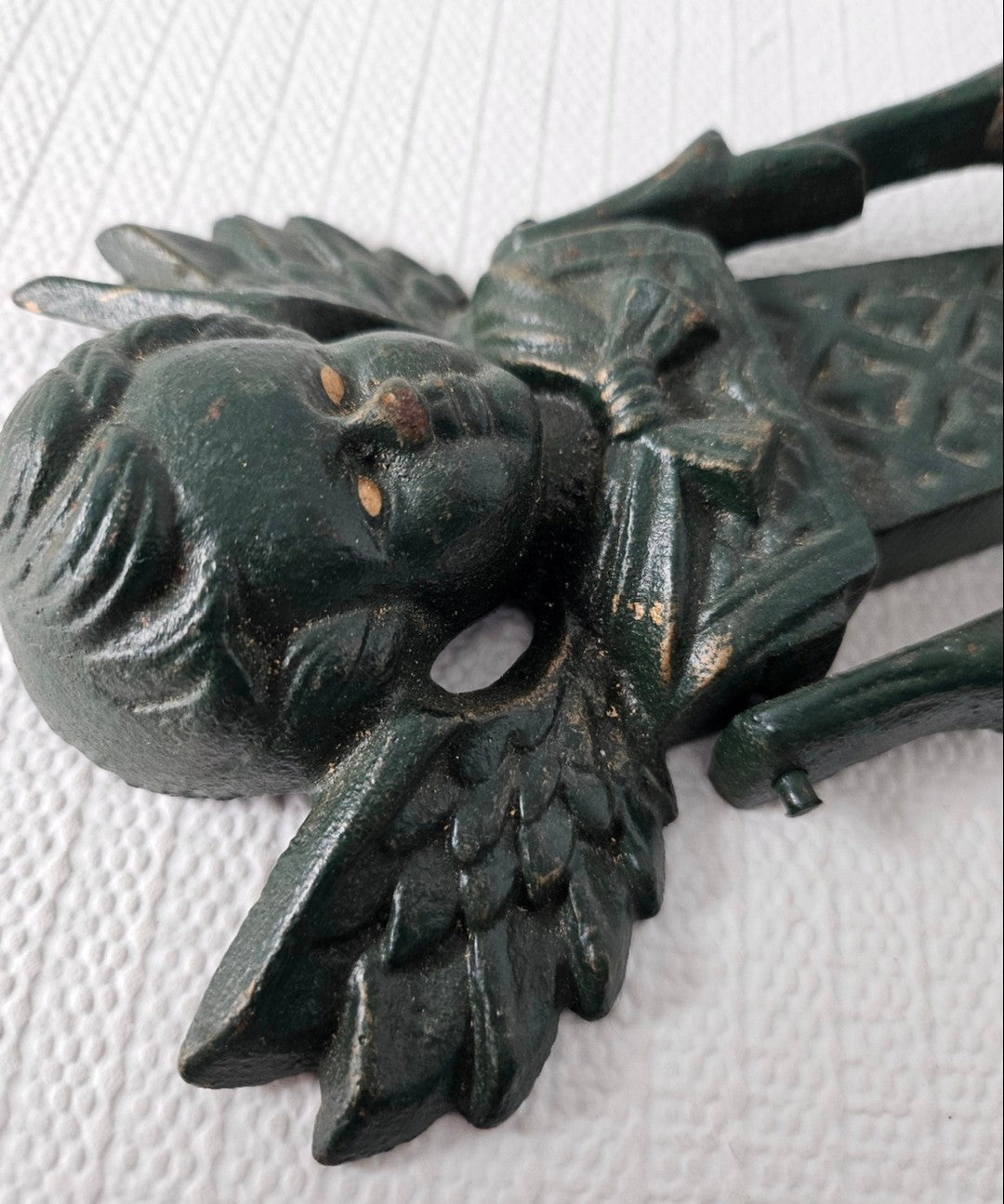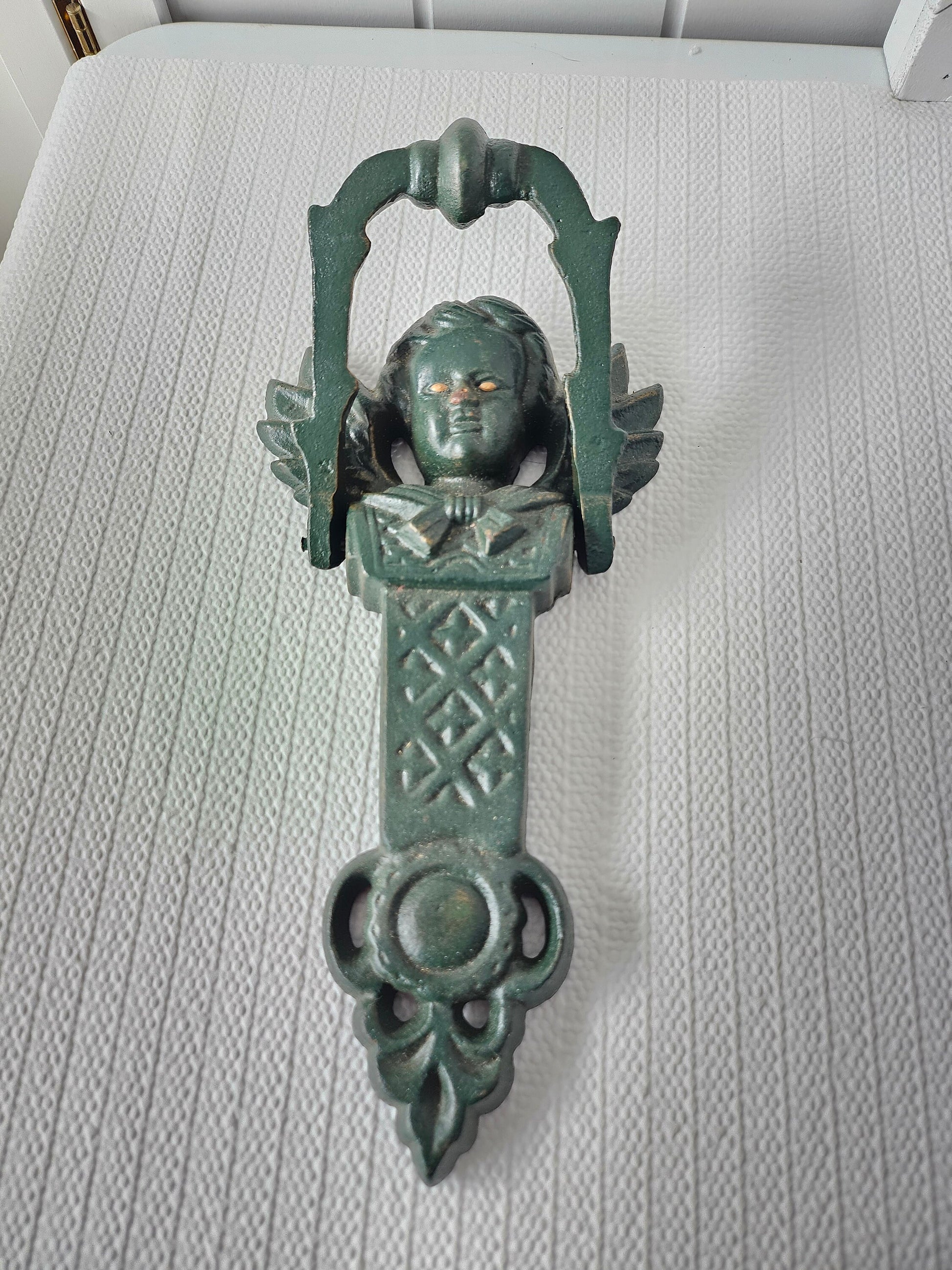 Cute cast iron angel door knocker in dark green with gold eyes.