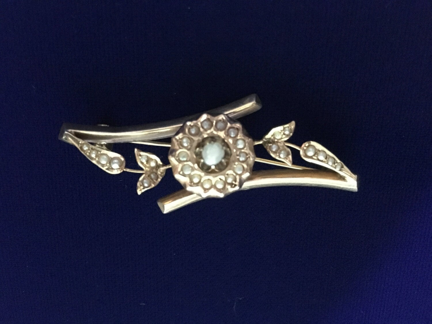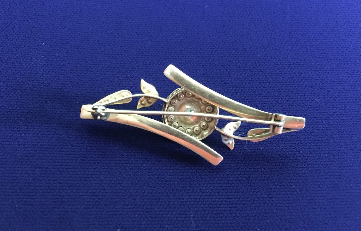The Circular center is approx. 15 mm in diameter and surrounded by 14 inlaid seed pearls - in the middle sits a single larger seed pearl mounted in a 6 prong setting. 16 additional inlaid seed pearls adorn the outstretched leaves