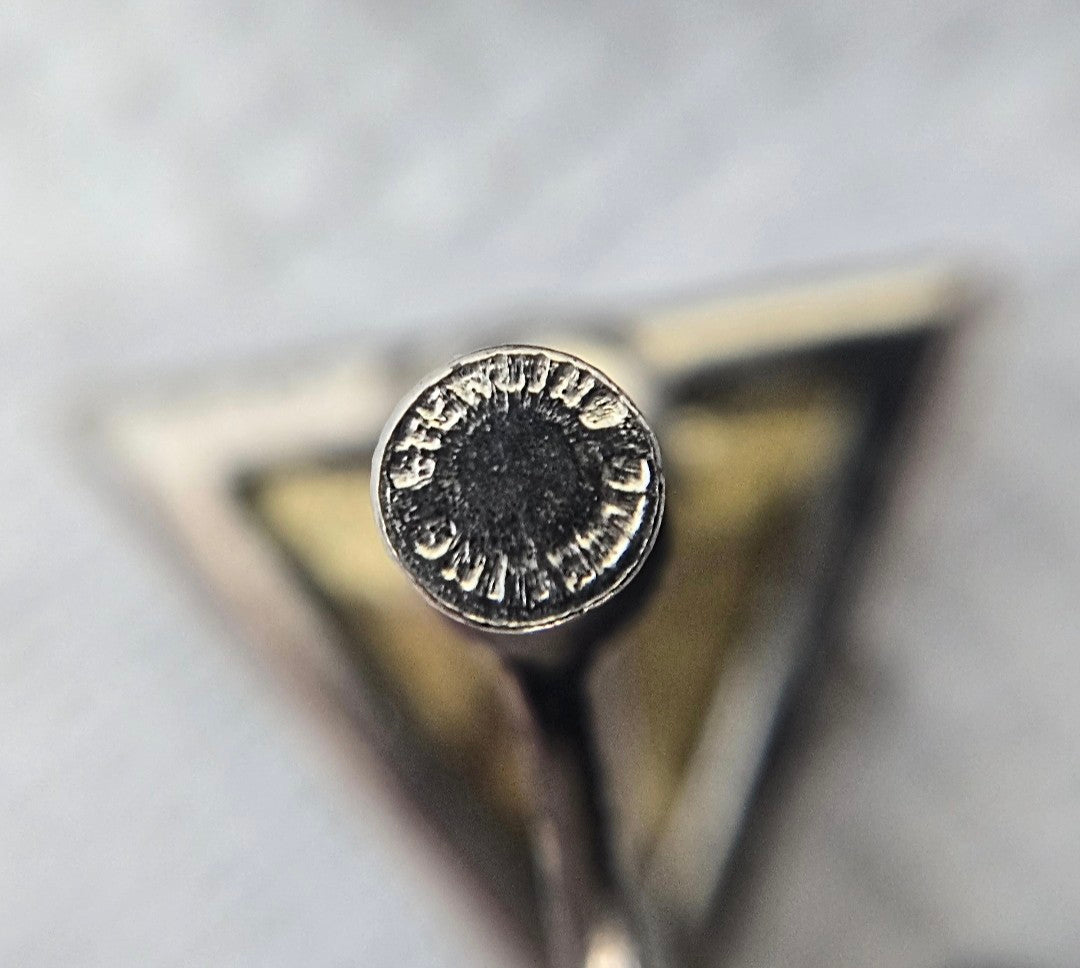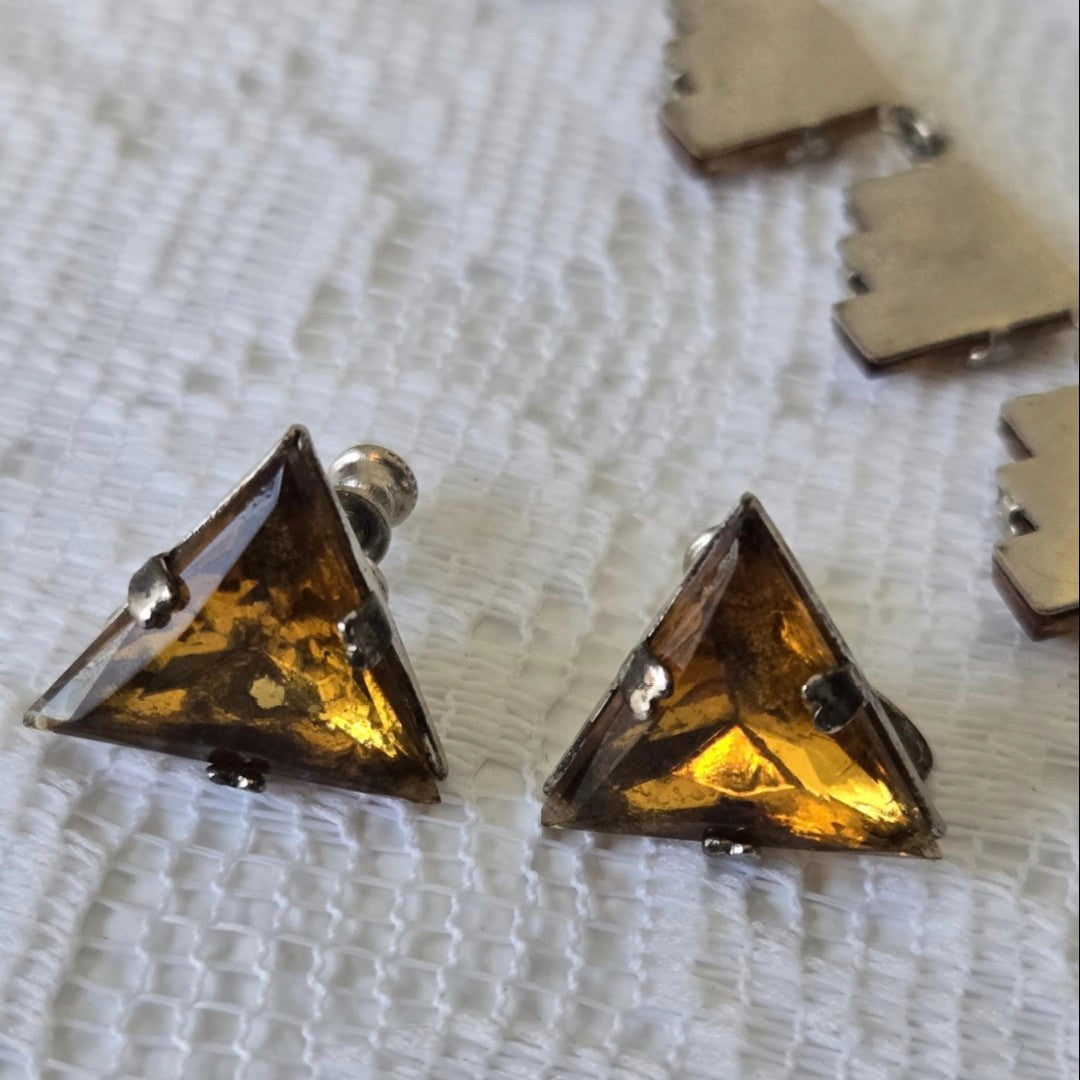 The screw back, yellow glass and silver backing triangular earrings are hallmarked sterling.
