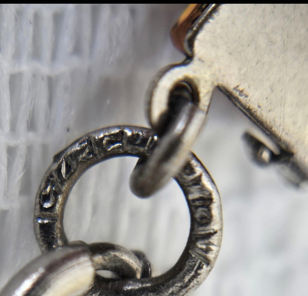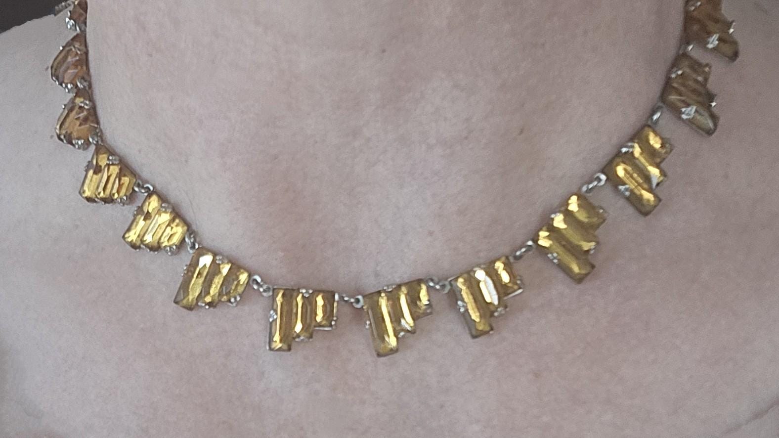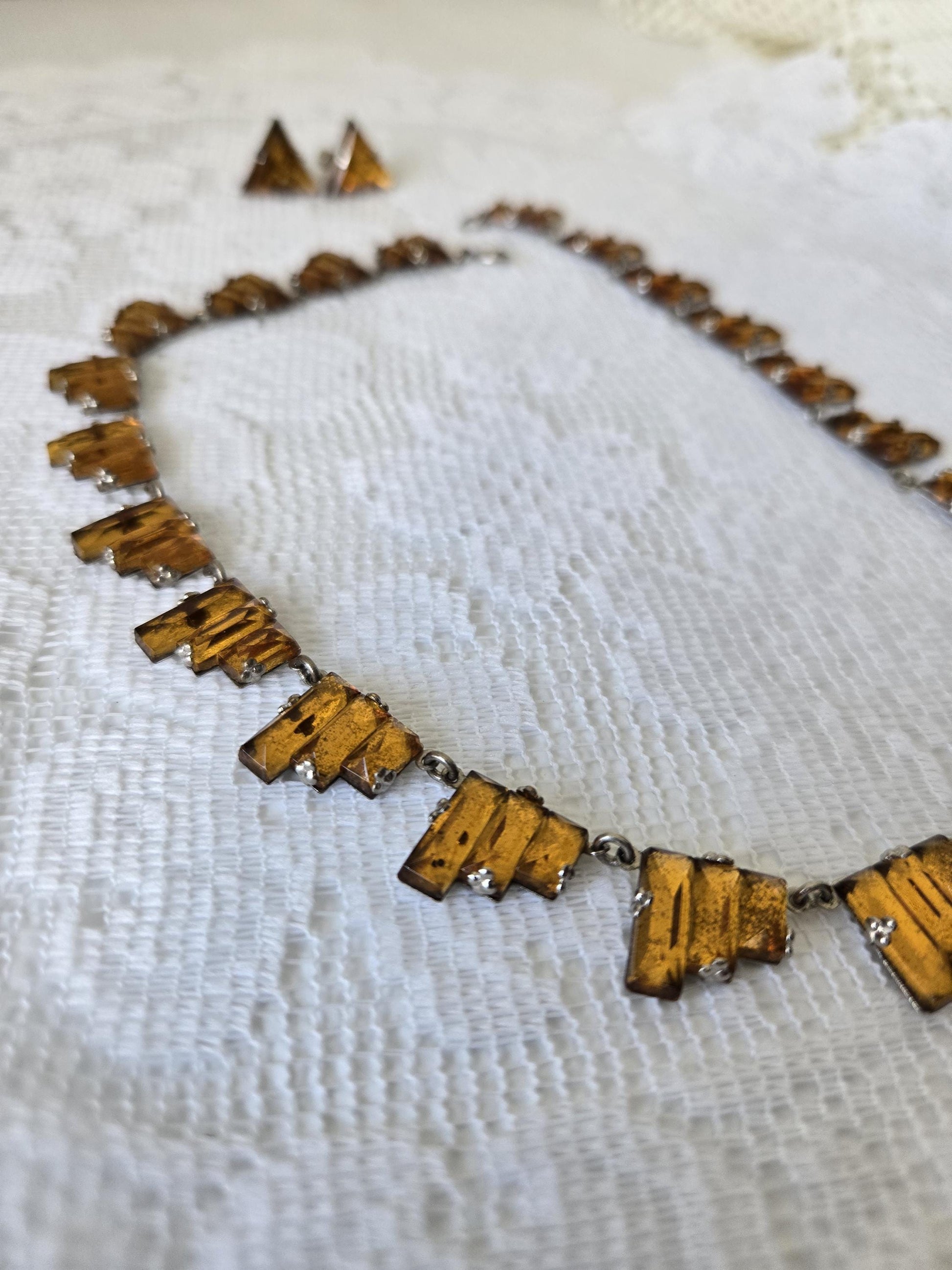 Beautiful, Art Deco geometric linked choker necklace and earring set. Necklace consists of yellow-colored glass with silver backing, and set in sterling links, not brass. Necklace bale is hallmarked Czechoslovakia, no other hallmark can be ascertained.