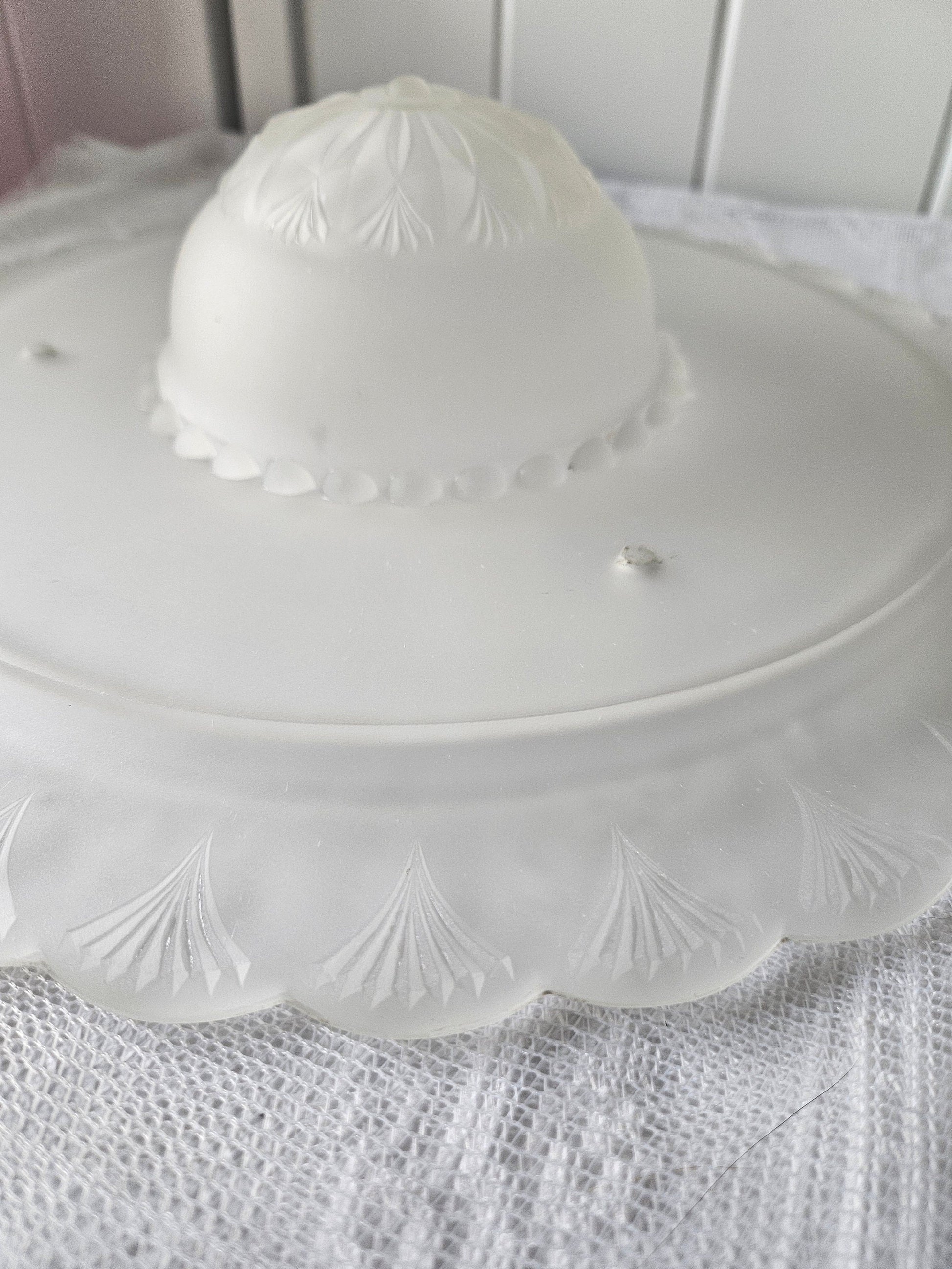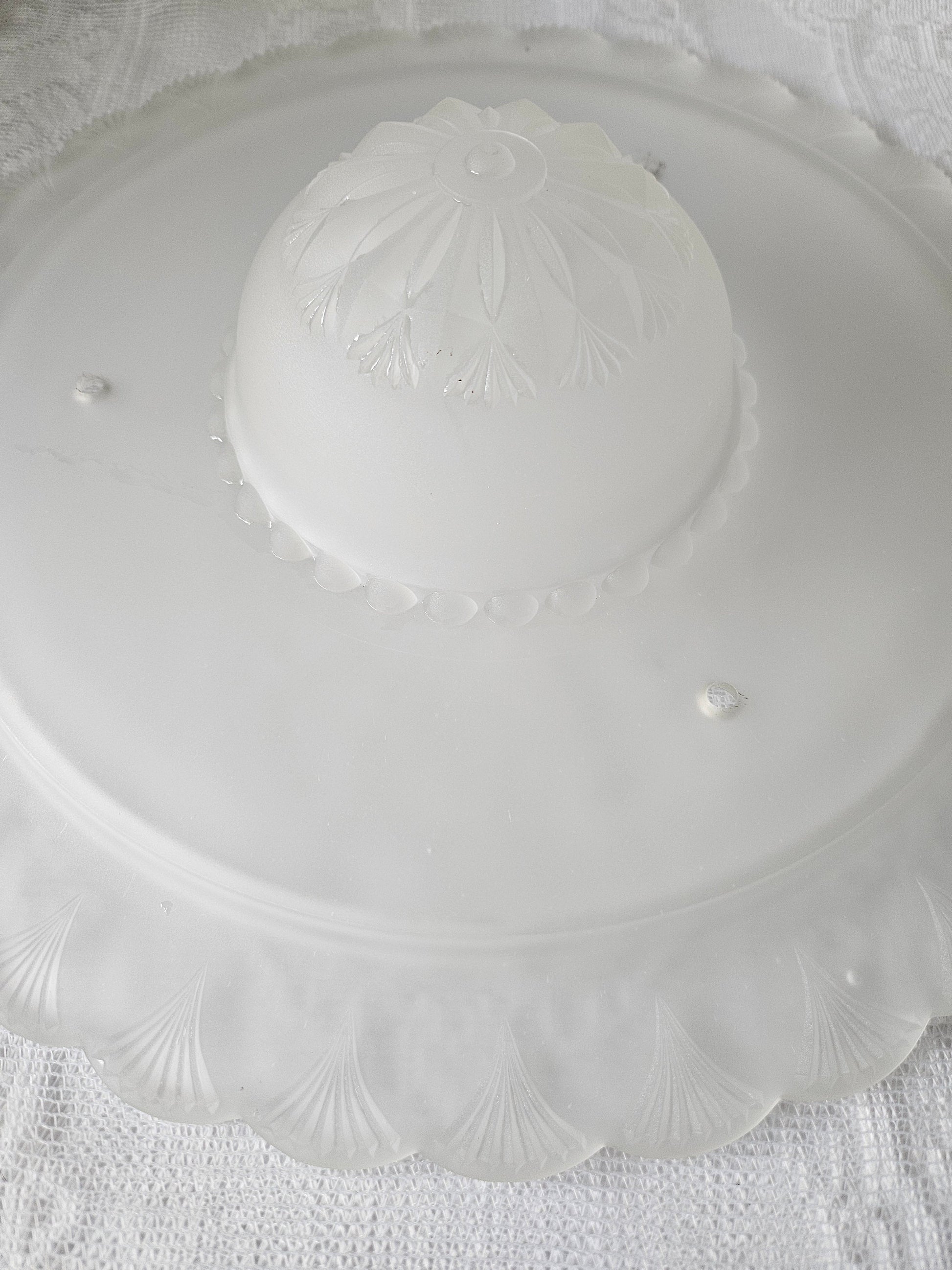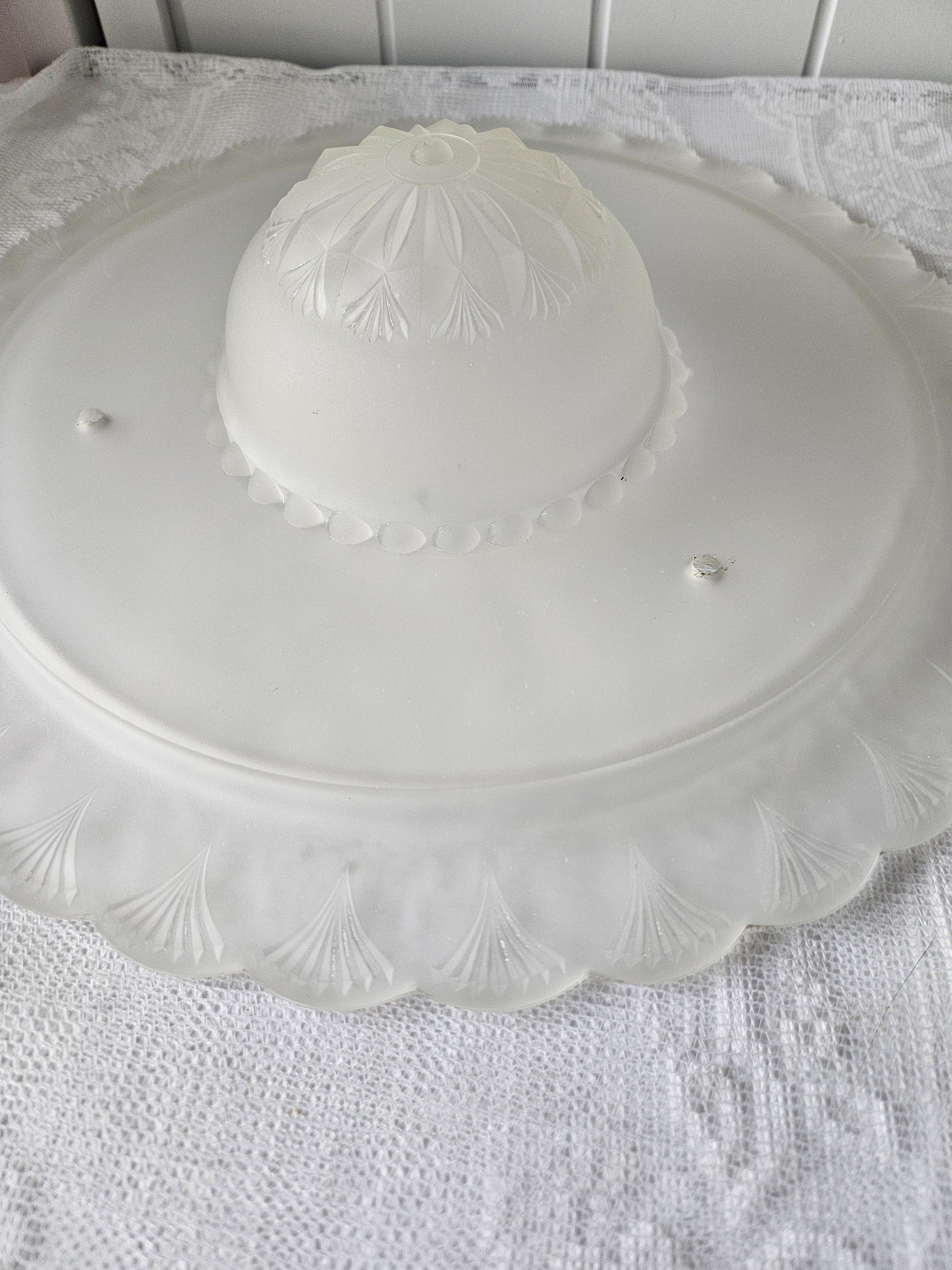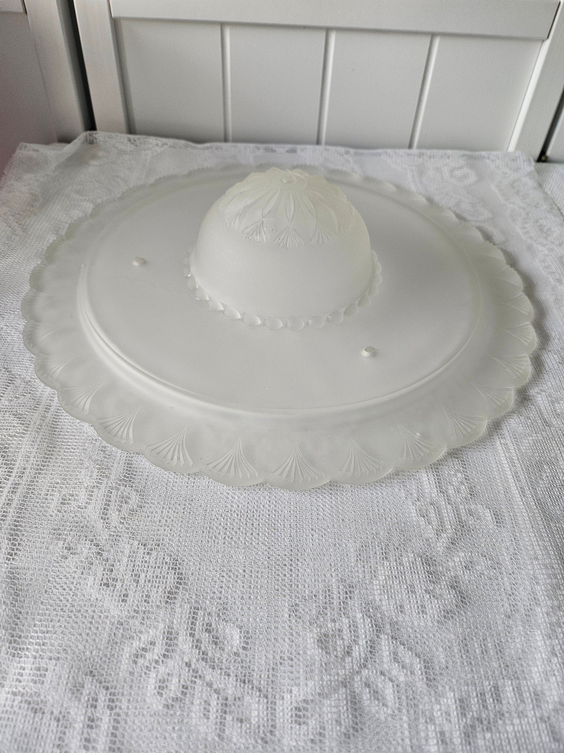 Lovely, vintage Art Deco bonnet-style frosted ceiling light replacement shade. Frosted glass with fan shaped edge and raised middle.