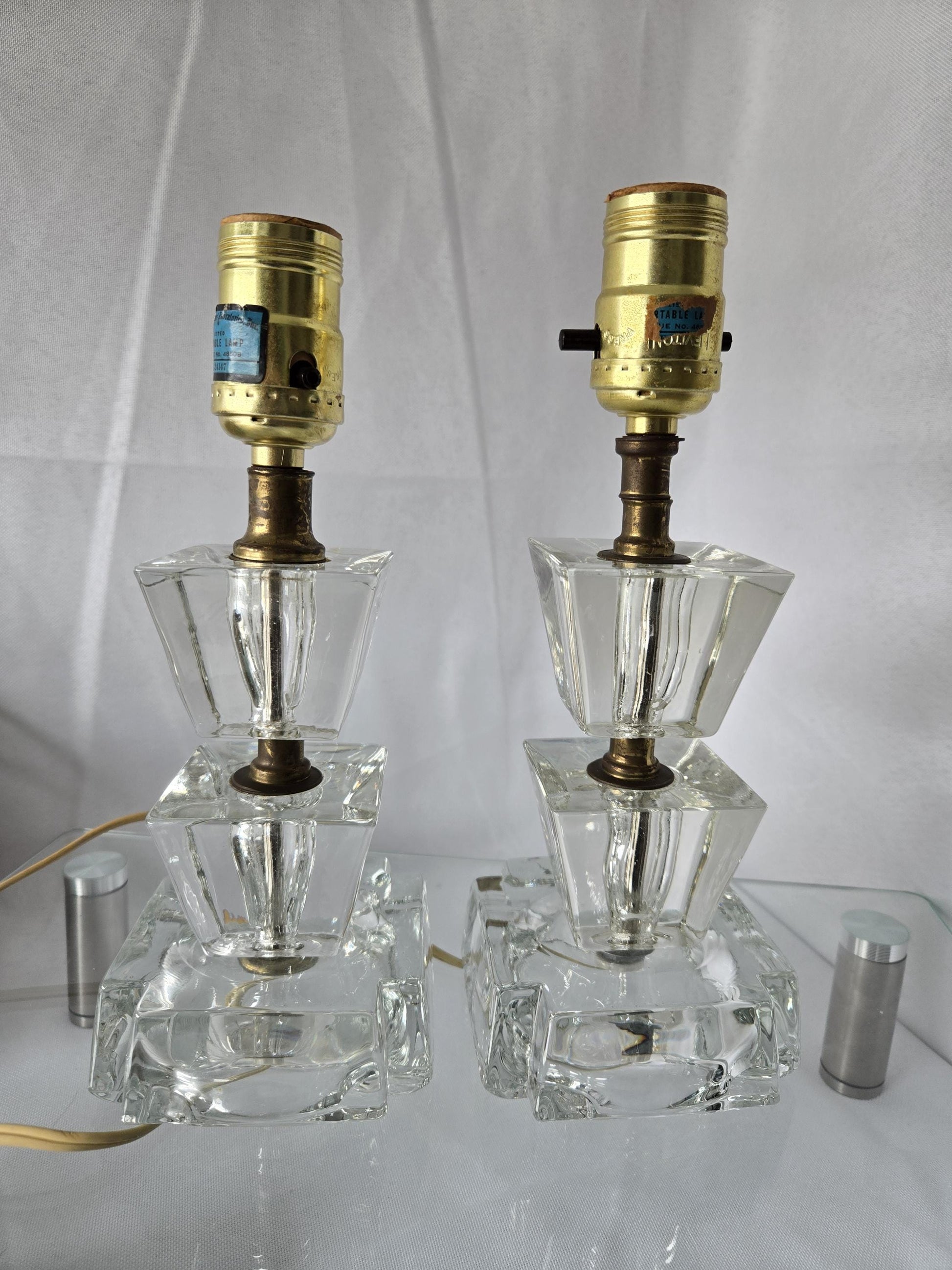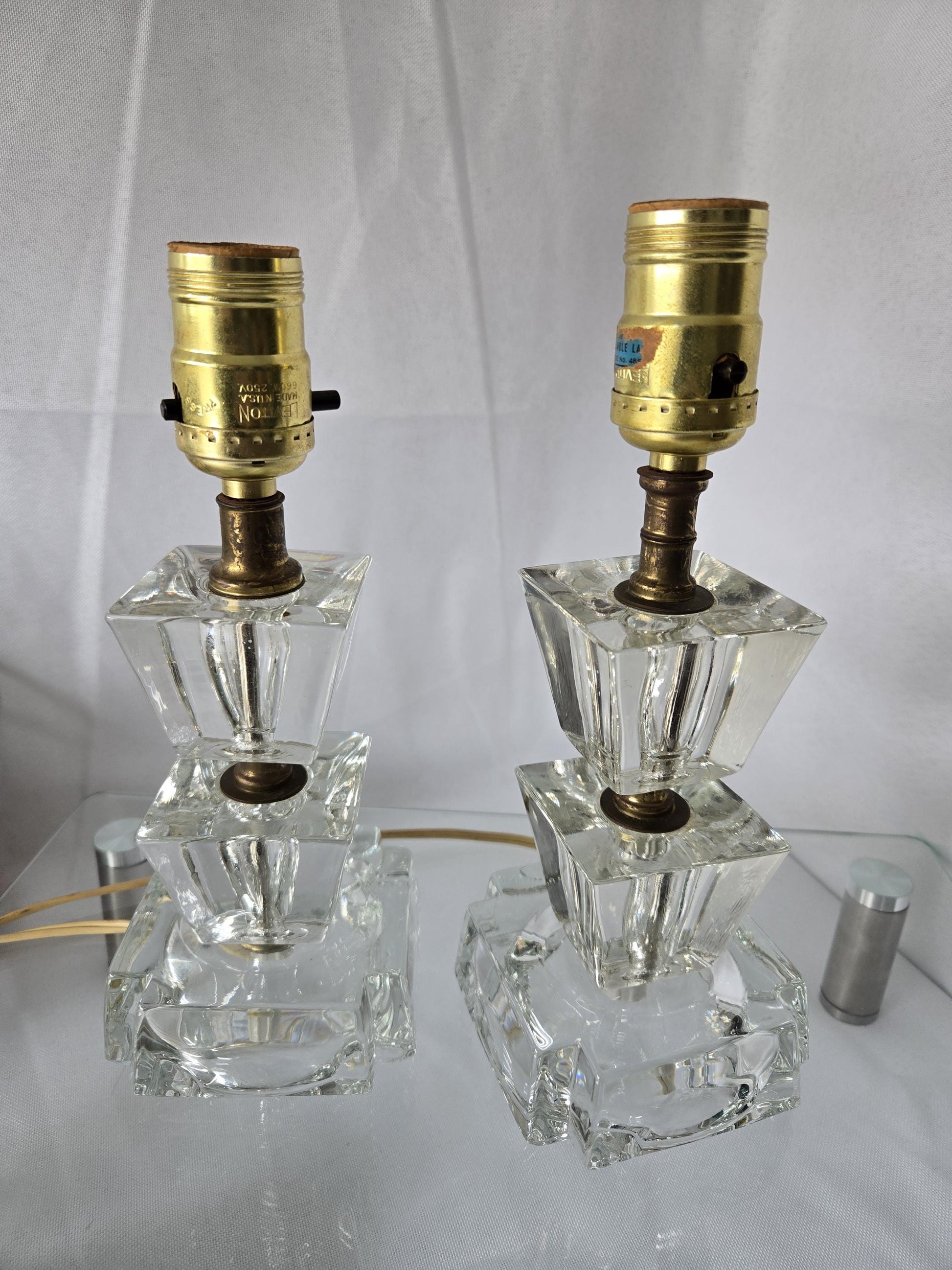 We think this fabulous Pair of Art Deco glass lamps are artsy. Each lamp has trapezoid middle sections and square bases with cut out corners, and come with their original shades.