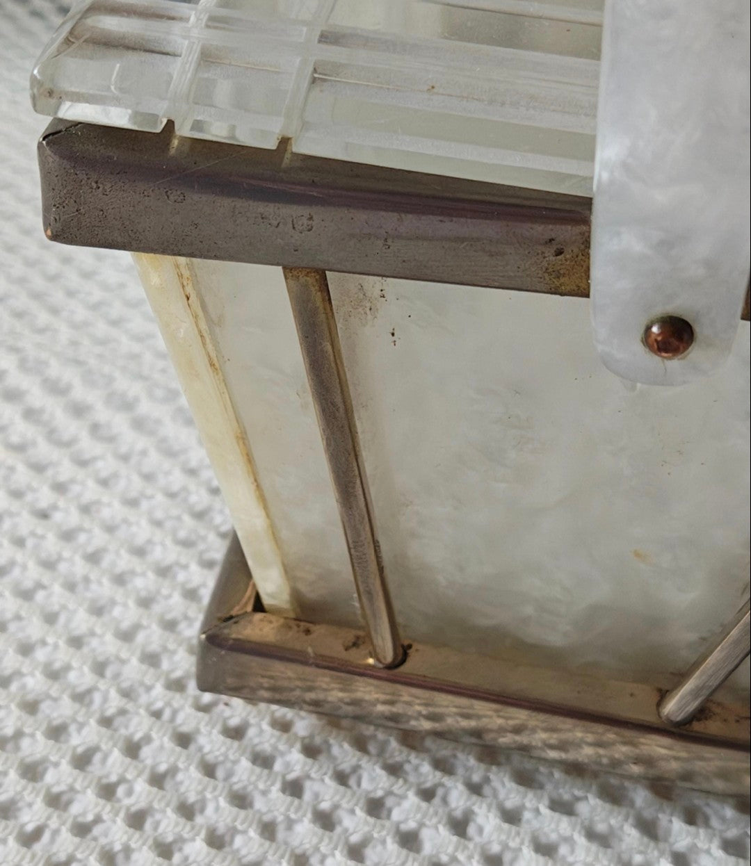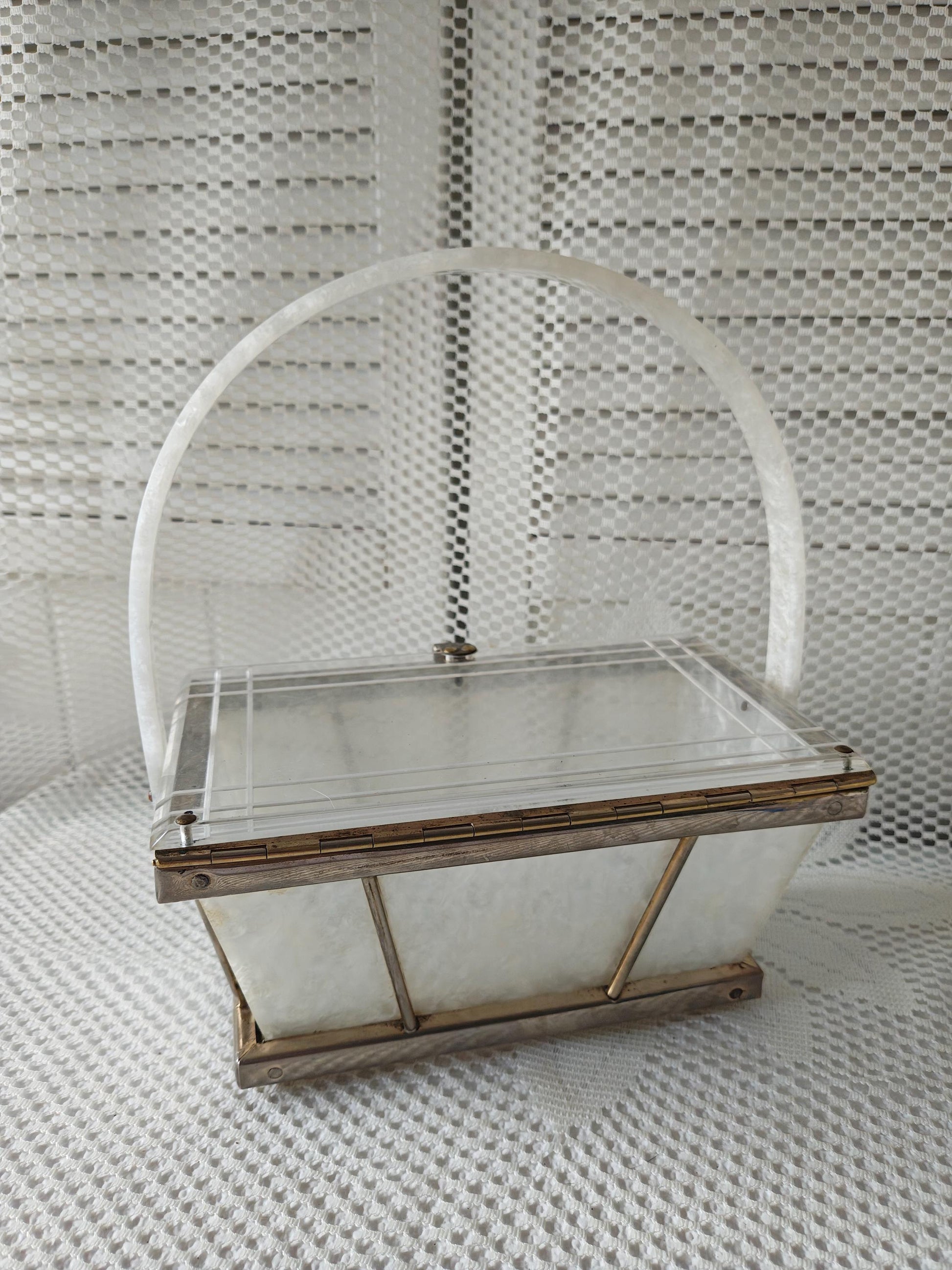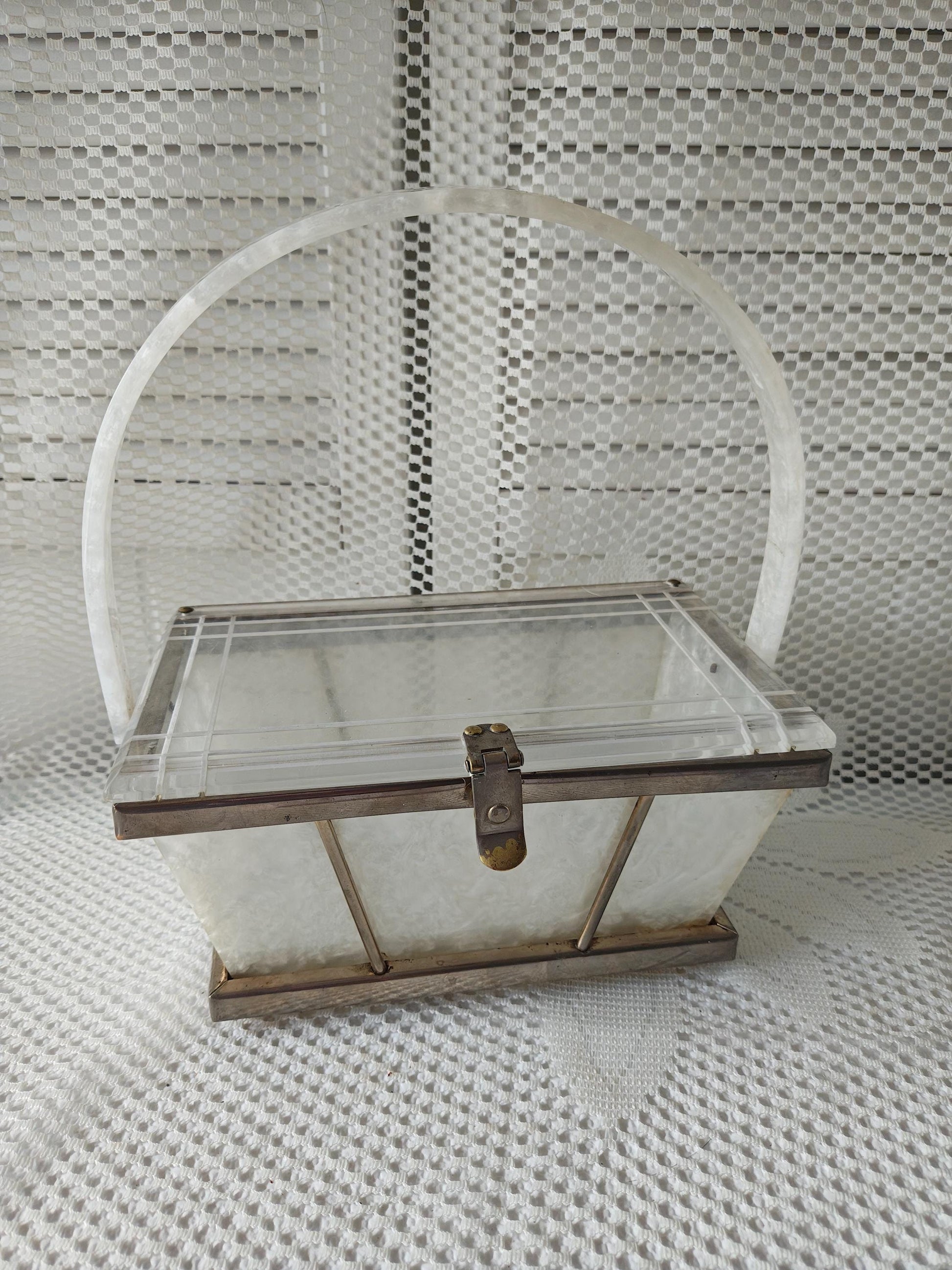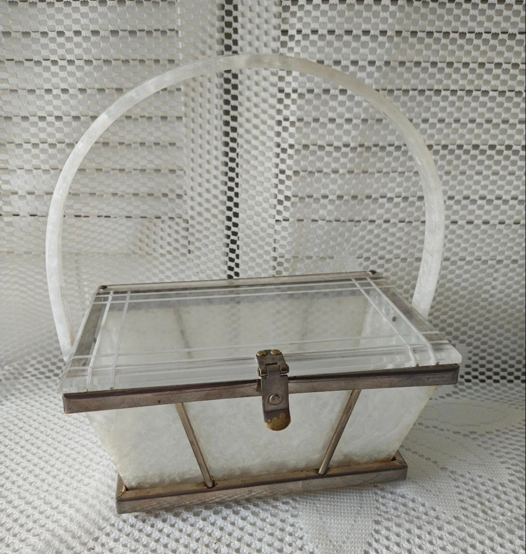 Art Deco pearlized lucite white handbag with metal frame, single lucite handle, and drop lid with snap closure.
