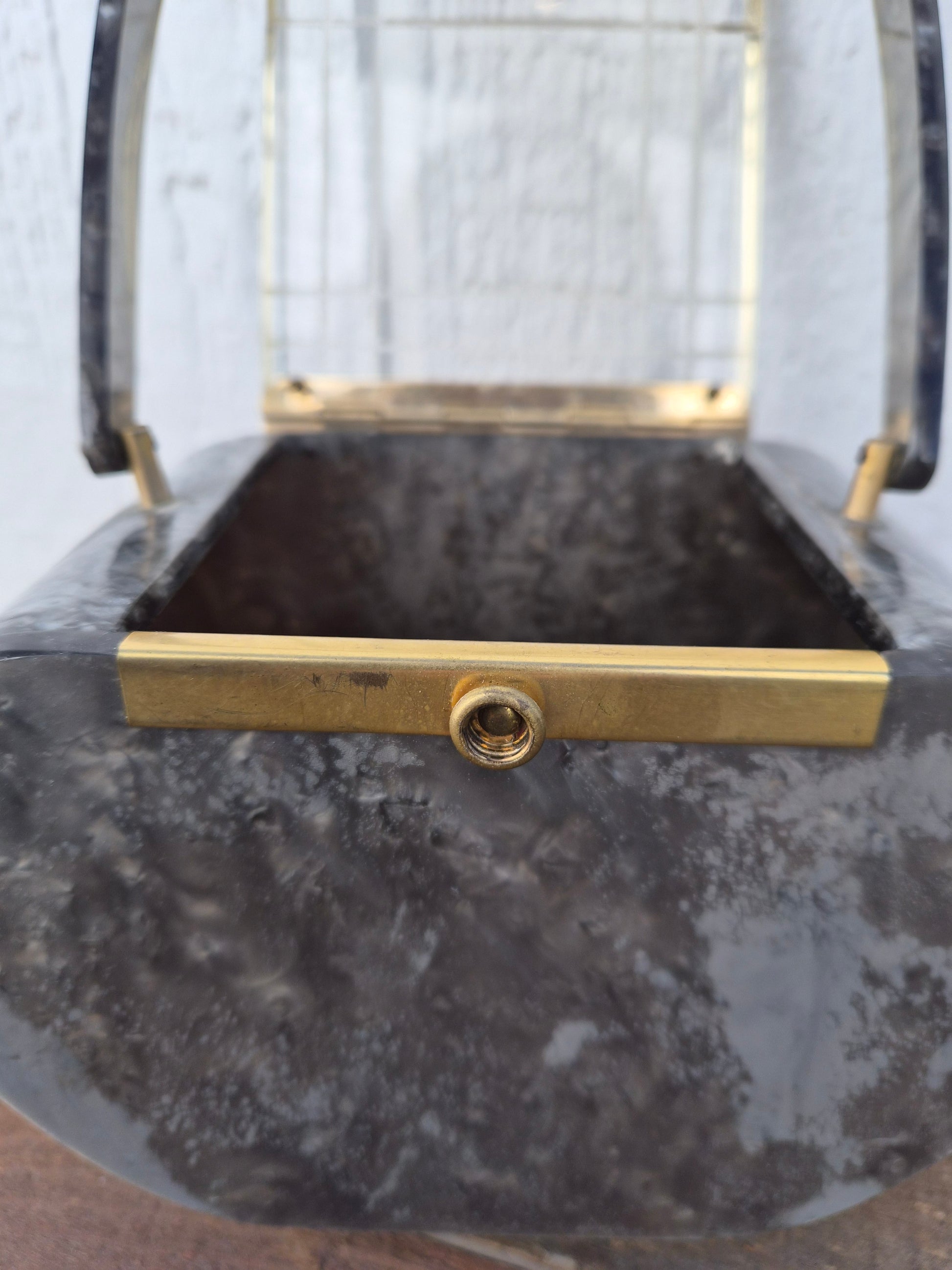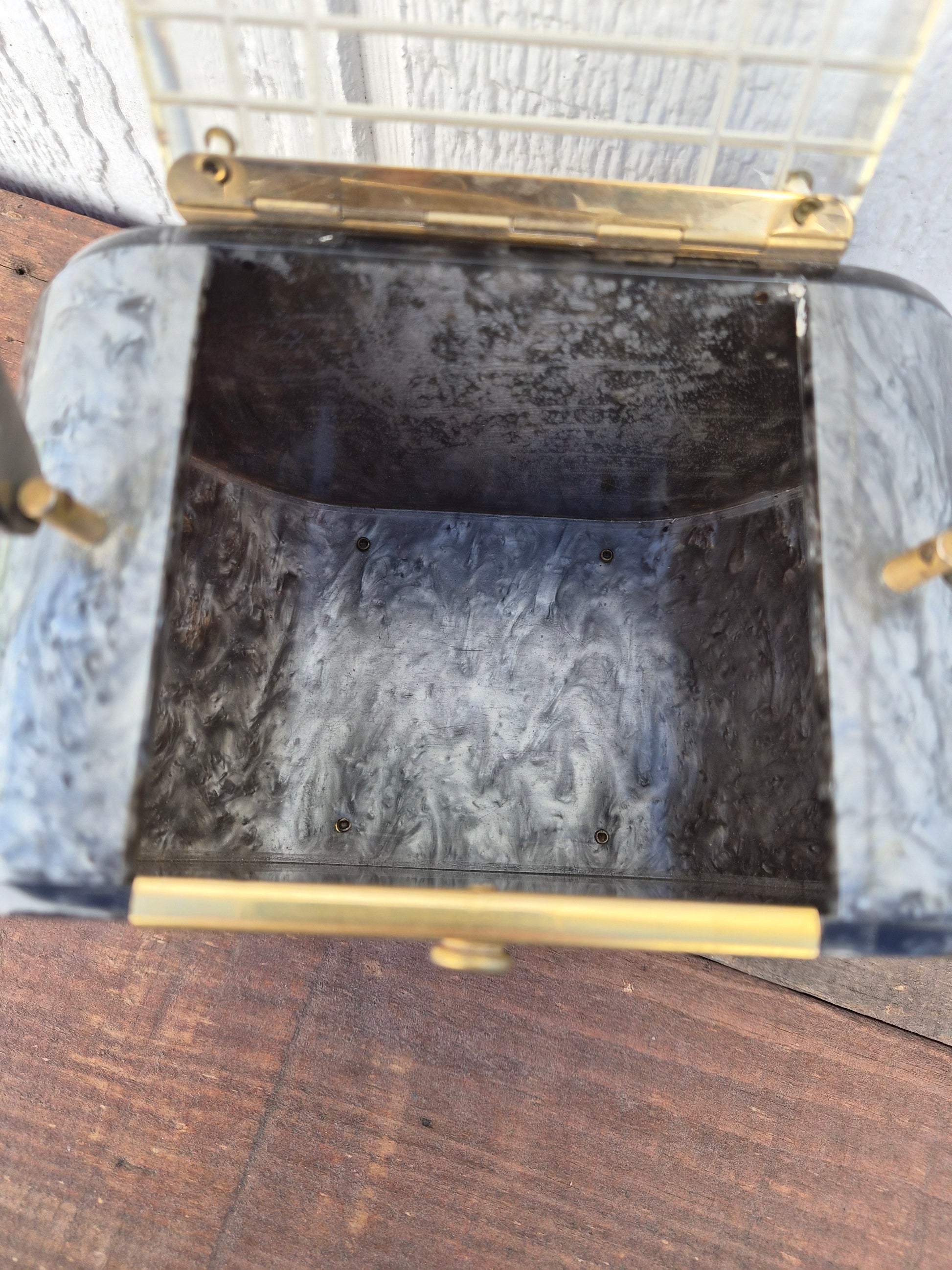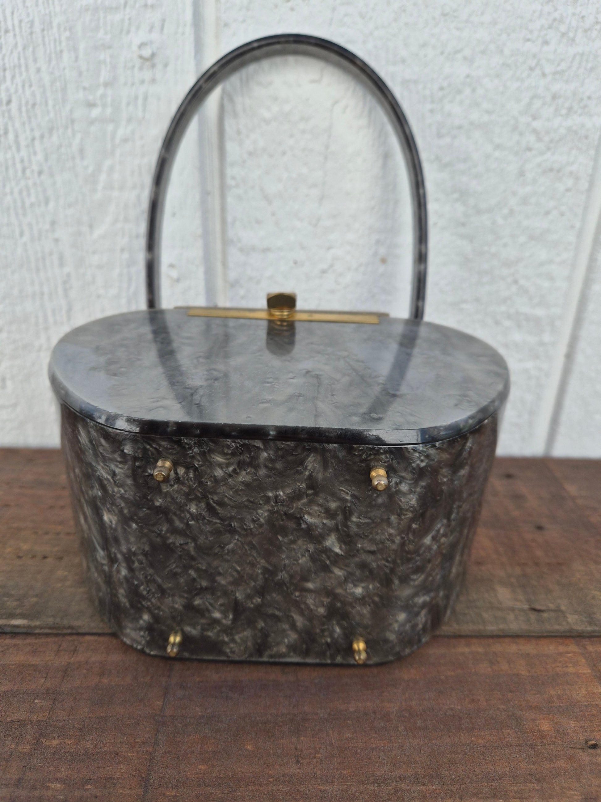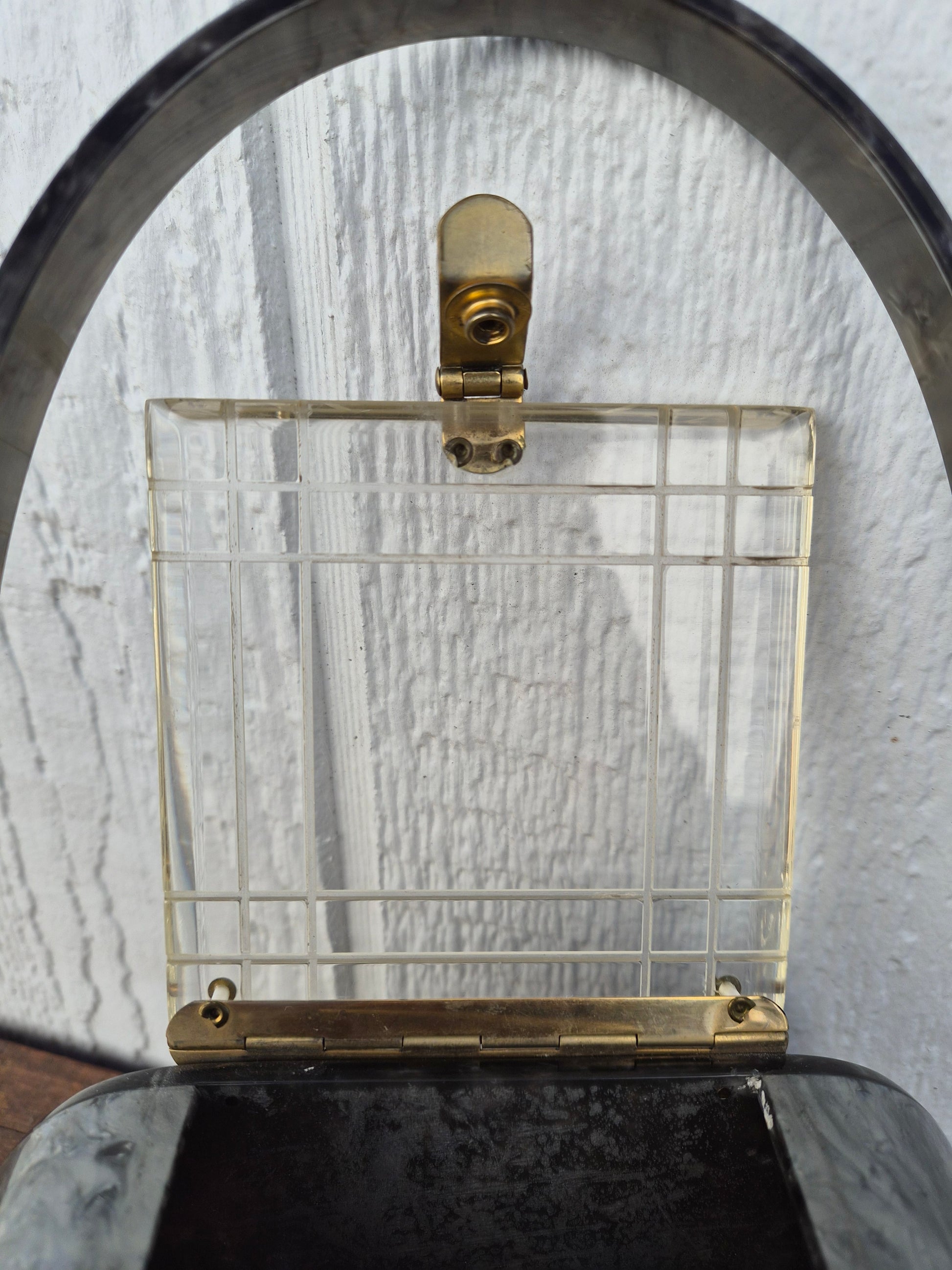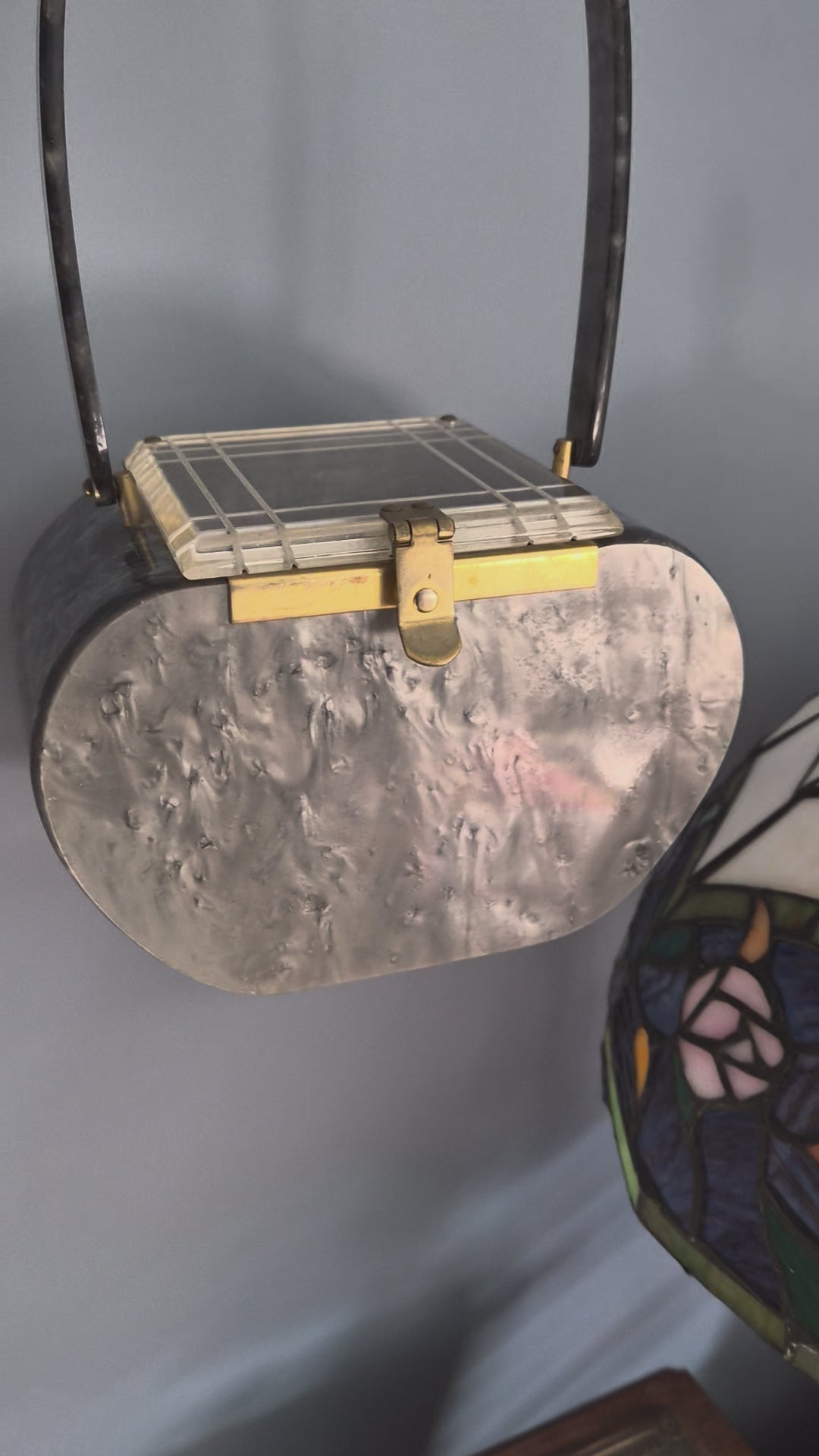 Amazing Art Deco lucite handbag in a pearlized gray finish, clear Deco style lid, single handle, footed, with a snap closure.