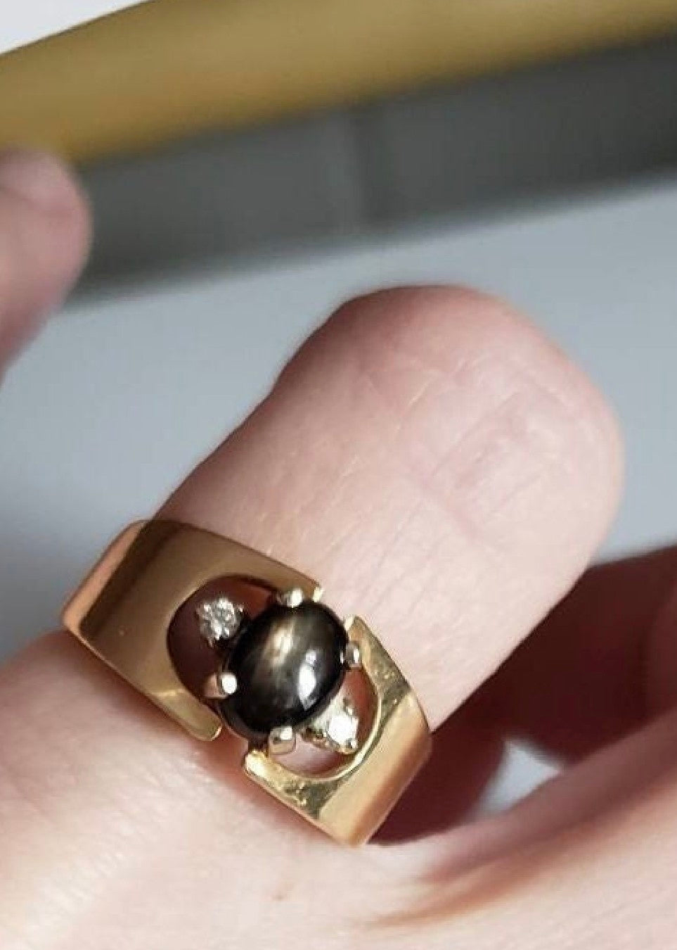 Ring has 2 side accent diamonds mounted in 3-prong settings. Set in an open head and 14K Yellow gold setting. Band is wider at the head (9mm) and gradually narrows down to (2.9mm).