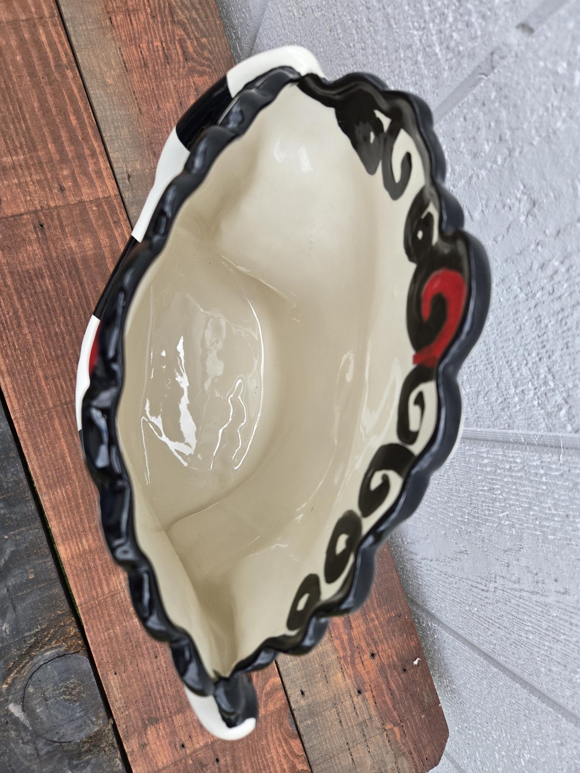 Fantastic, vintage signed Babroff ceramic magazine holder. Whimsically styled in a slouch purse design with swirls, stripes, and dots, its the perfect addition to your white and black decor theme.