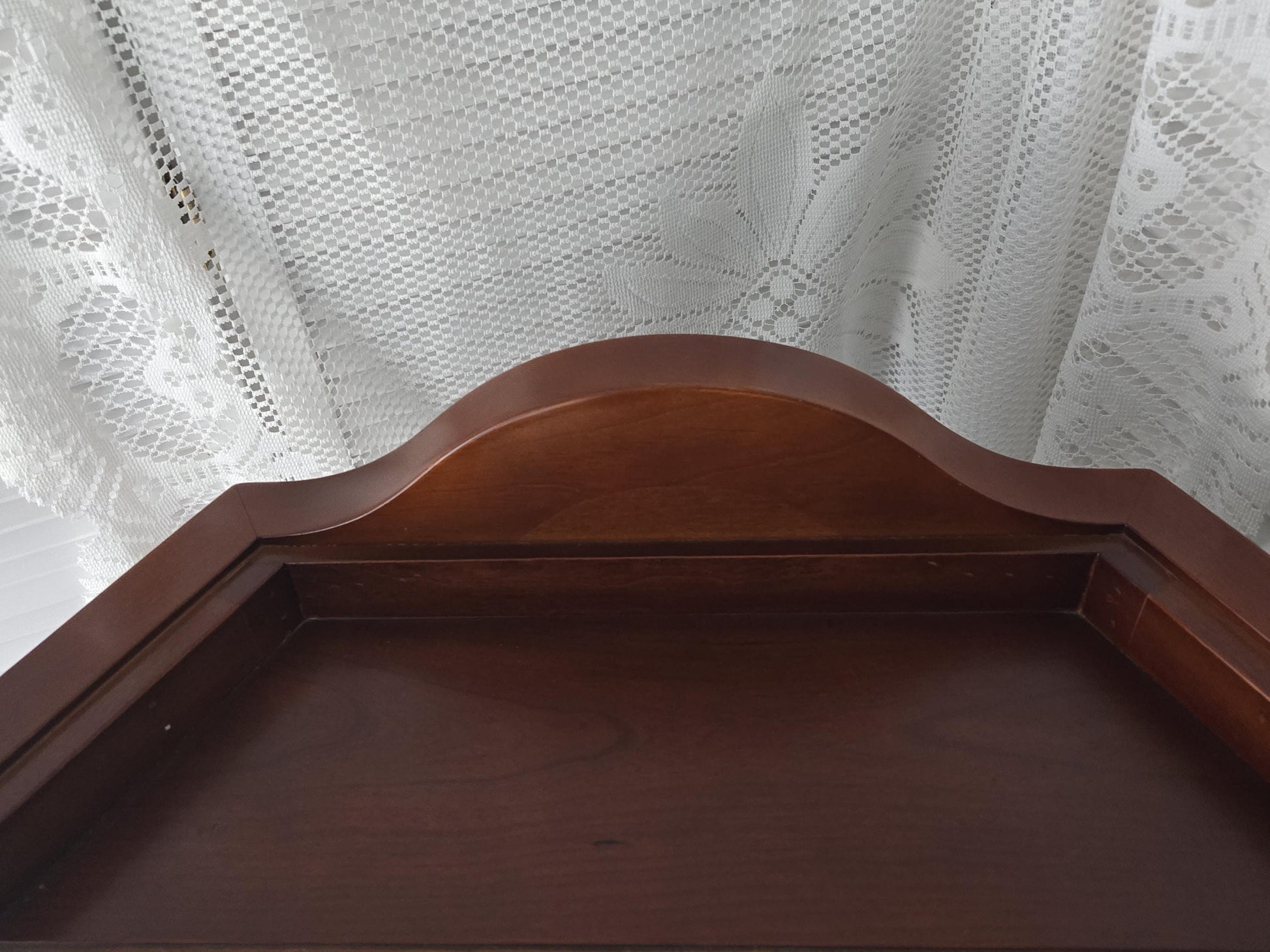 Hanging wall display case with arched front, magnetic door, and 2 angled glass shelves - by The Bombay Co.