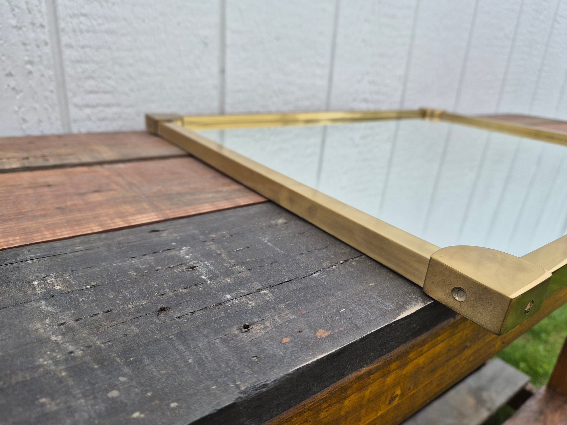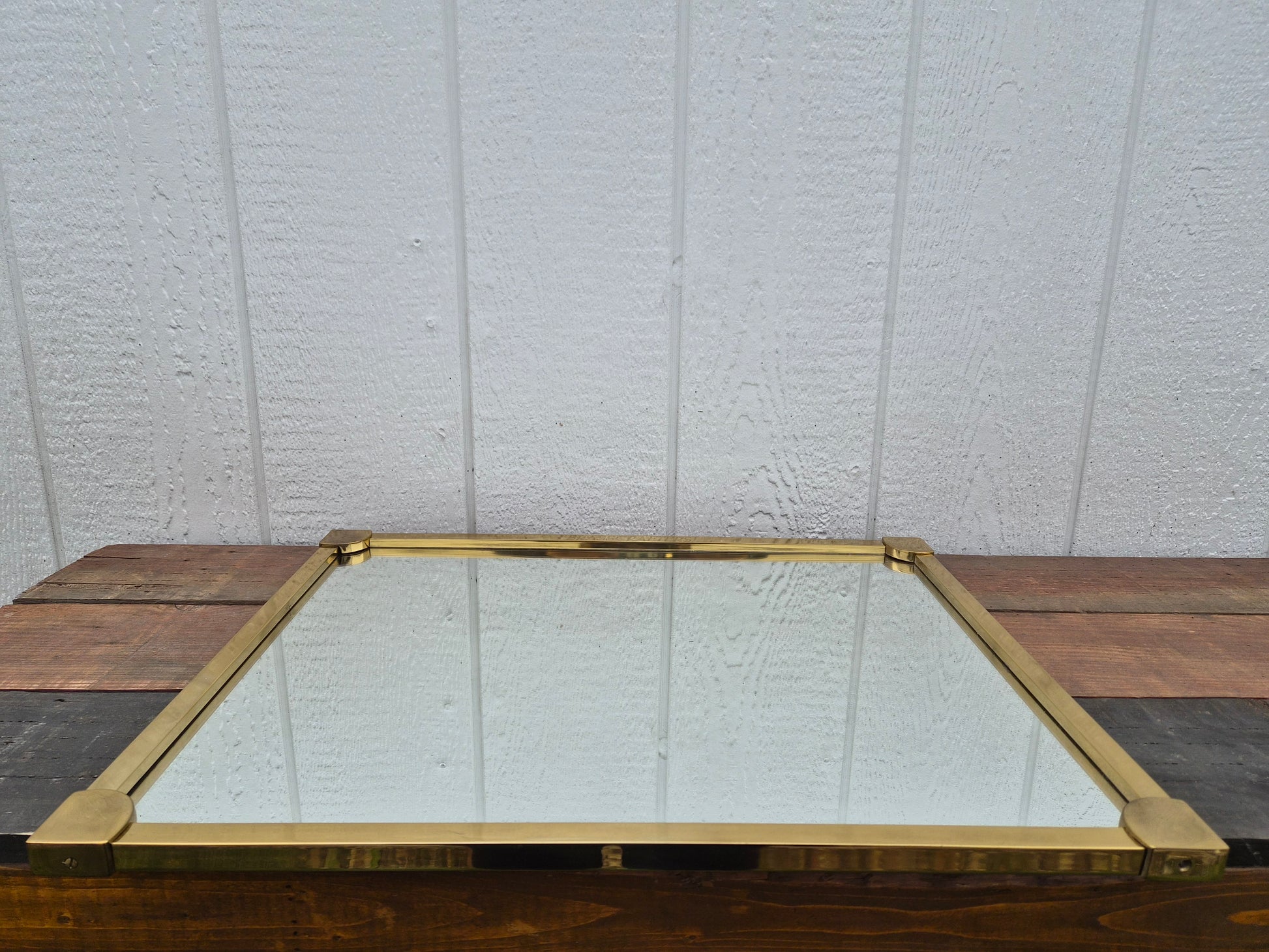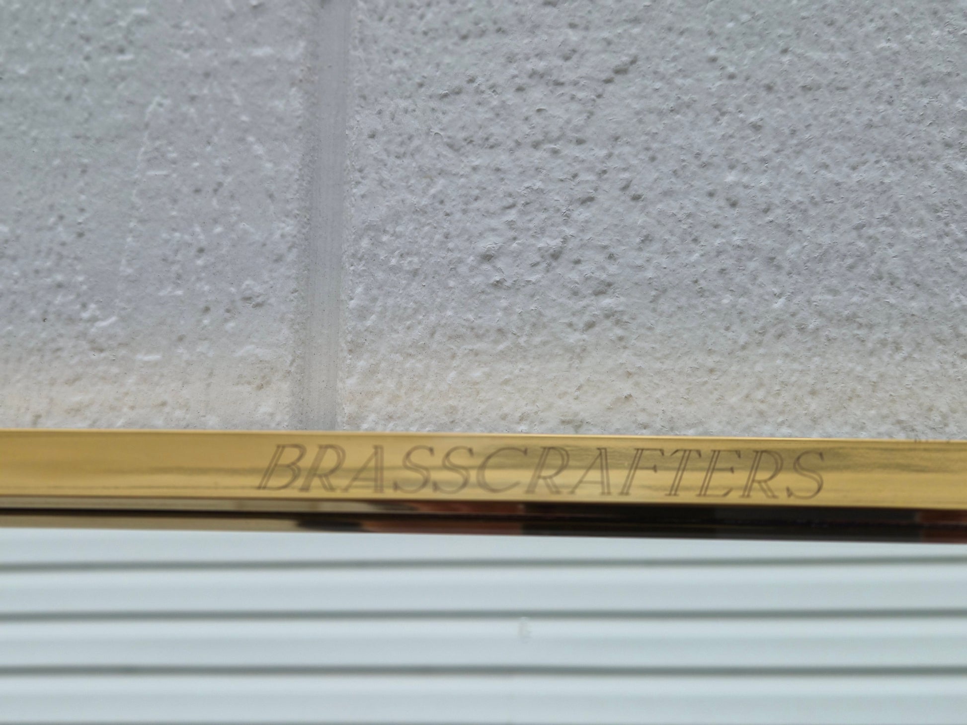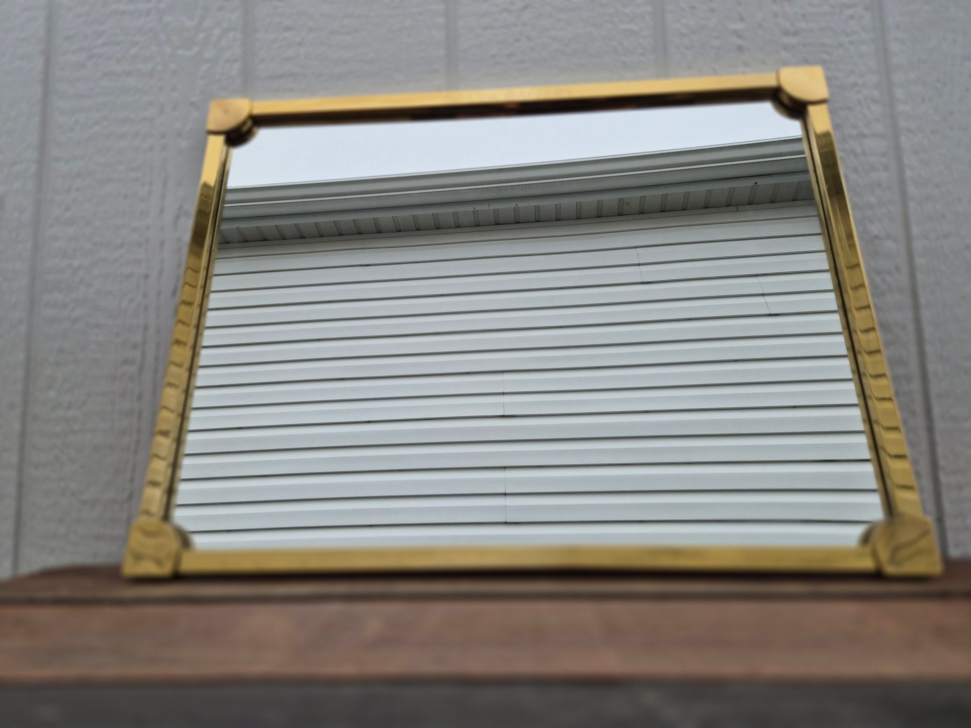 Fantastic deco brass framed mirror - signed Brasscrafters. Mirror can be positioned vertically or horizontally on the wall. Holes for hanging on back.