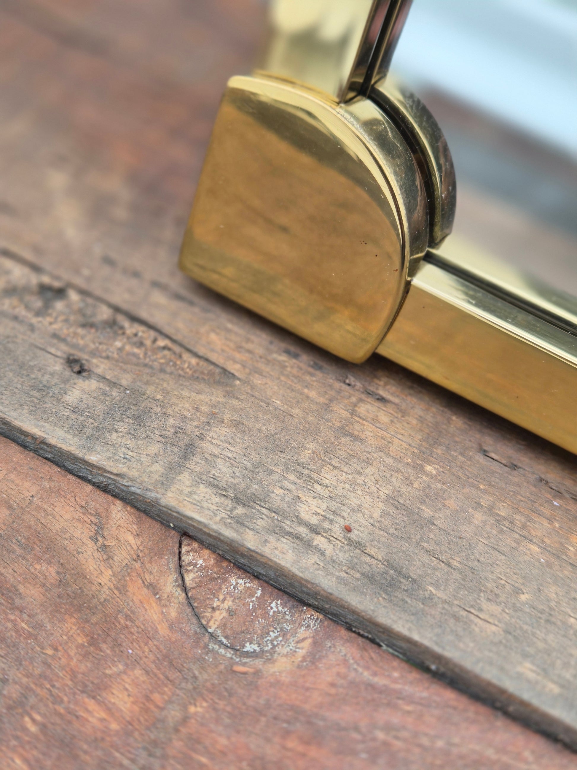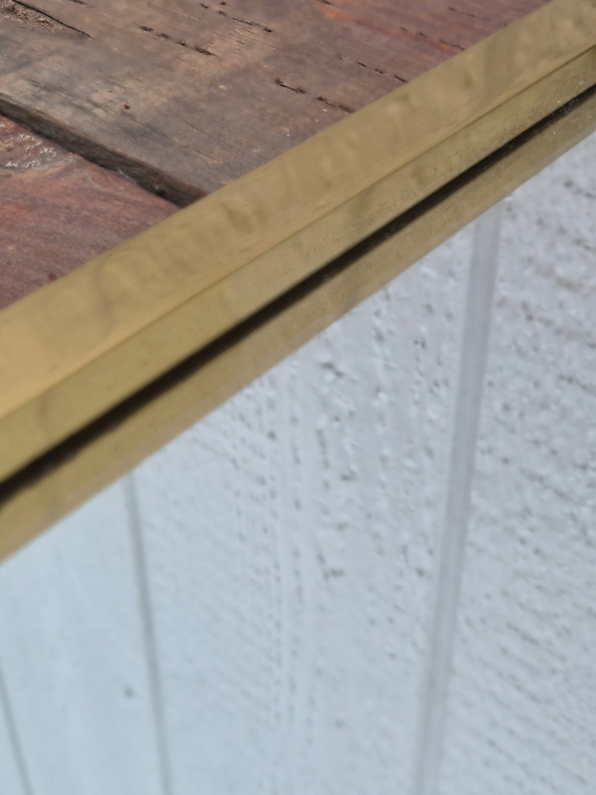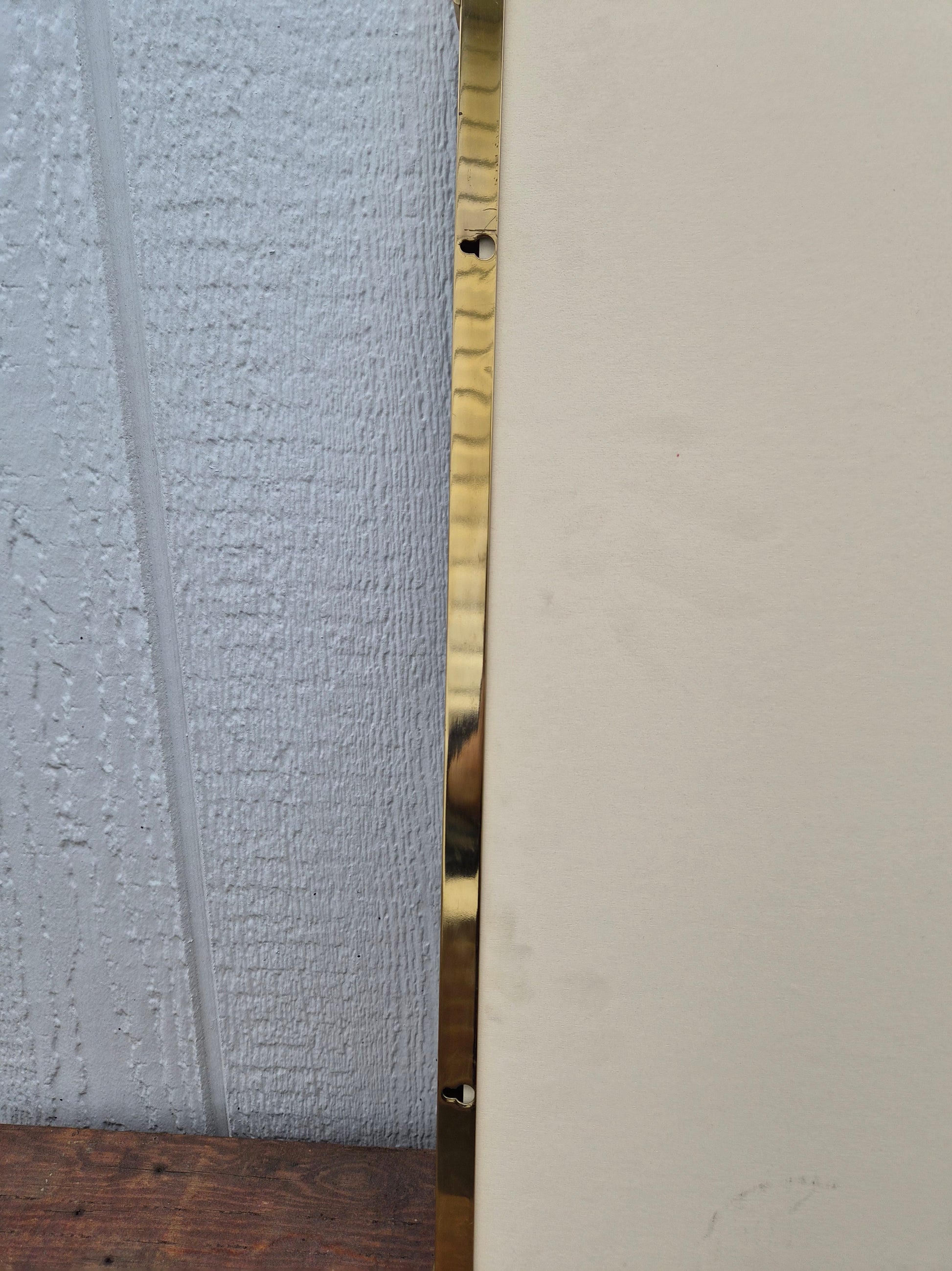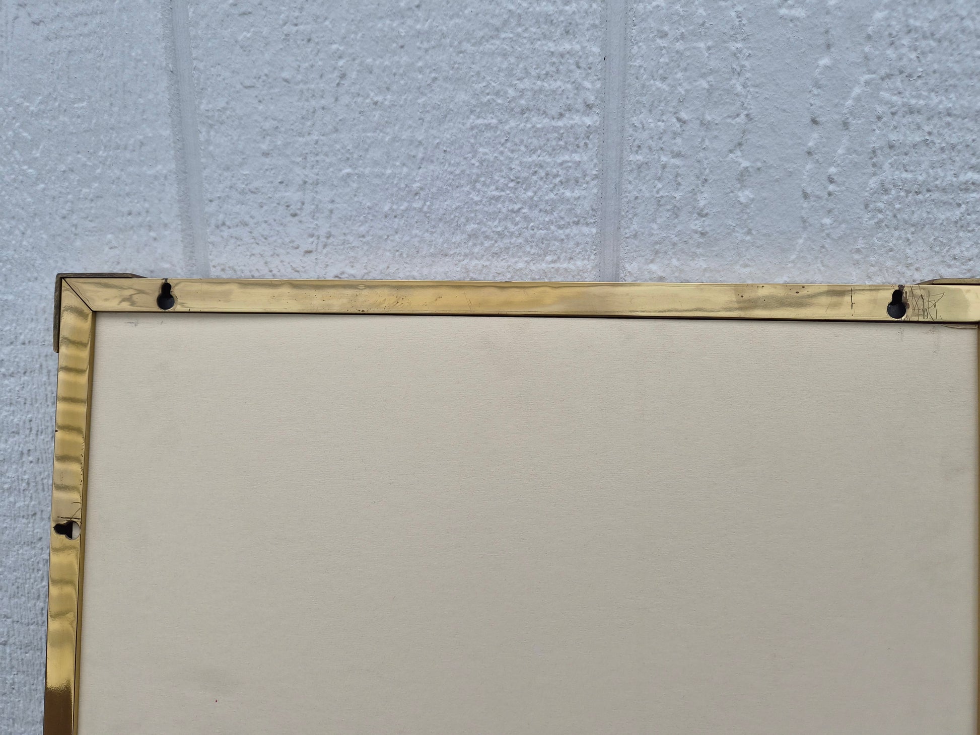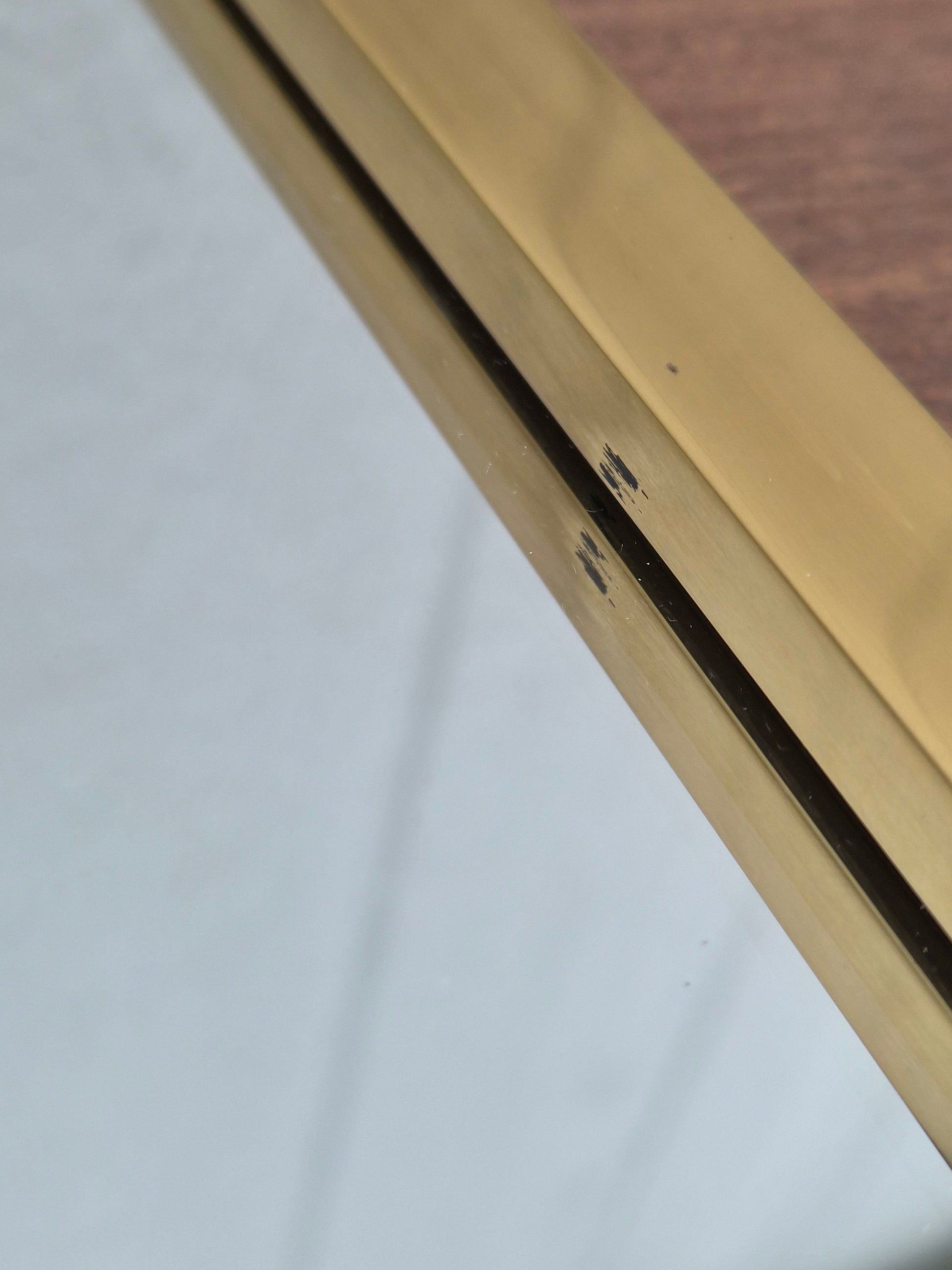 Fantastic deco brass framed mirror - signed Brasscrafters. Mirror can be positioned vertically or horizontally on the wall. Holes for hanging on back.