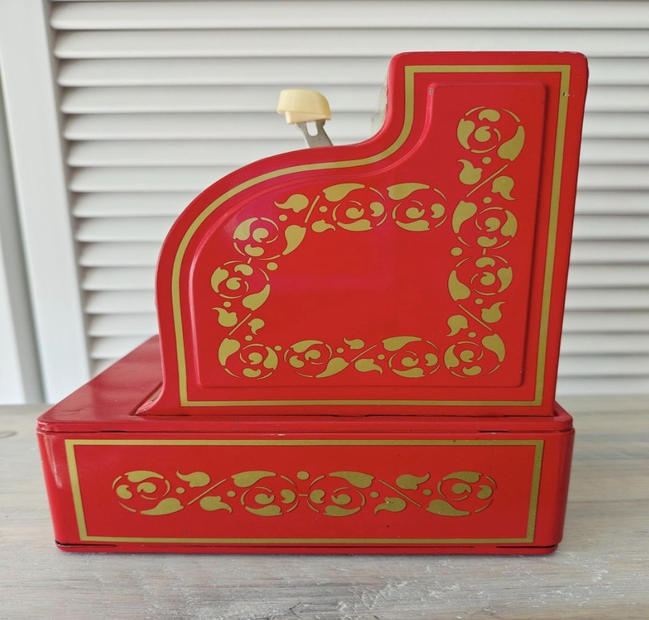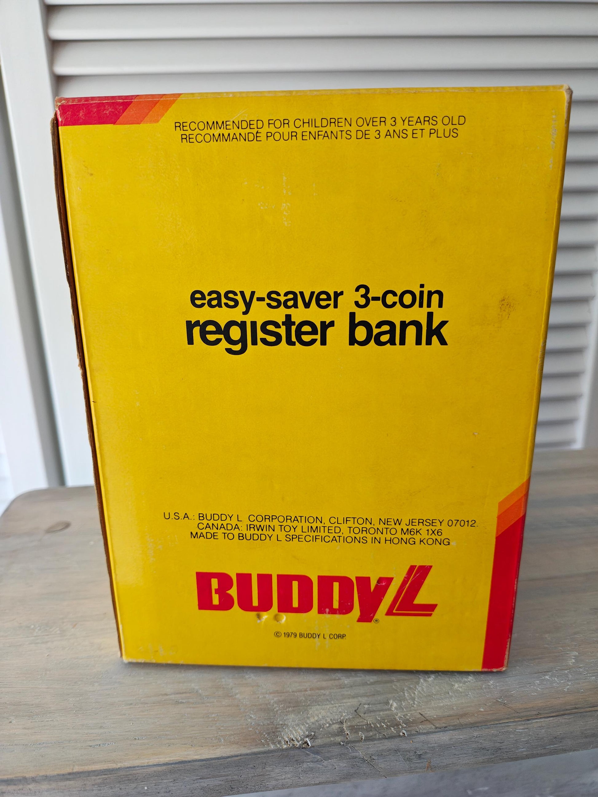 Vintage, Buddy L, Easy-Saver metal coin bank in fire engine red with gold accents - comes with box. The front easy-saver flap opens when counter reaches $20. Space on back for bills, too. Great birthday gift!