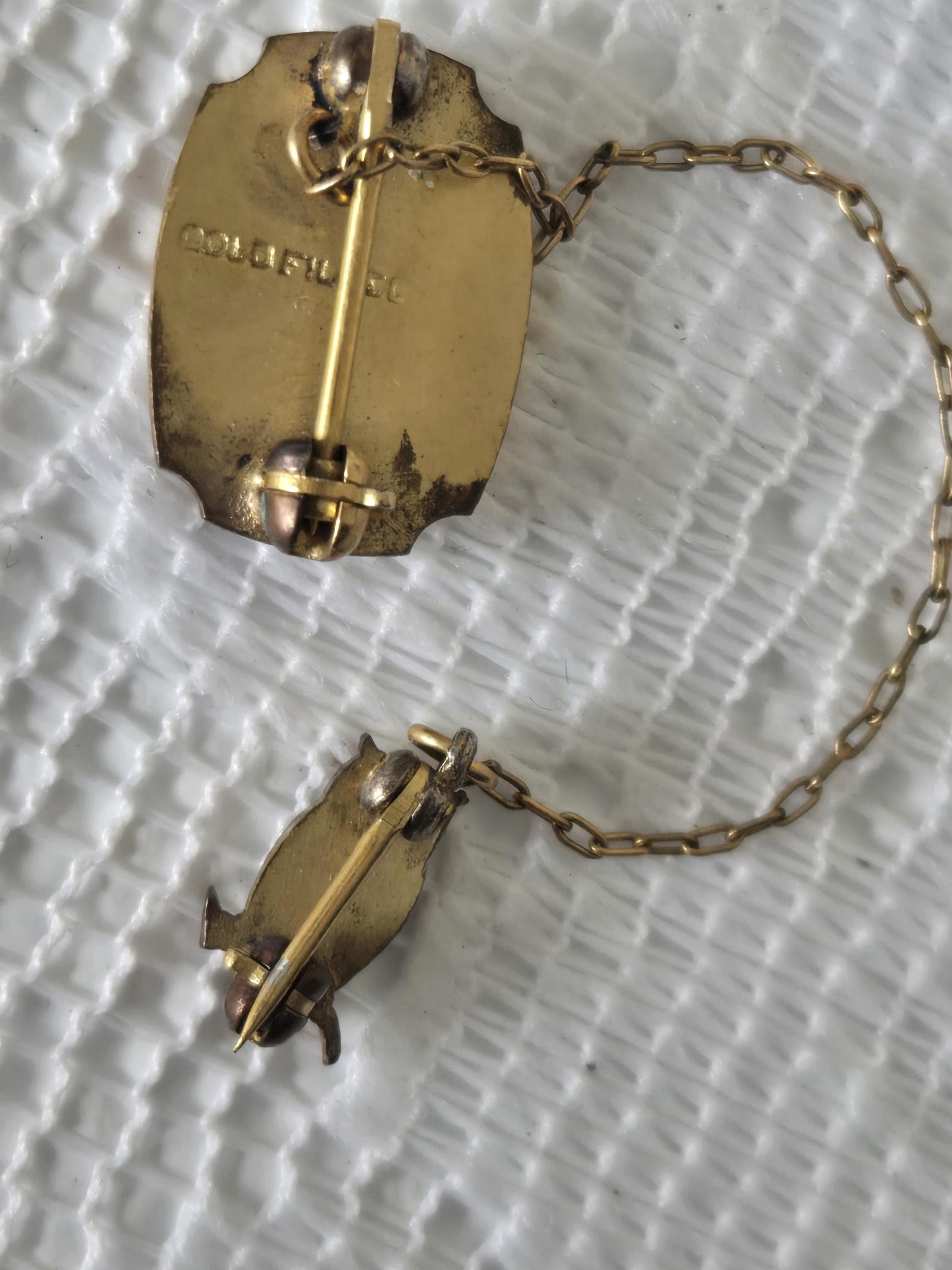 Vintage school dramatics (drama) class pin. Pin depicts 2 facial expressions, and has an attached owl with chain.