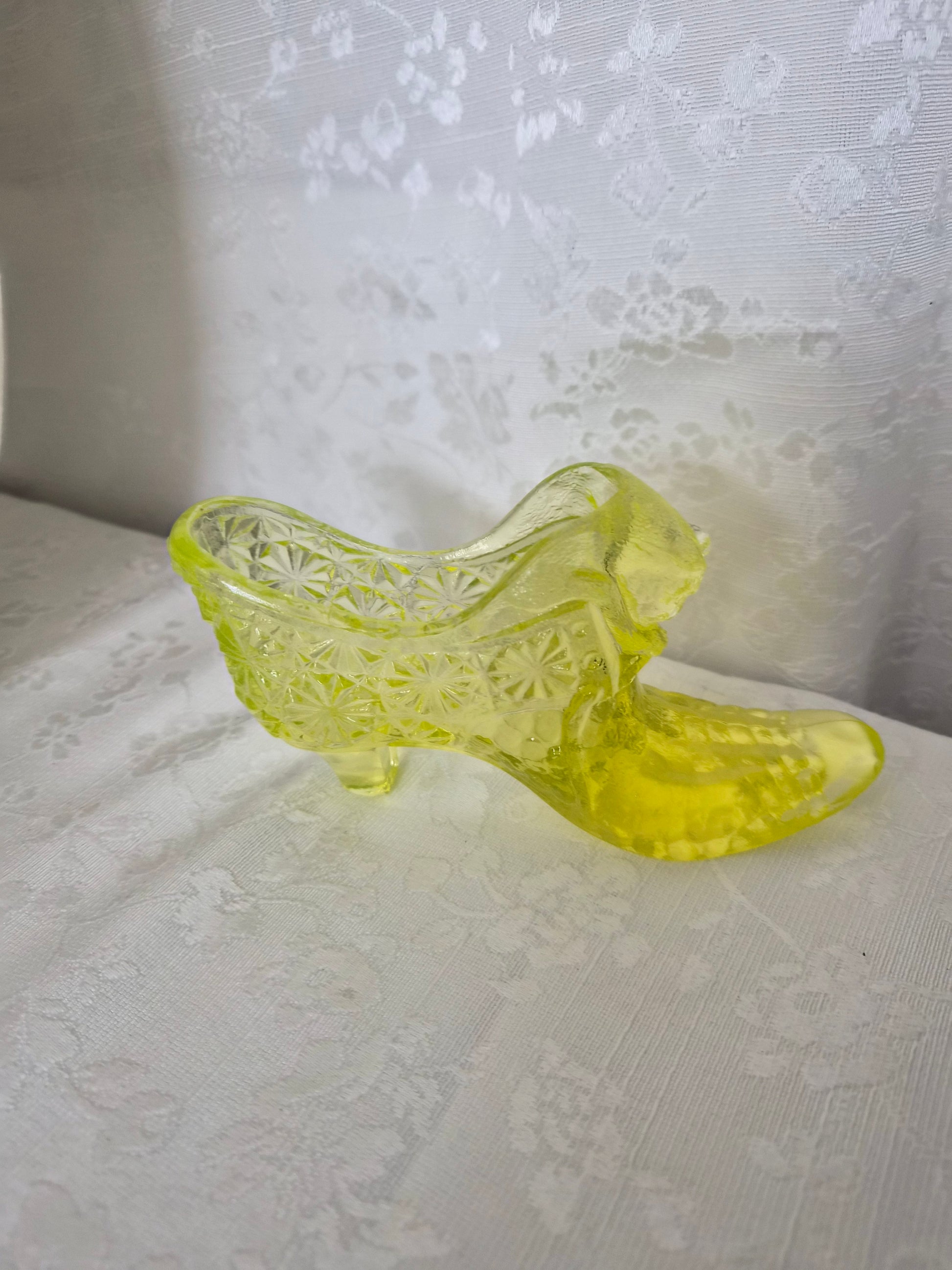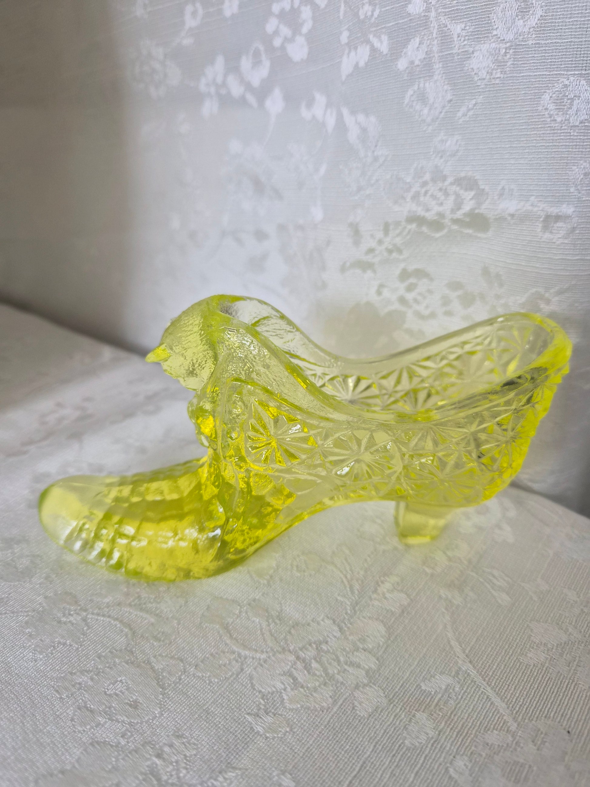 Fenton, yellow uranium glass shoe. Shoe has the daisy floral pattern with cat head.
