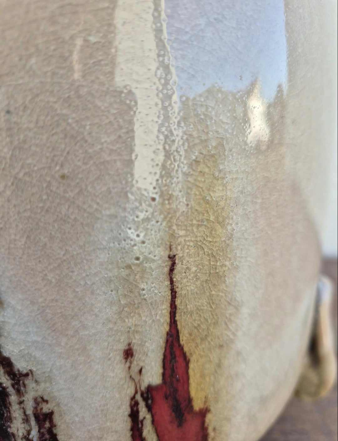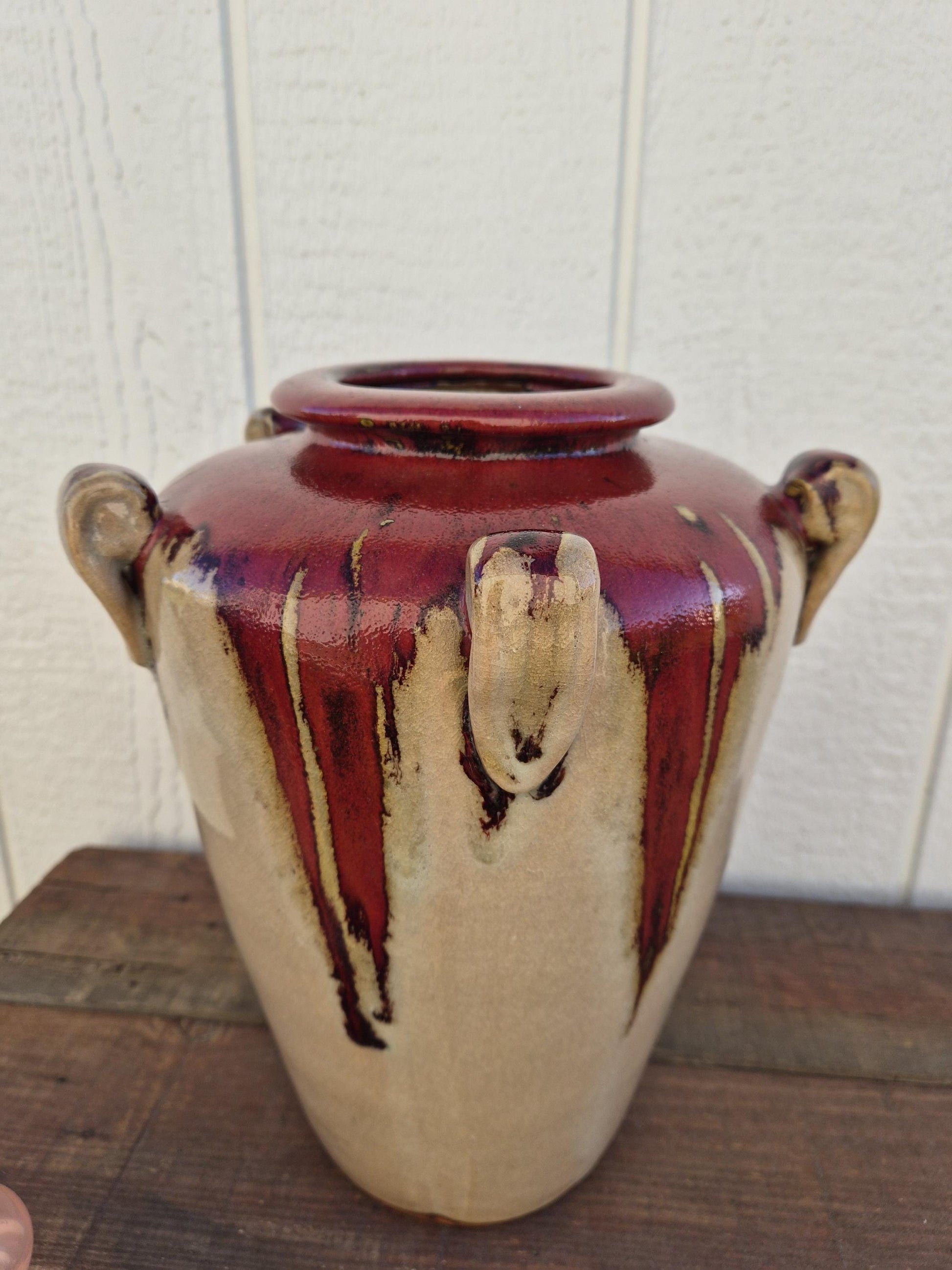 Great vintage urn style glazed pottery vase. Vase has a flame drip affect and 5 scroll-like accent handles.