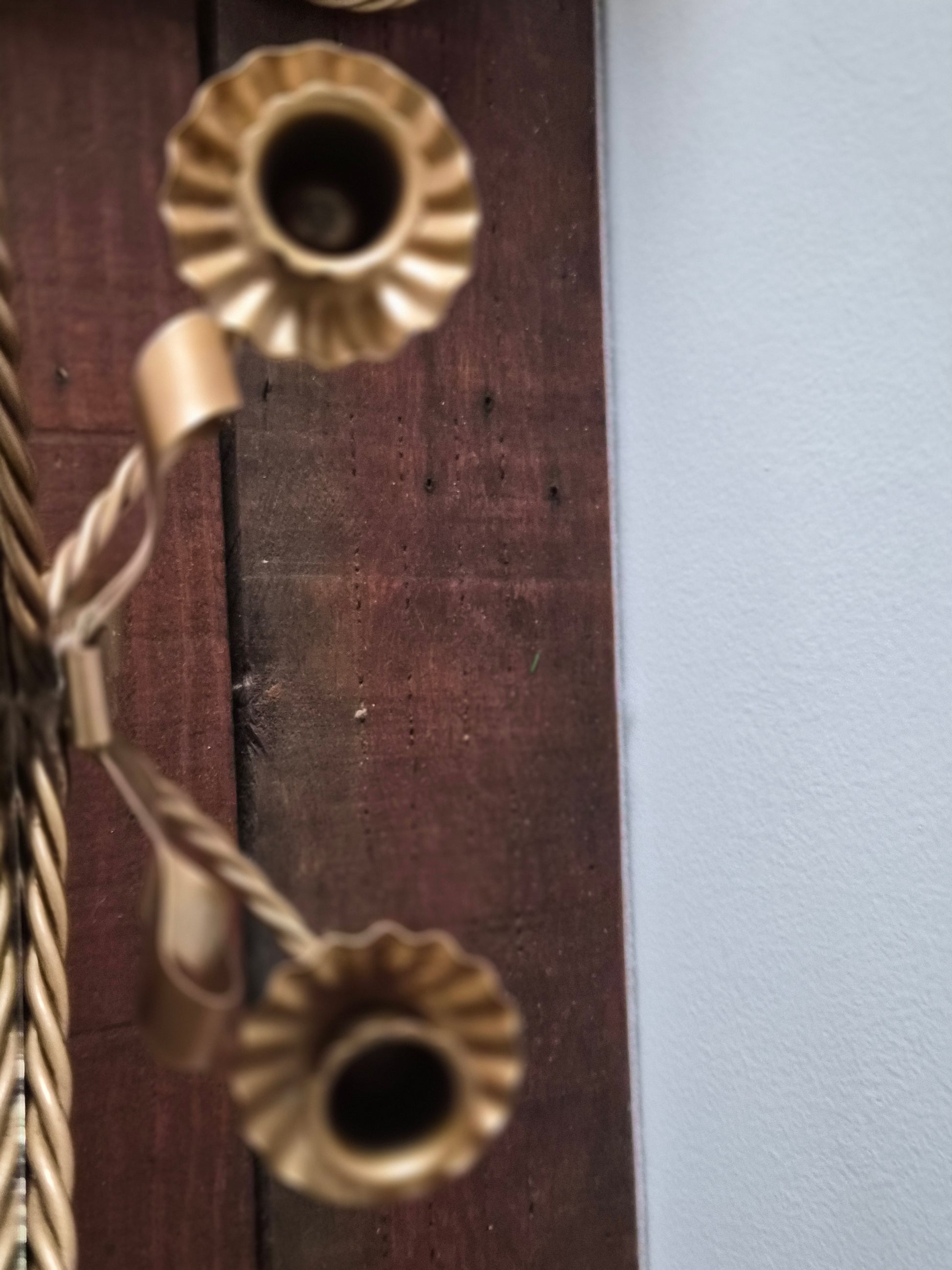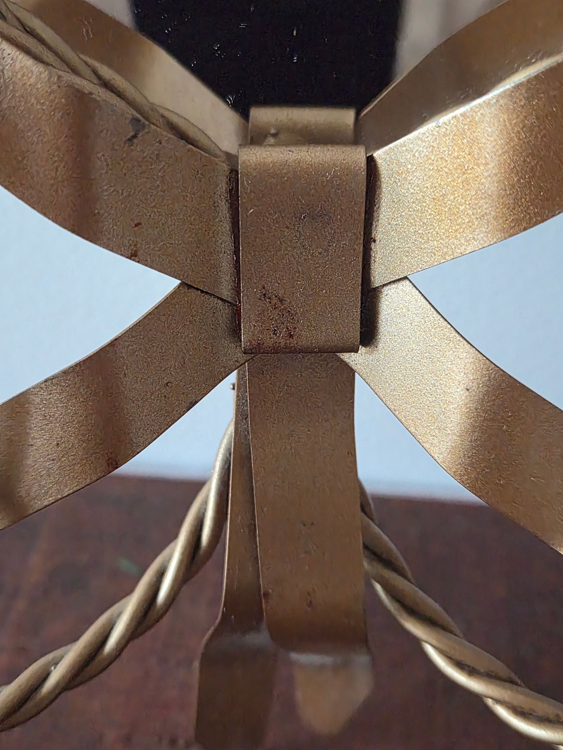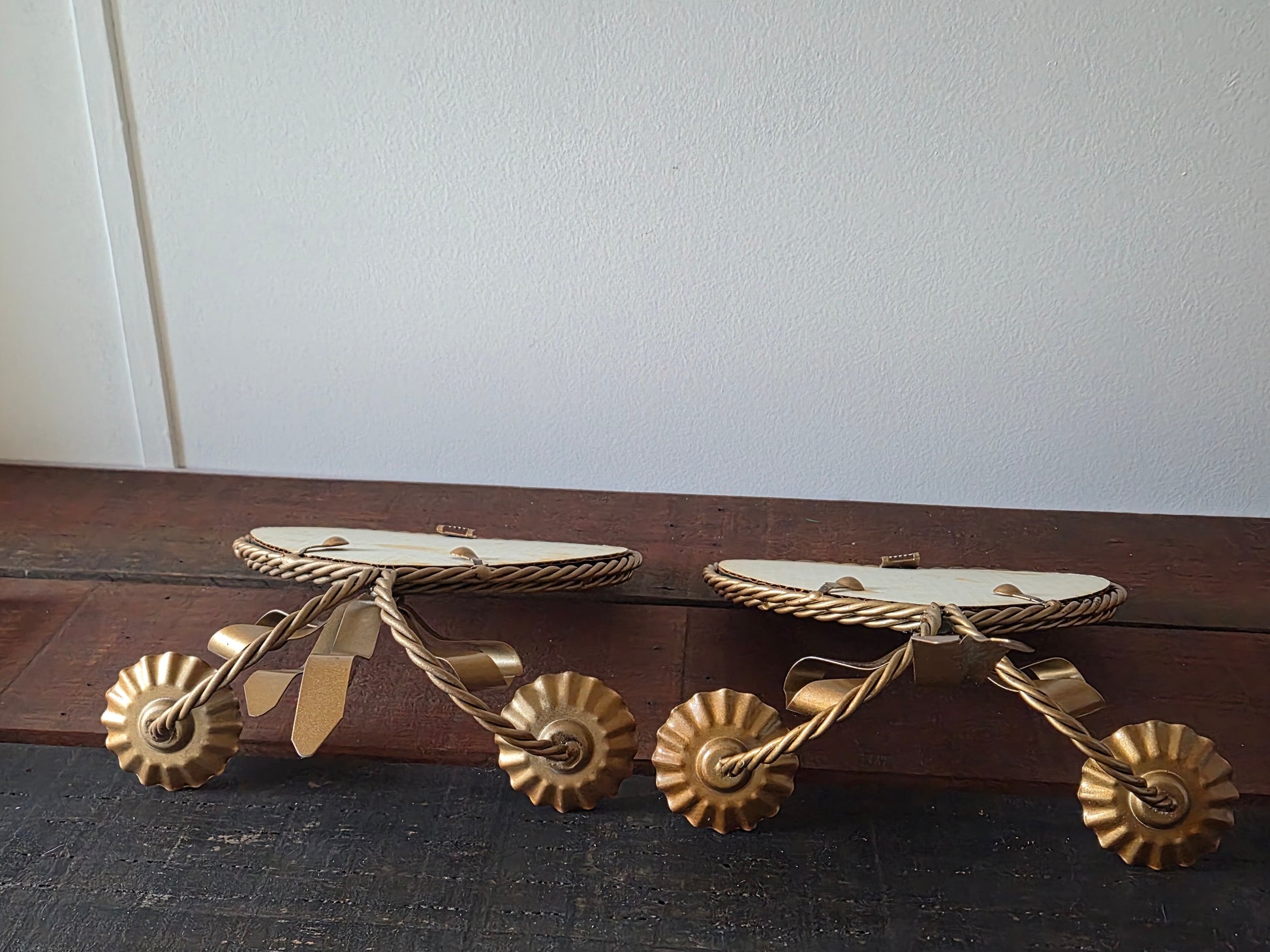 Pair of twist and ribbon golden painted metal wall sconces. Each heart-shaped mirror sconce has room to add 2 candles. Nice hallway decor!