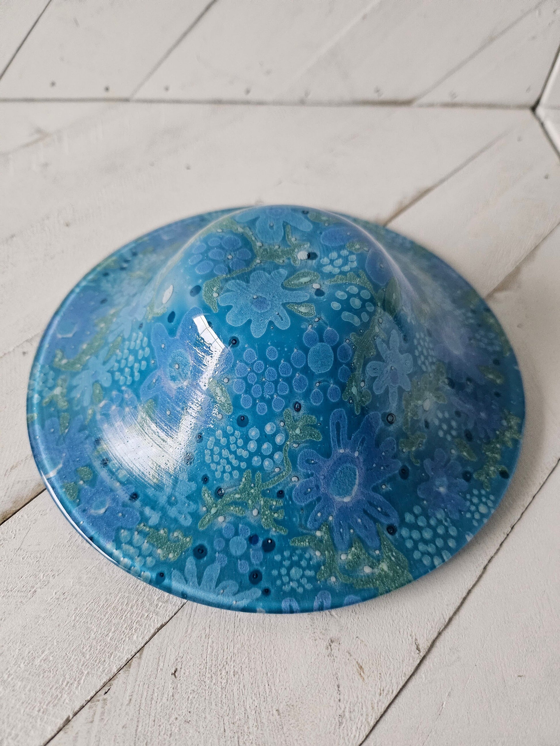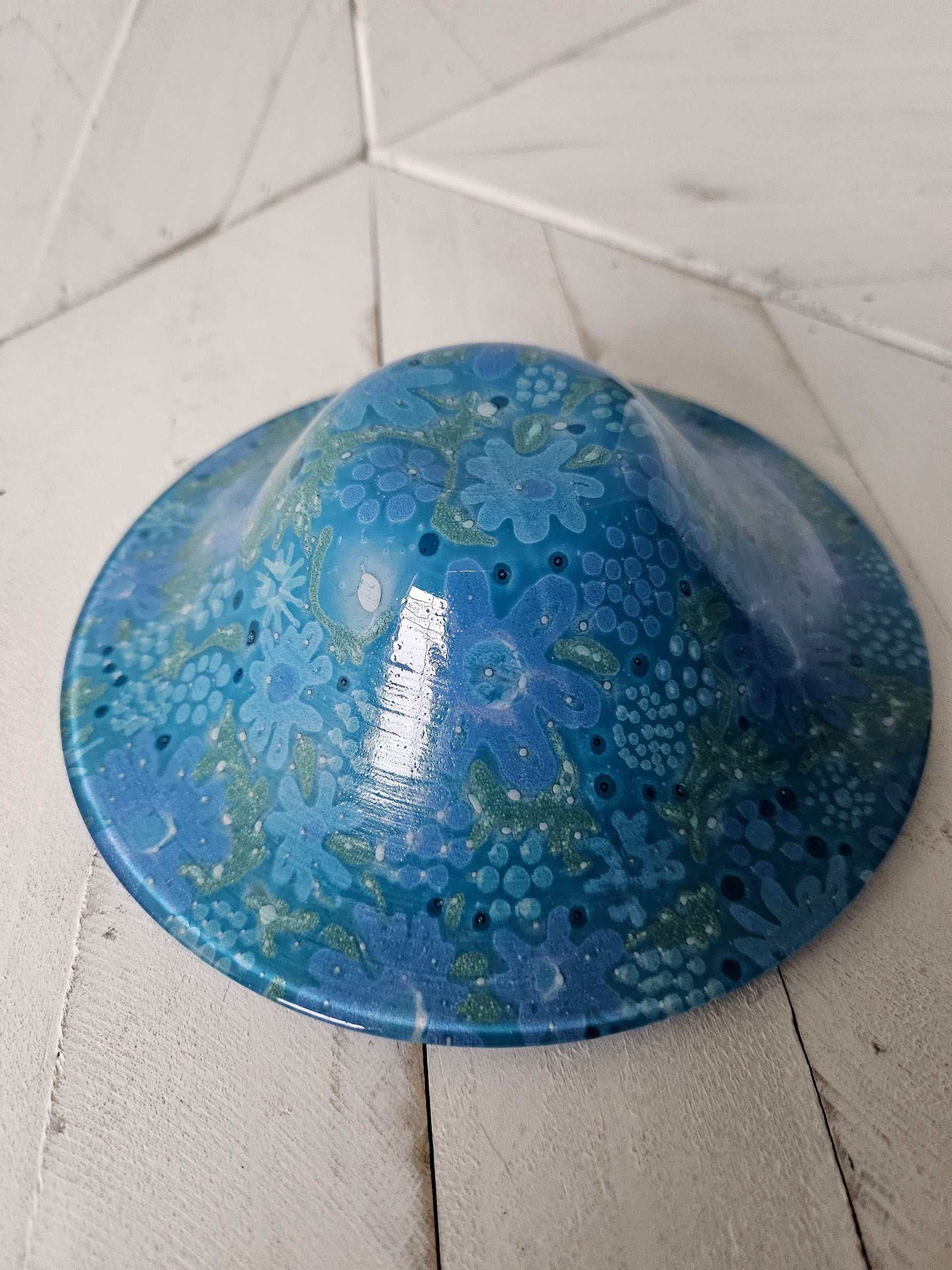 Gorgeous signed blue floral art glass bowl by Higgens.
