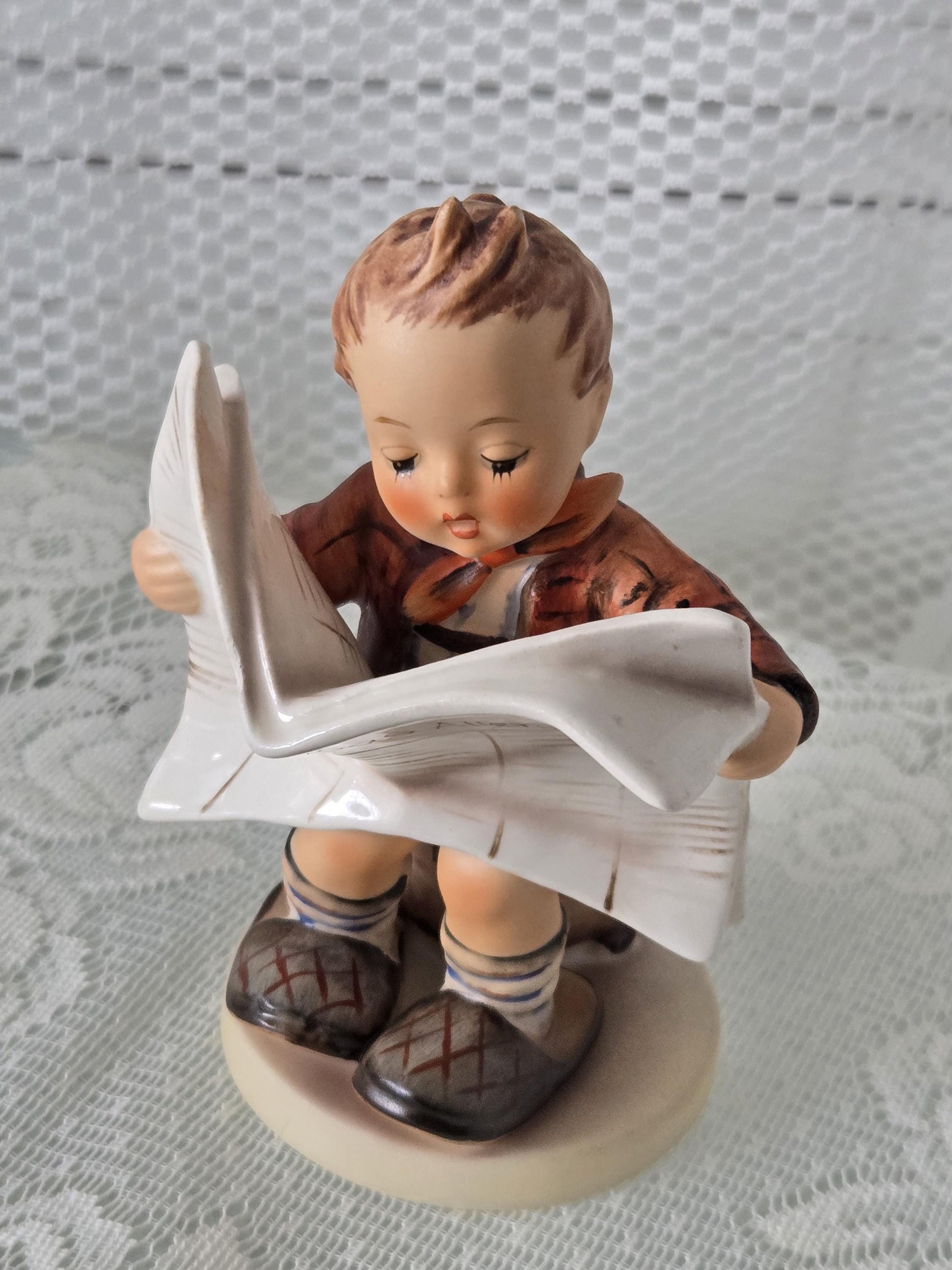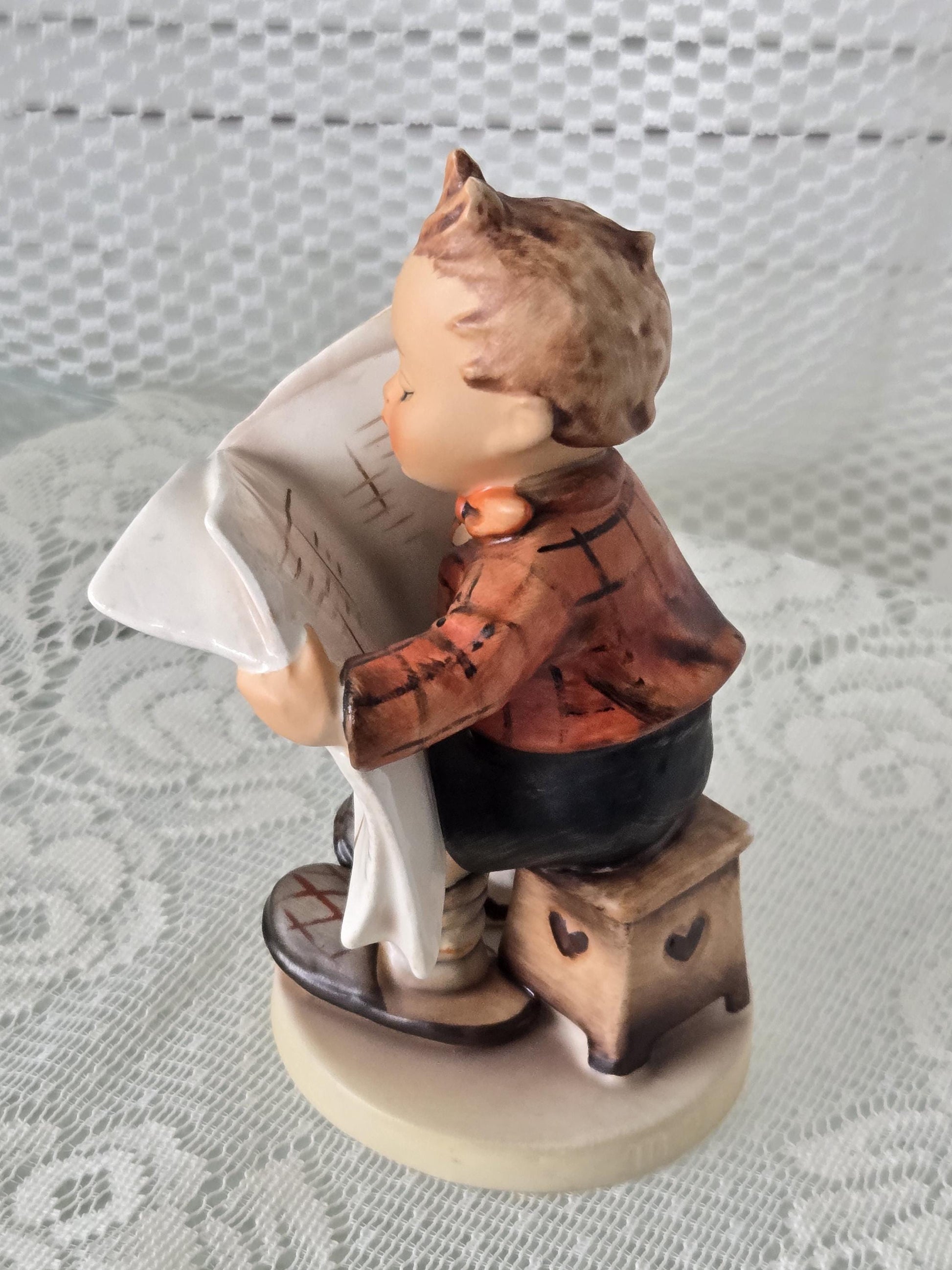 Super cute, vintage 1978 Hummel Latest News, TMK5 - boy on box reading the Das Allerneueste newspaper...
