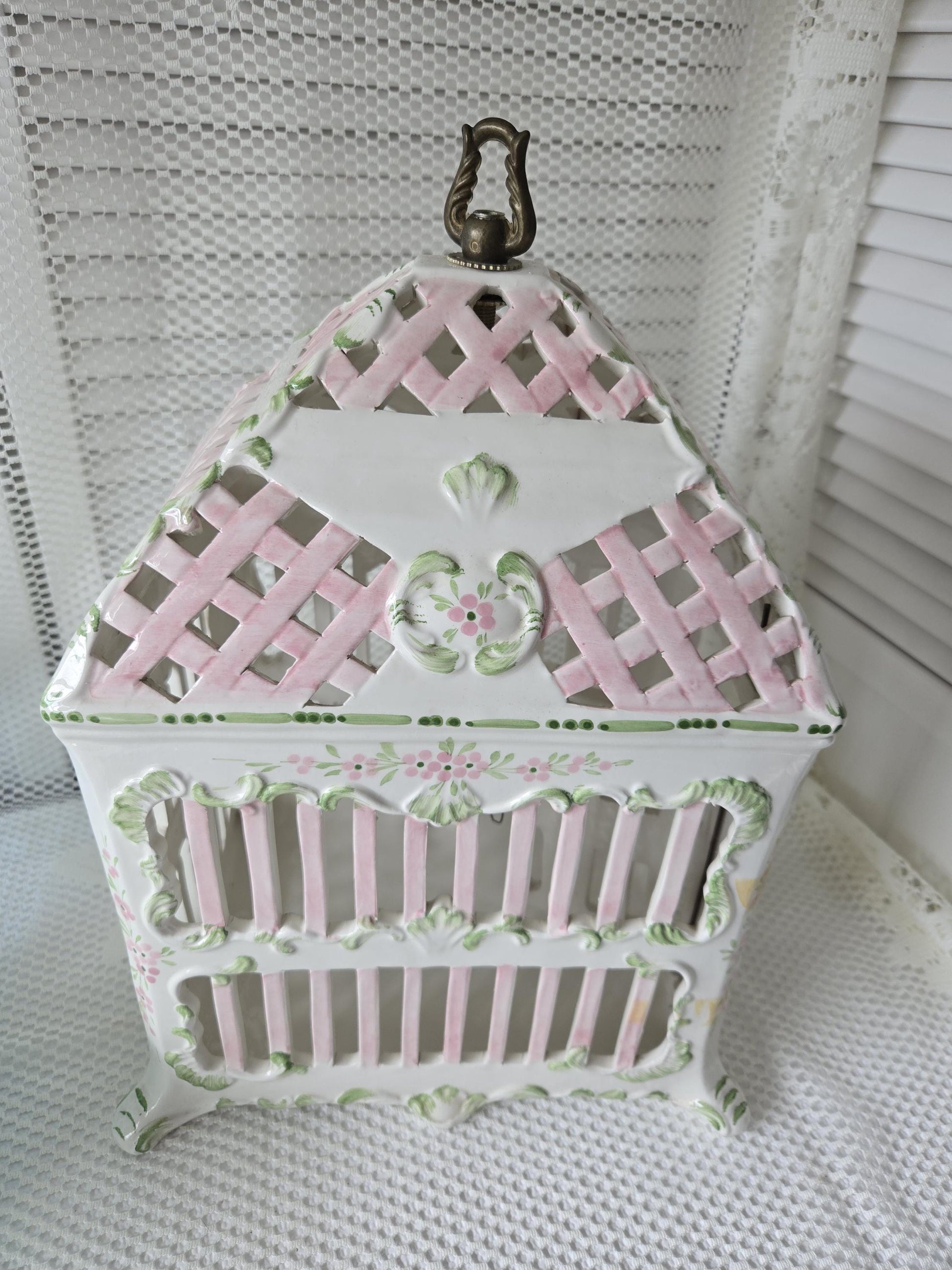 Gorgeous, Italian made ceramic architectural birdhouse with antiqued brass hanging bail. Birdhouse is white with pastel hues of pink and green, and is complete with a tiny door.