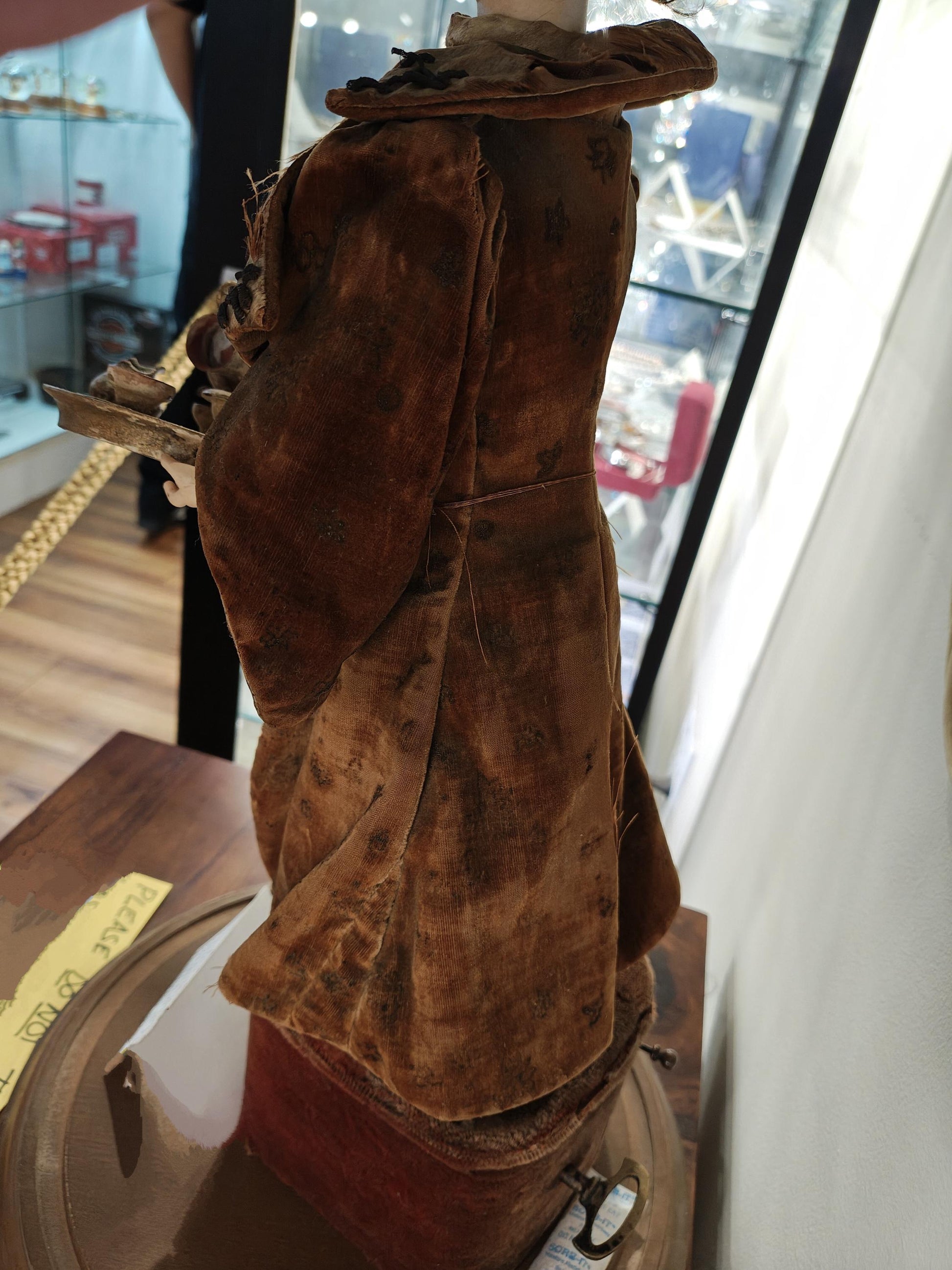 Chinese Automaton tea lady, circa late 1800's dressed in period velvet clothing. She has bisque face and hands, and real hair with fan adornment, and she comes with an equally rare glass domed display to keep her safe!.