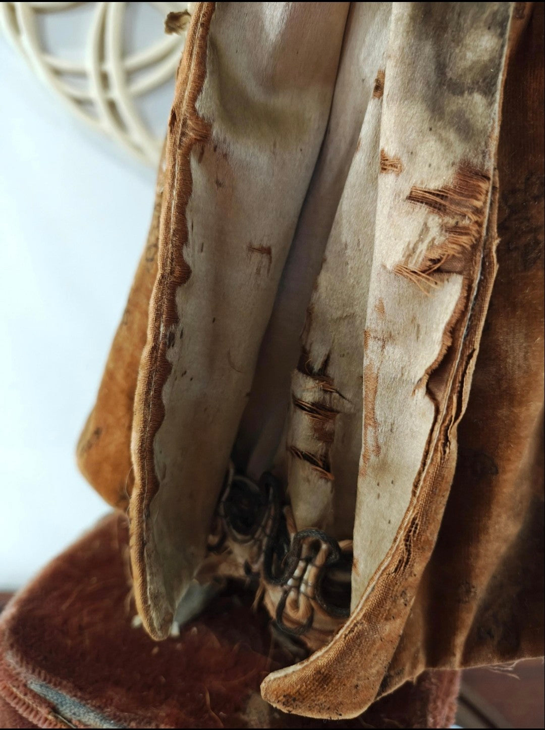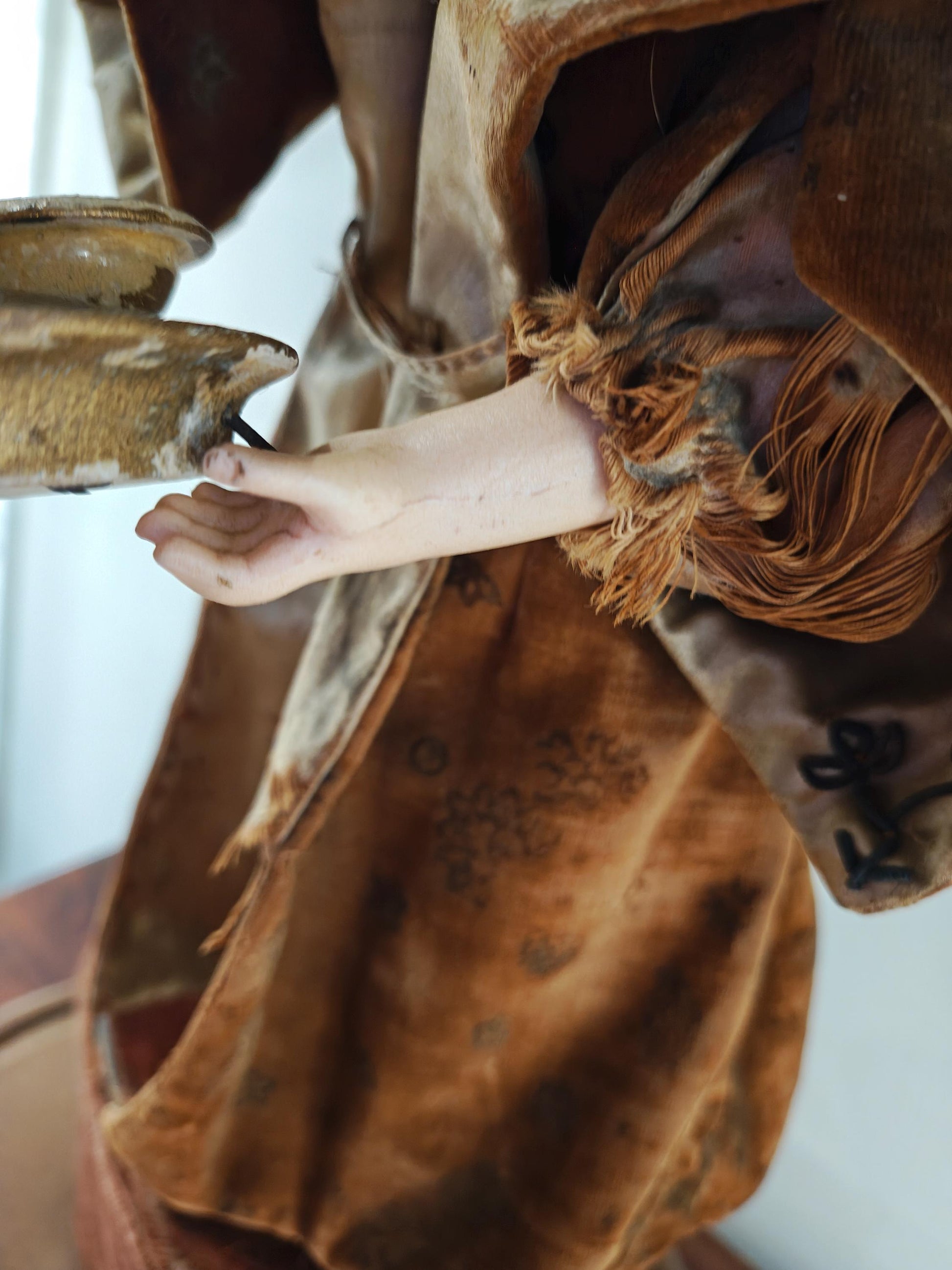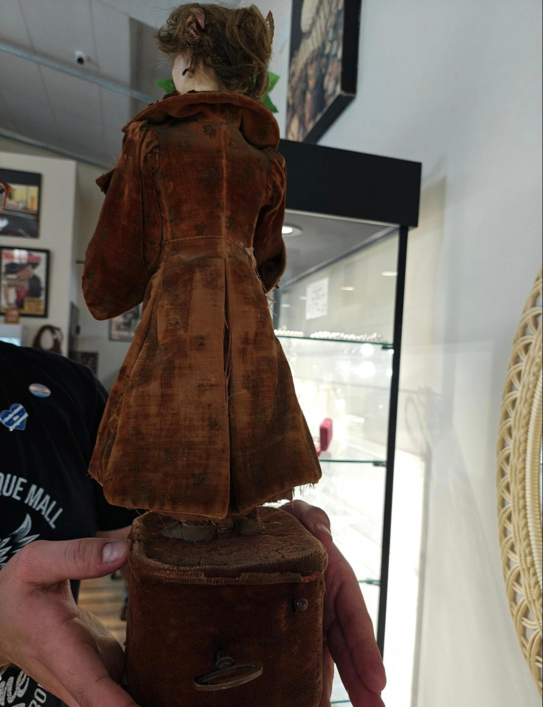 Condition is good for it's age. Automaton works well, it can be viewed in the link below. Clothing fabric shows typical wear consistent with its age, such as fraying, and some tears, and stains. Arm shows a possible hairline crack, not deep. Some hand bisque wear, too. Hair needs a little riding up.