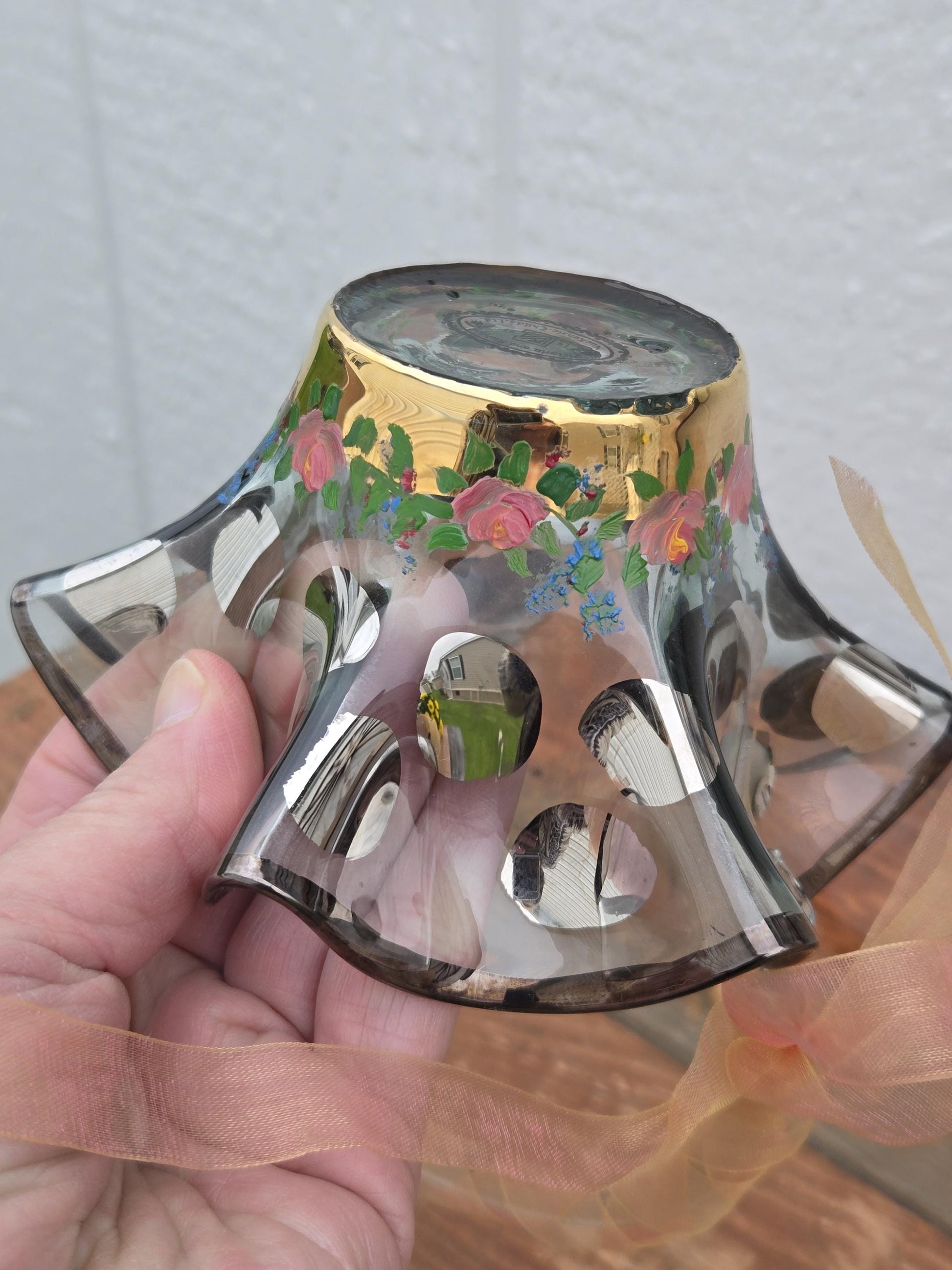 Sweet, vintage MacKenzie-Childs glass basket with unique floral, gold, and black accents. Perfect for decor, cut flowers, and gifting.