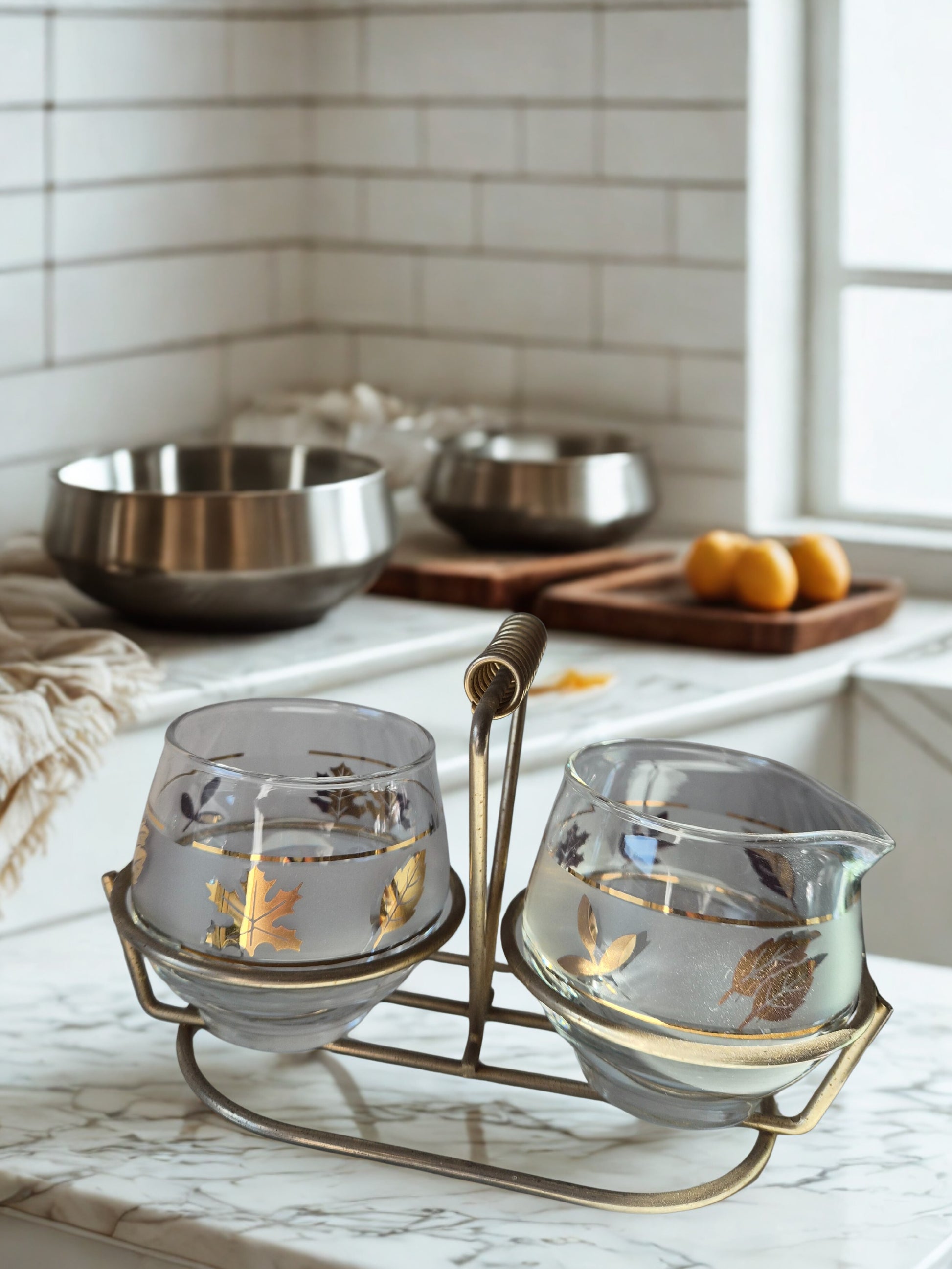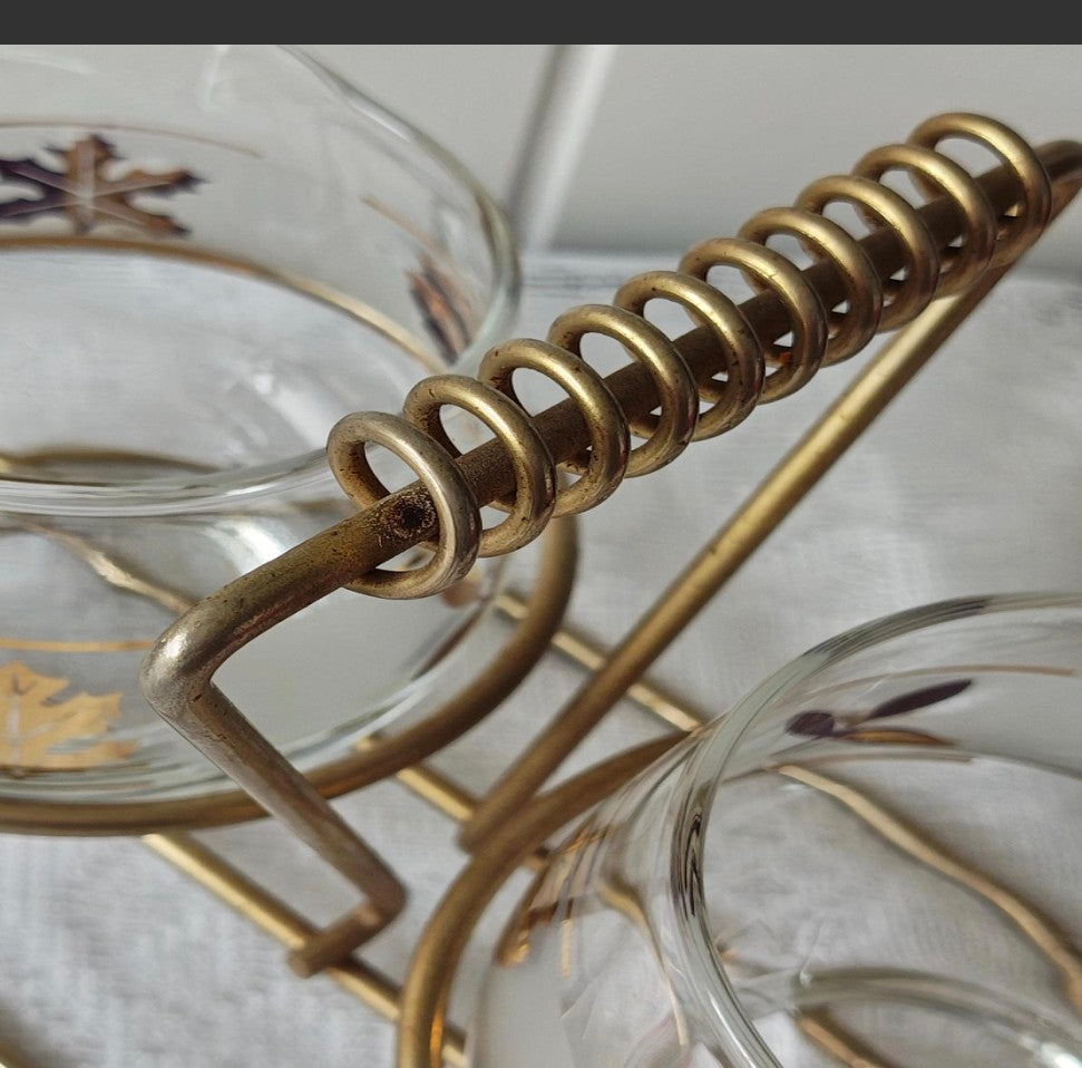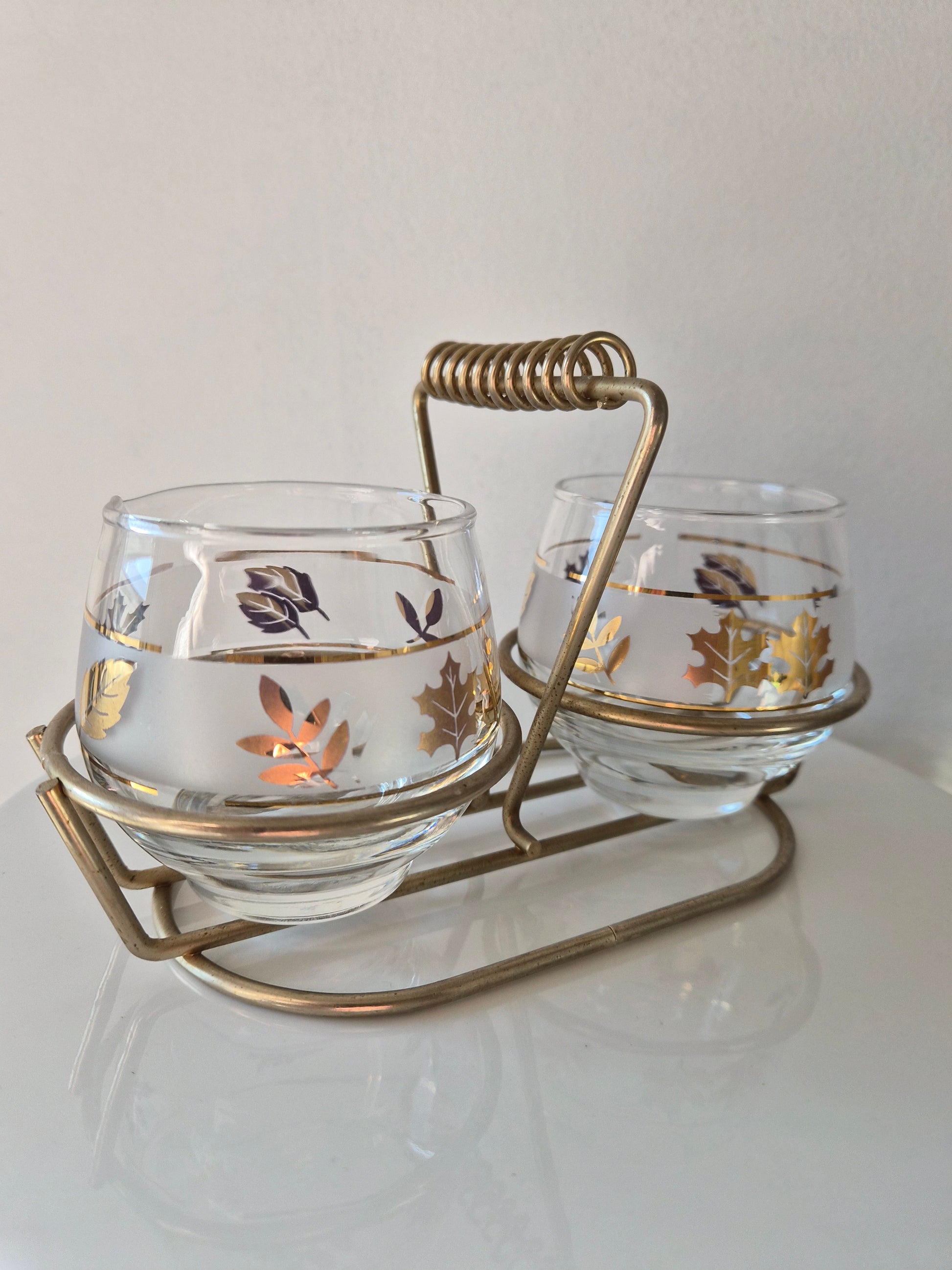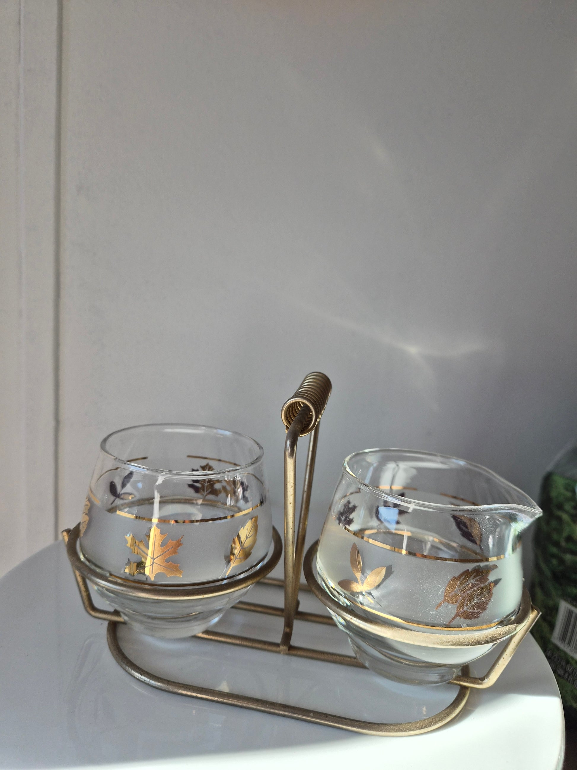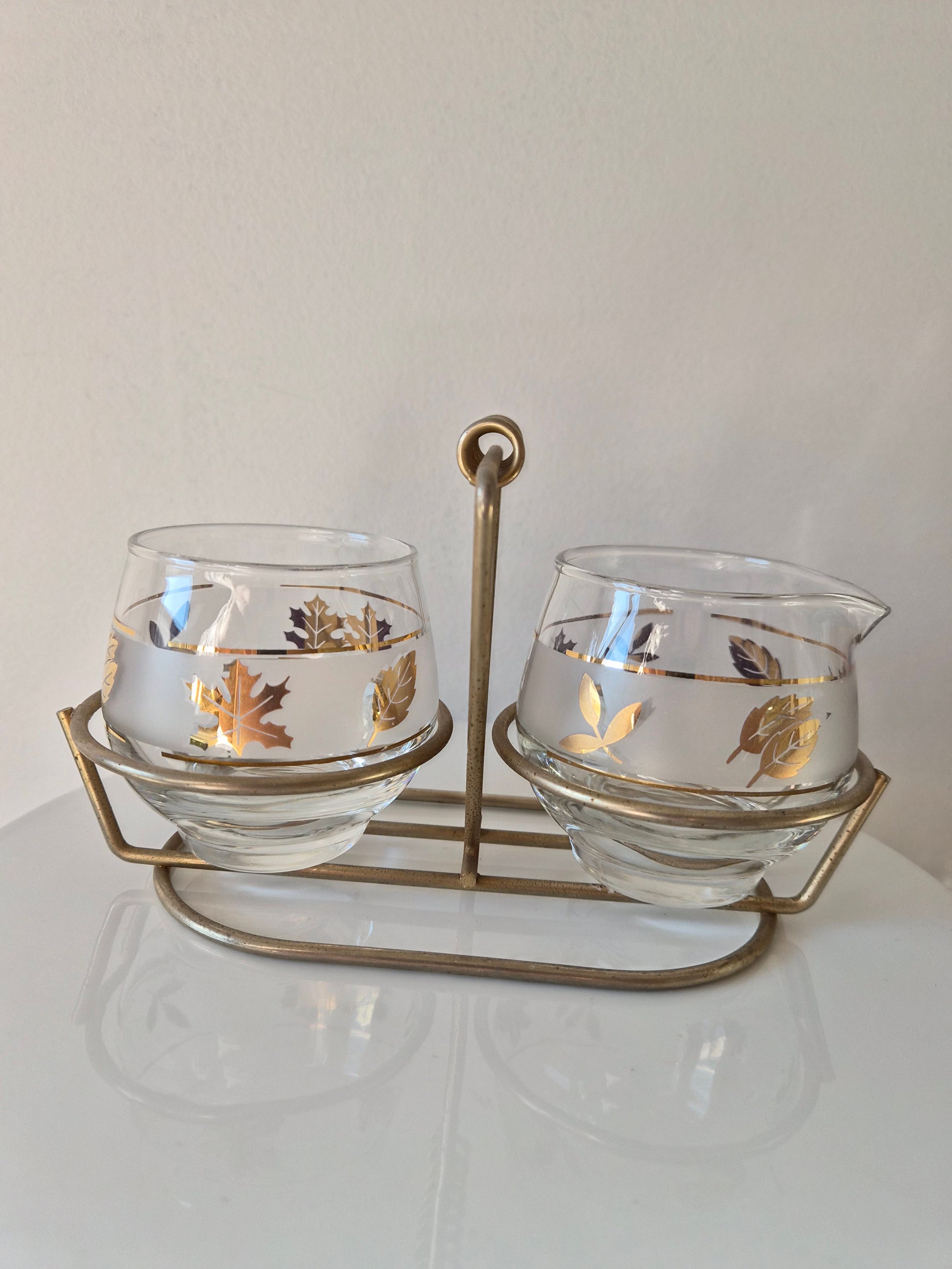 Set features a gold leaf frosted motif sugar and creamer with spout. Comes with its looped handle gold-tone metal caddy.