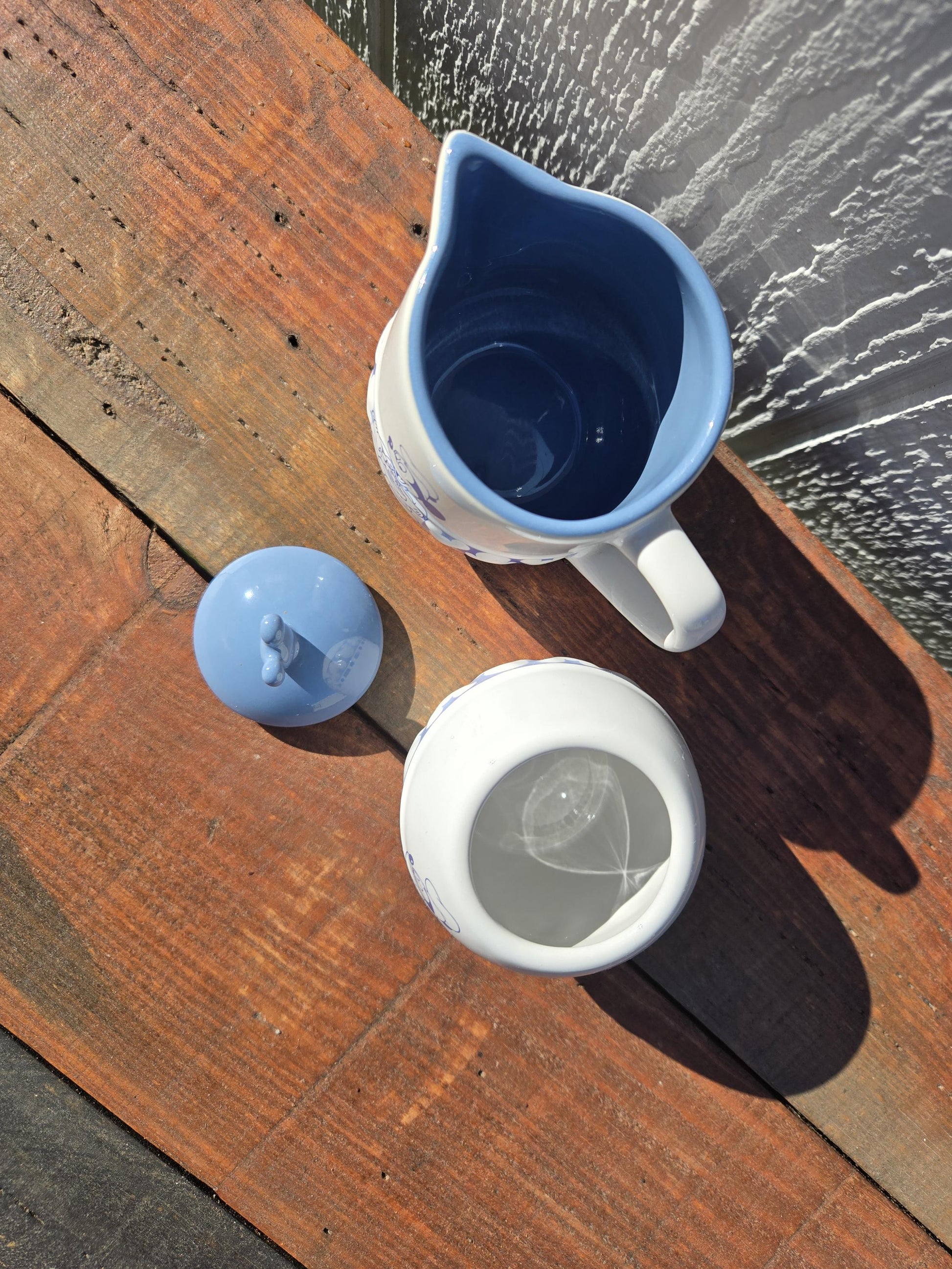 Vintage Original Disney Theme Park Mickey Mouse white w/blue accents ceramic sugar w/ear lid, and creamer set - made in Thailand.