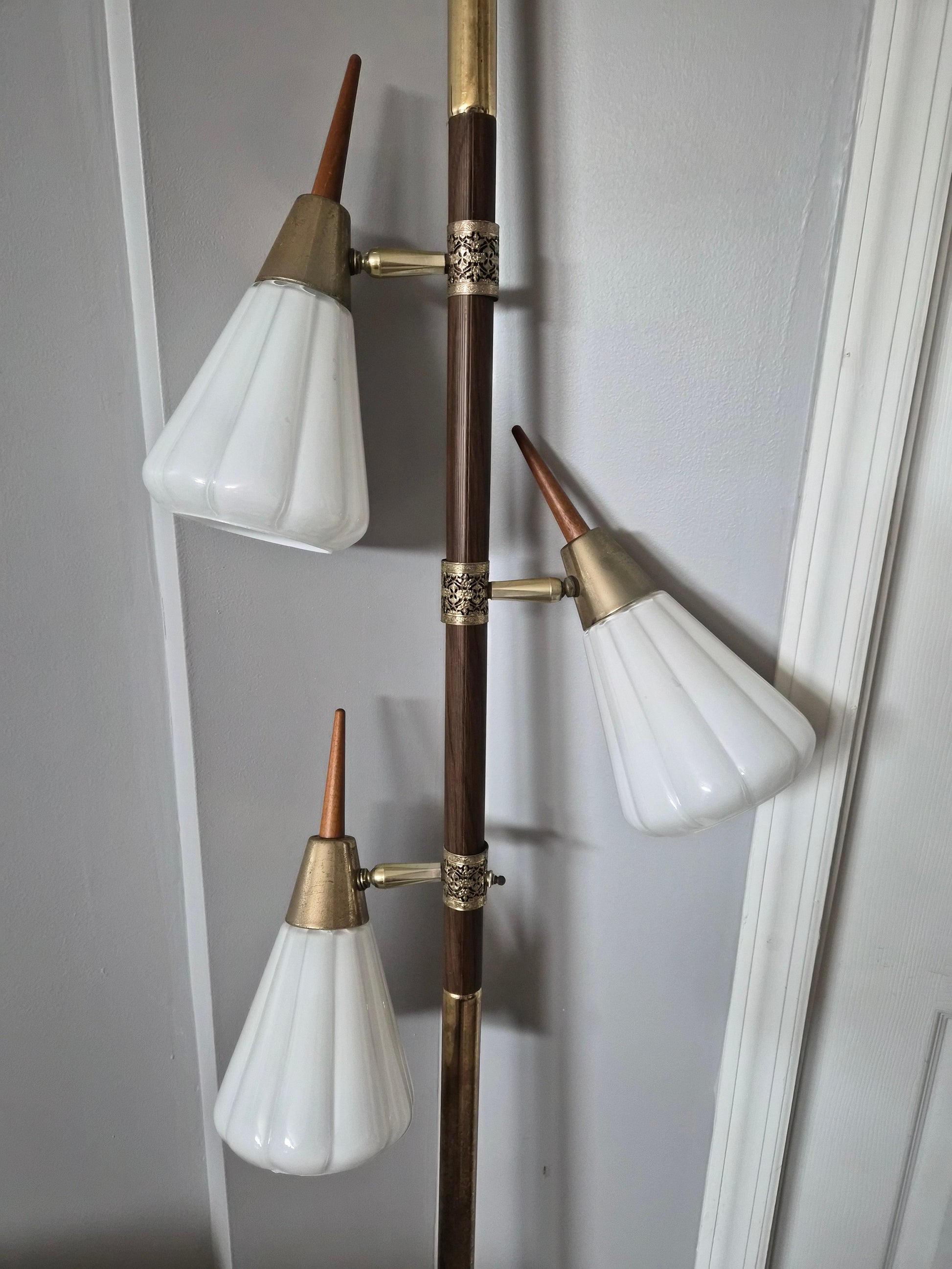Great Mid Century tension pole lamp. Lamp has 3 independent lights with glass shades and wood finials. Each lamp can light up separately, in a pair, or all 3 can light at once, from a single twist switch.