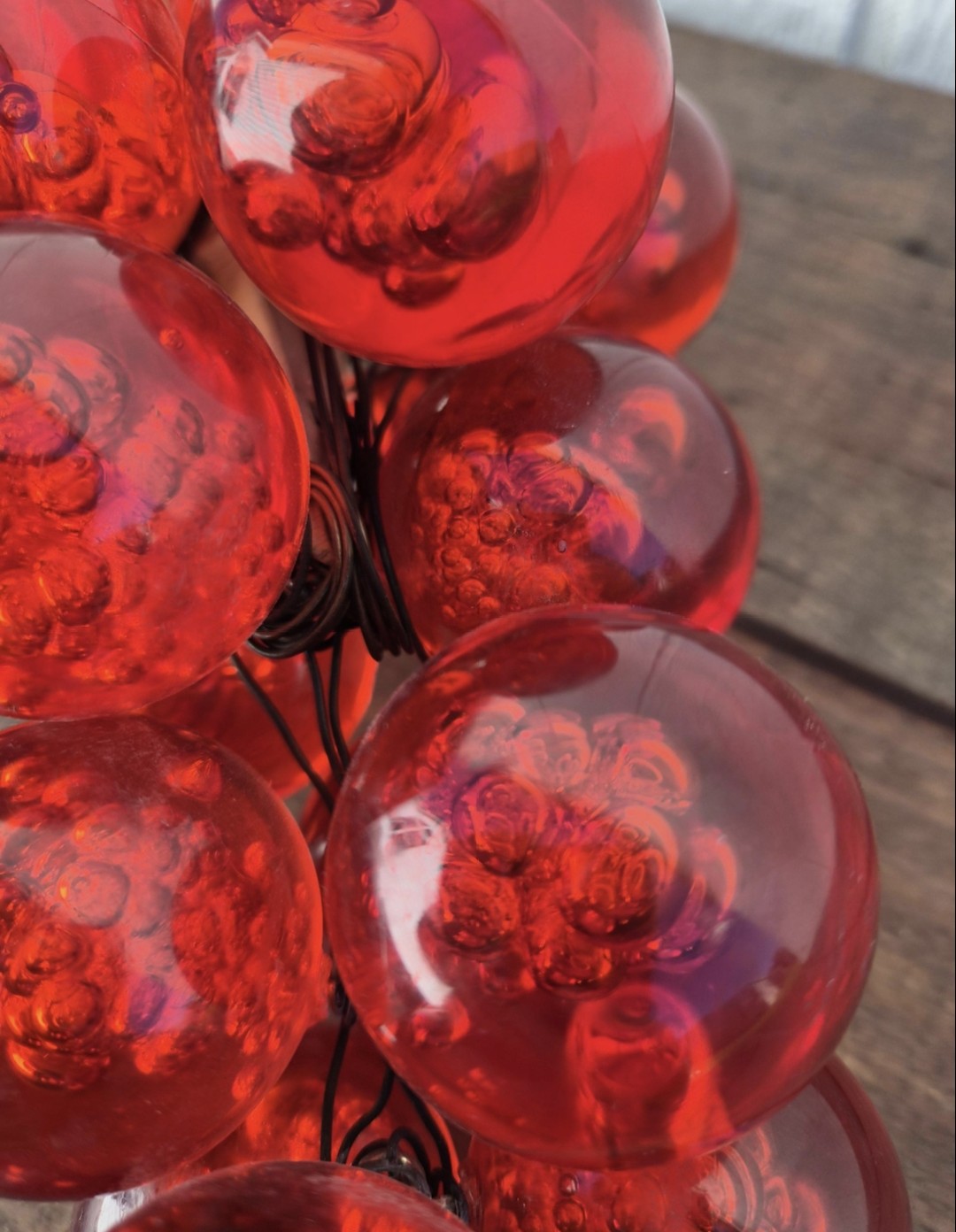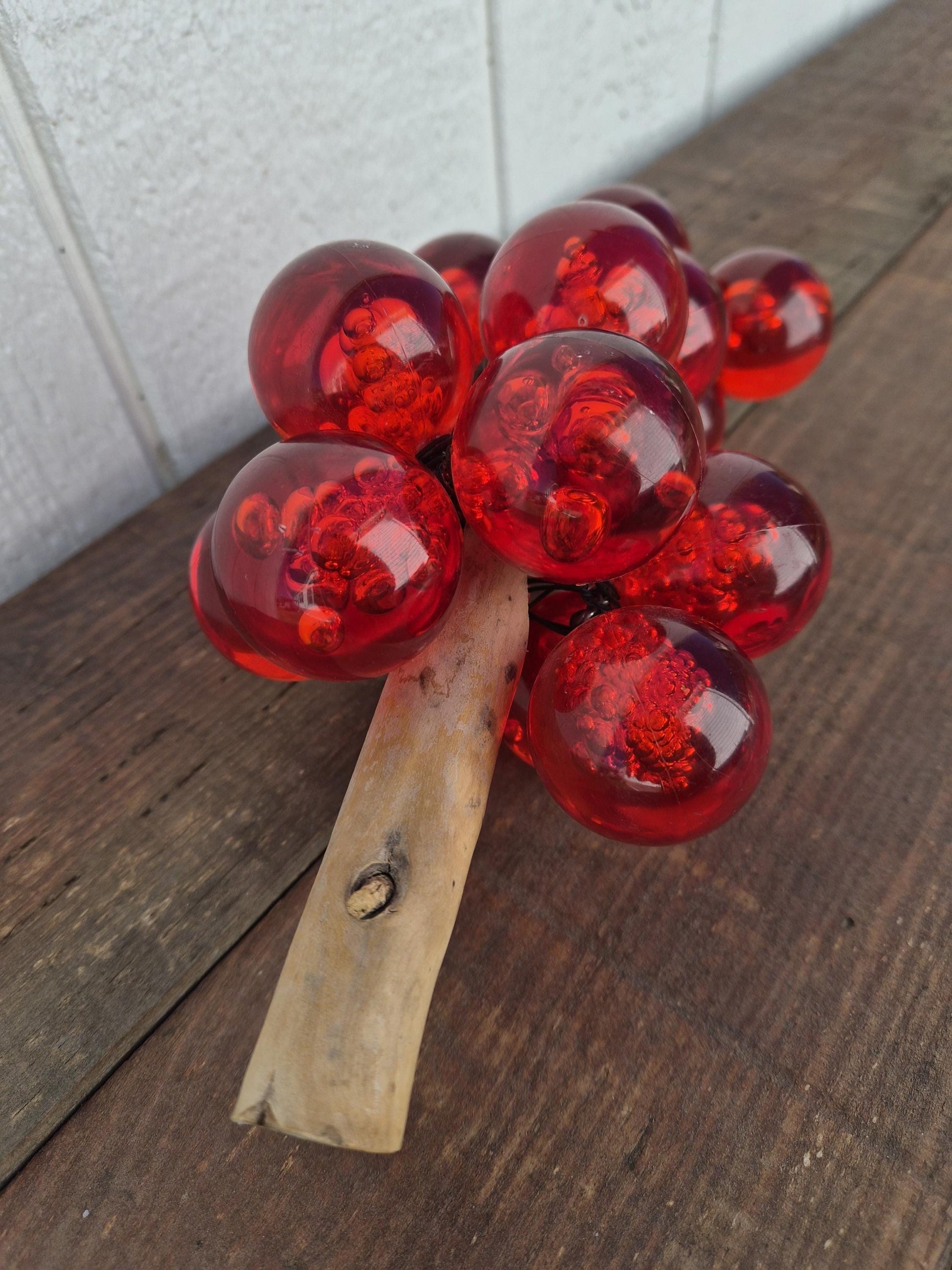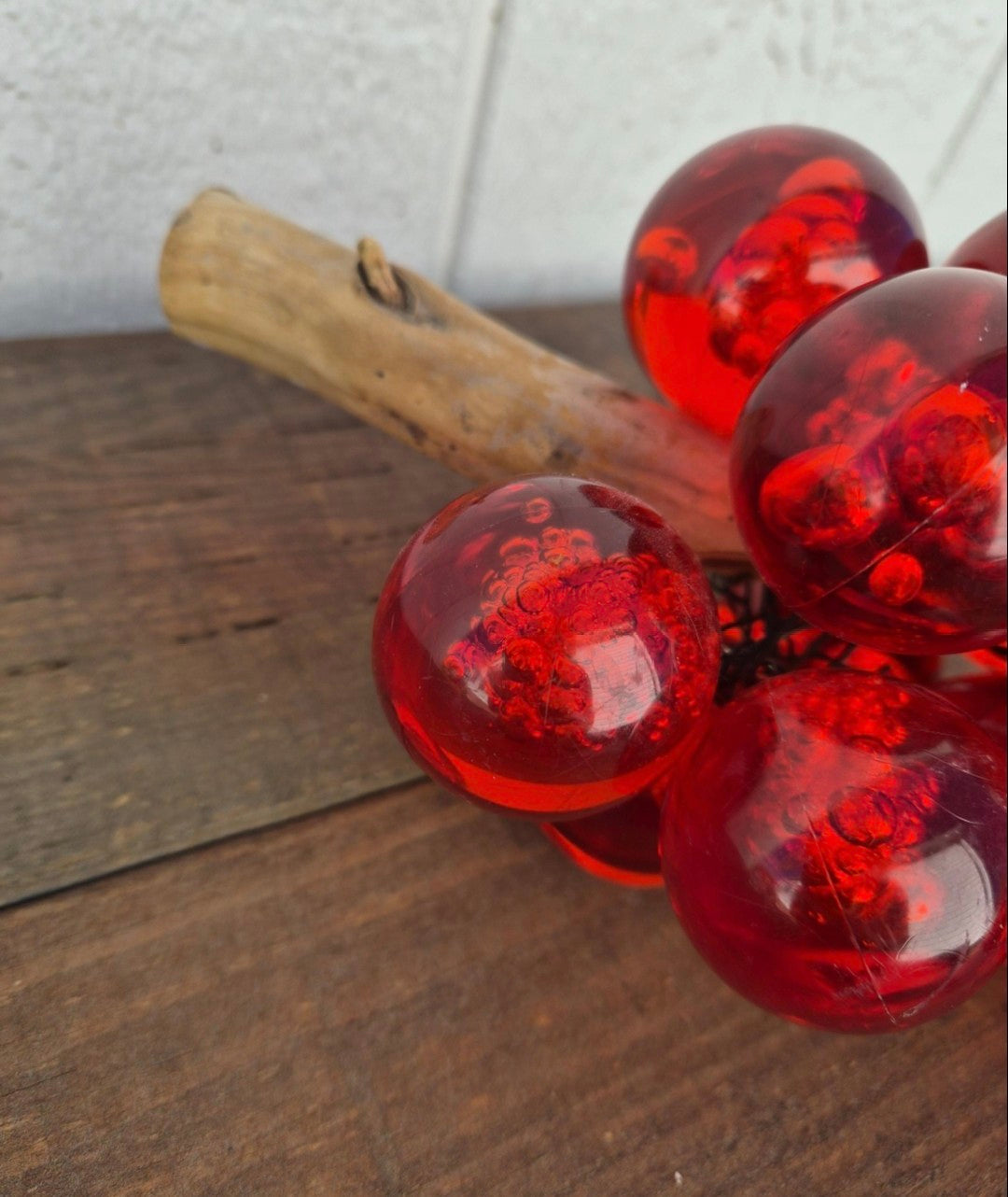 Beautiful, Mid Century cluster of red lucite grapes. The cluster has 18 red grapes, and a driftwood stem.