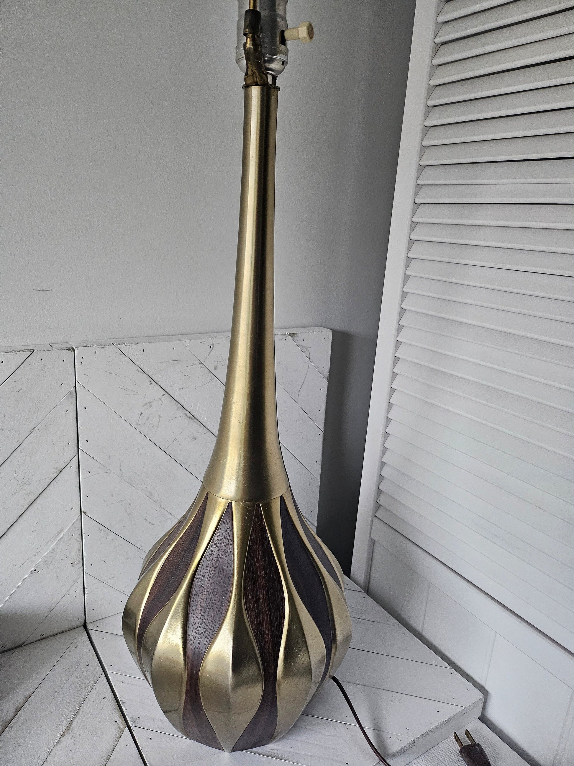Lamp has a brass-like metal finish with faux wood accents, and a 3-way switch.