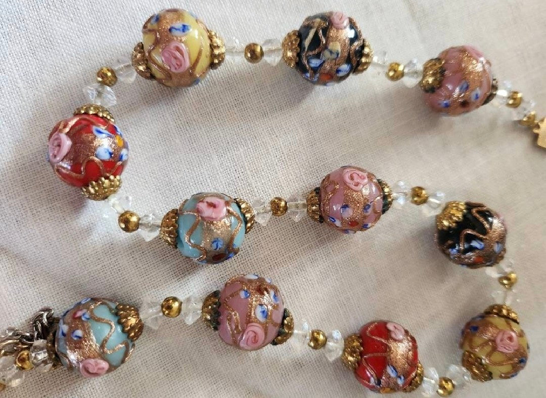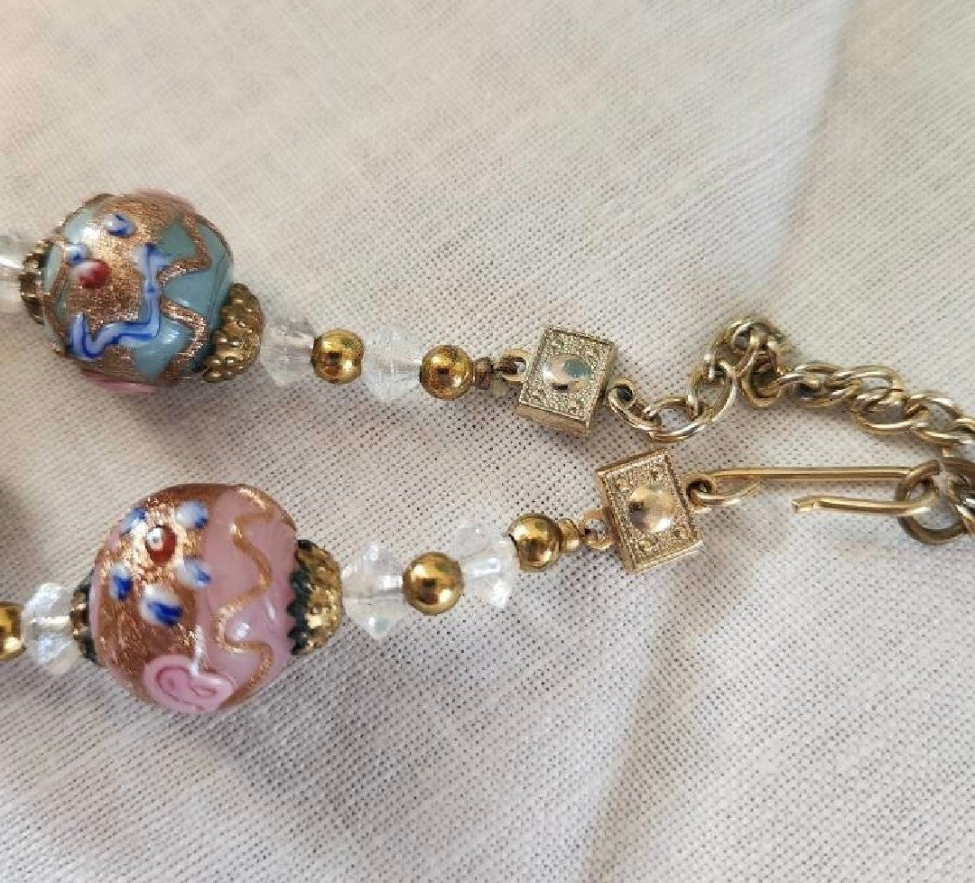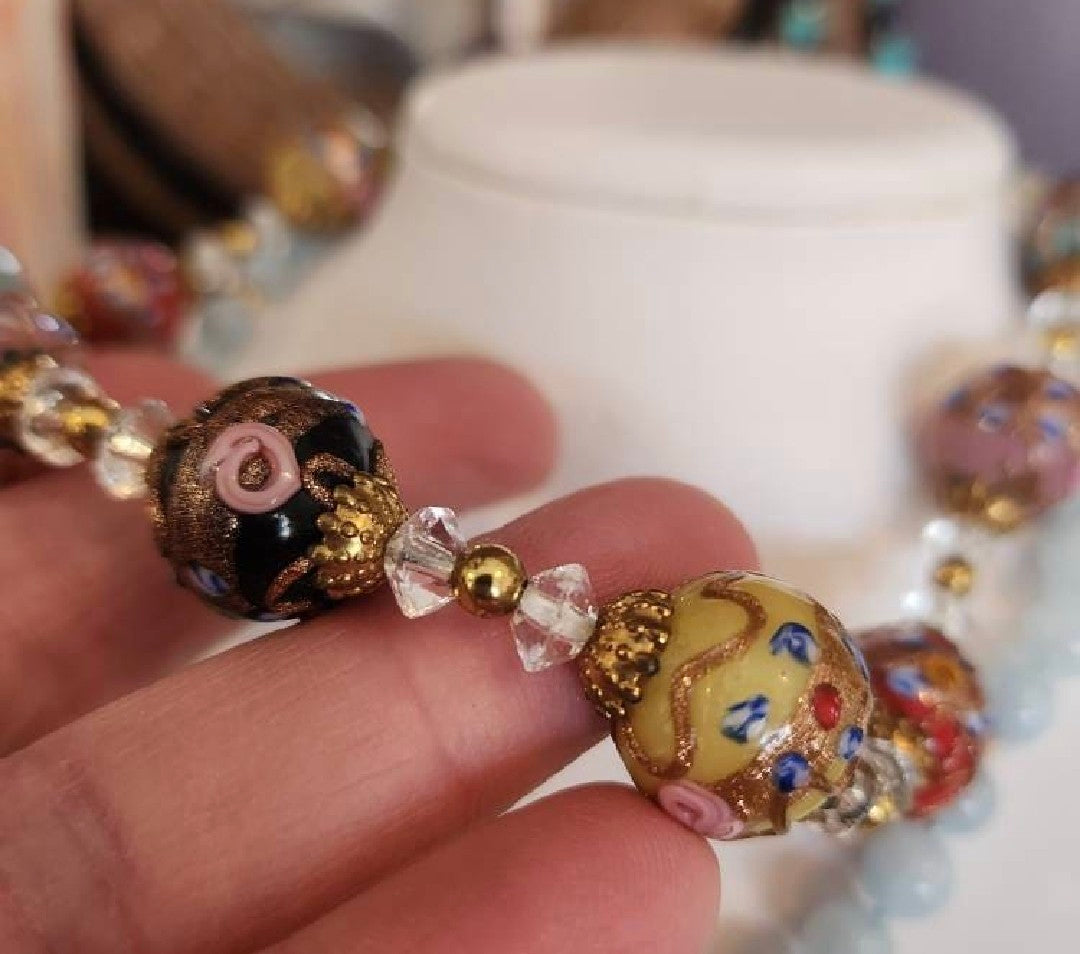 Lovely Murano multi-colored art glass round beads interspaced with clear faceted and round gold-tone spacer beads.