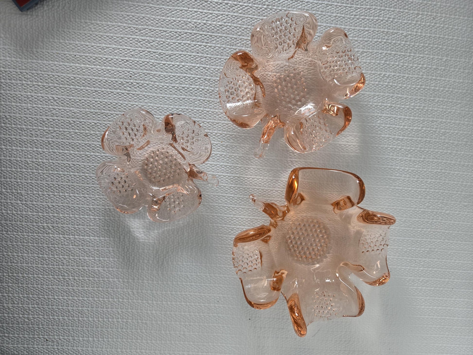 Fun set of 3 Mid Century, pink art glass, 4-leaf clover ashtrays. Consists of a 1 small, 1 medium, and 1 larger ashtray.