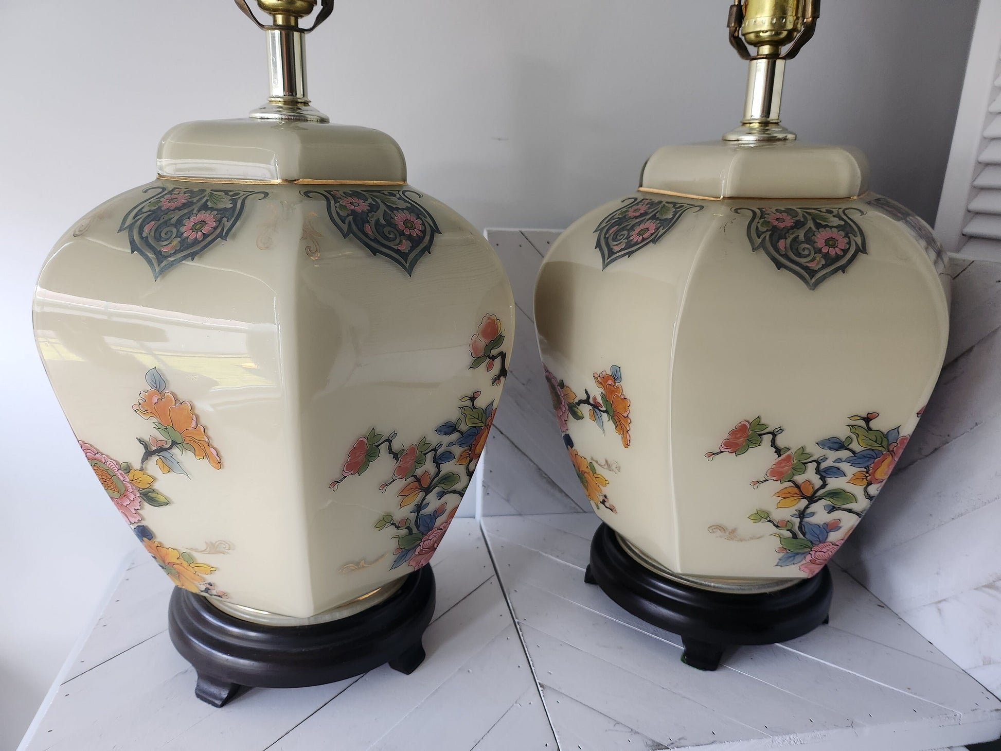 Condition: They have different switches, and need new harps. Some paint wear and a few chips on their bases, but none of these minor issues take away from how gorgeous these lamps are.
