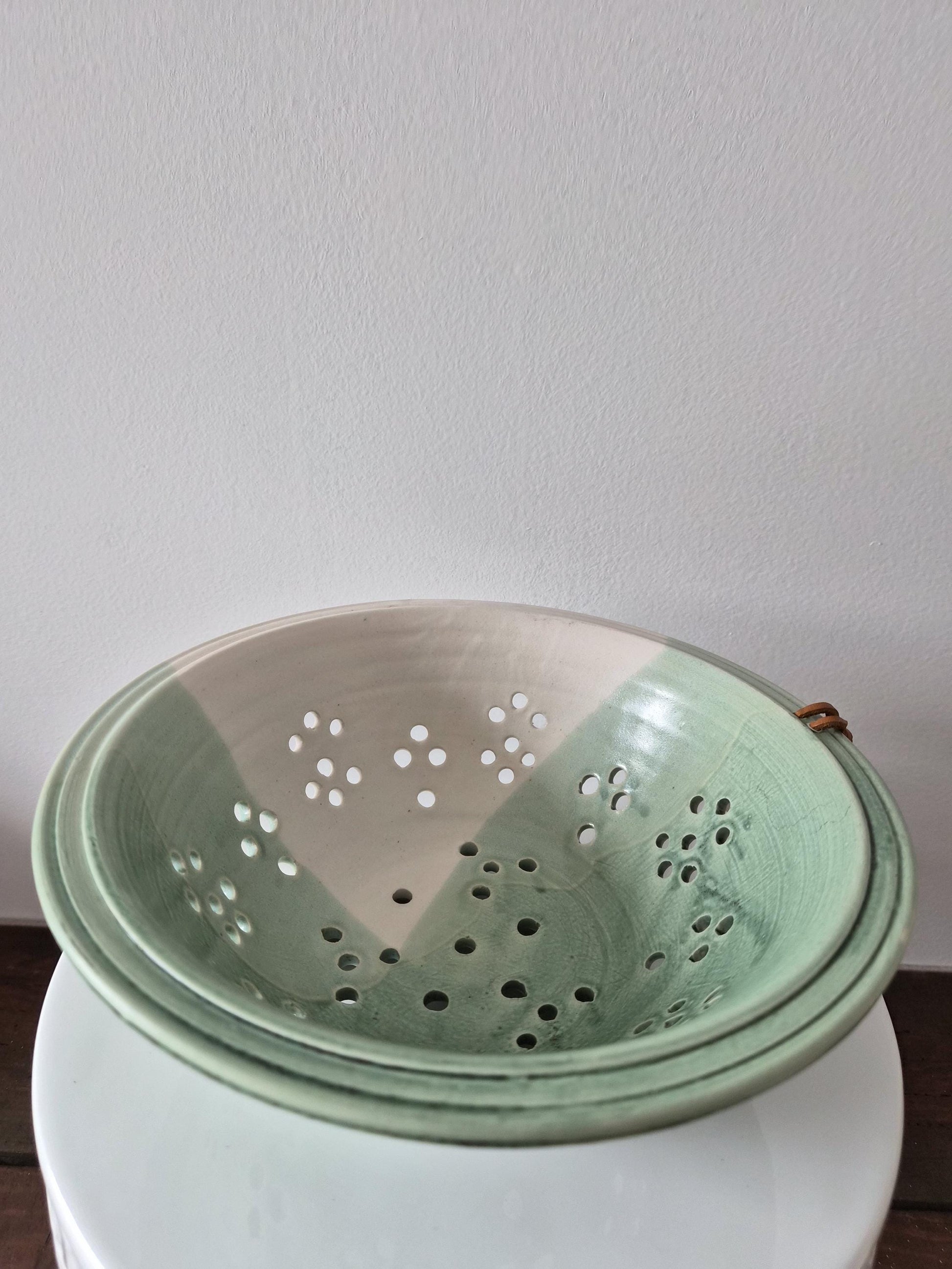 Unique pottery, two-tone green & chalk color berry bowl colander. Great decor piece!
