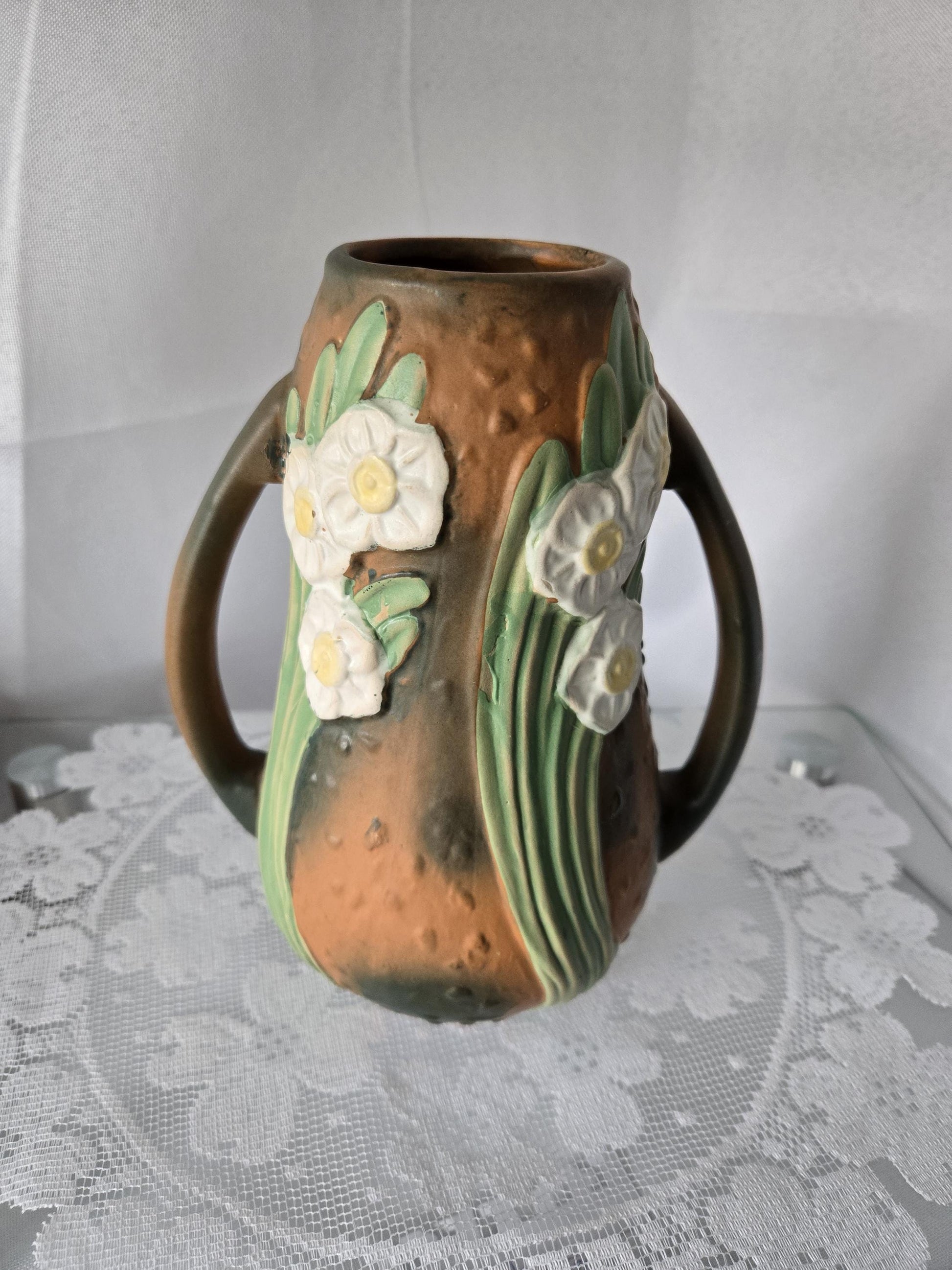 Lovely, vintage, Roseville Pottery dual handled vase in earth tones with floral motif.