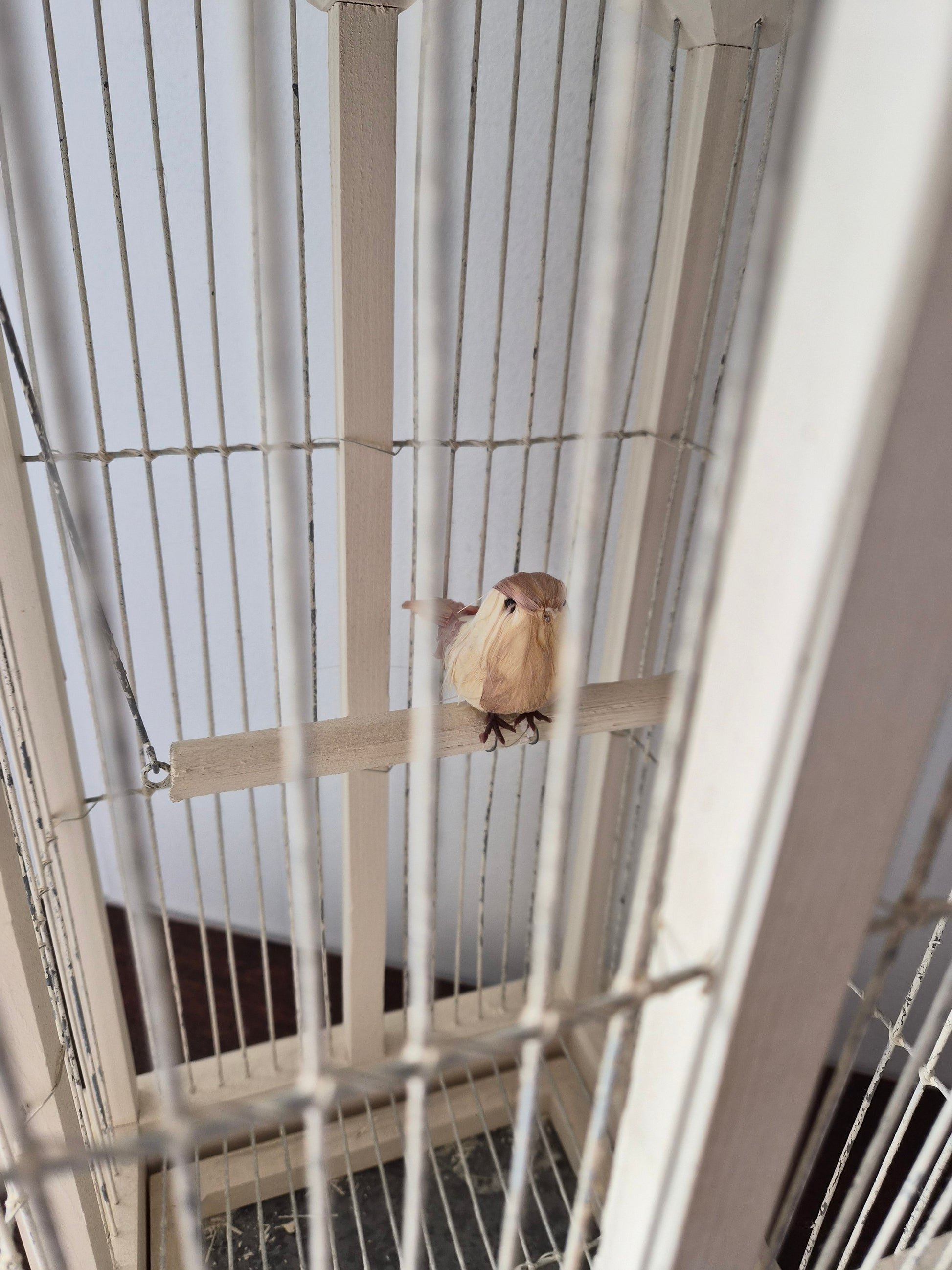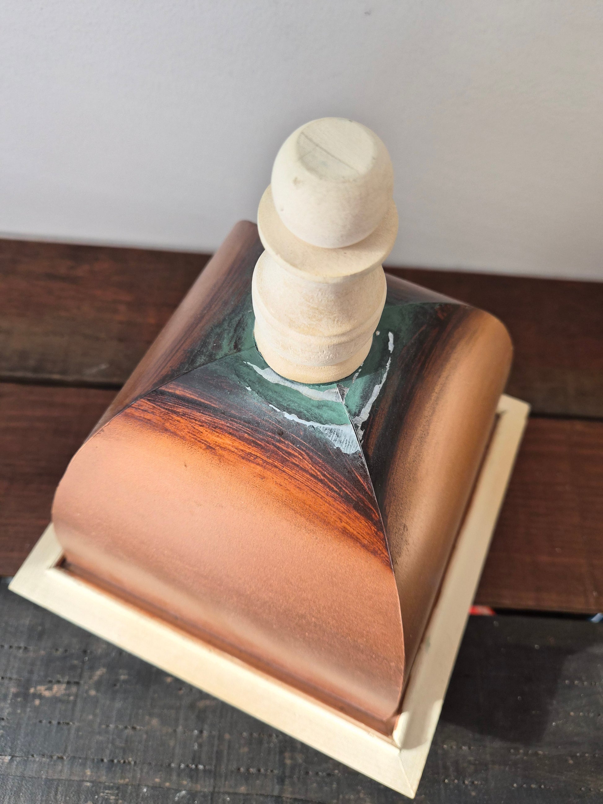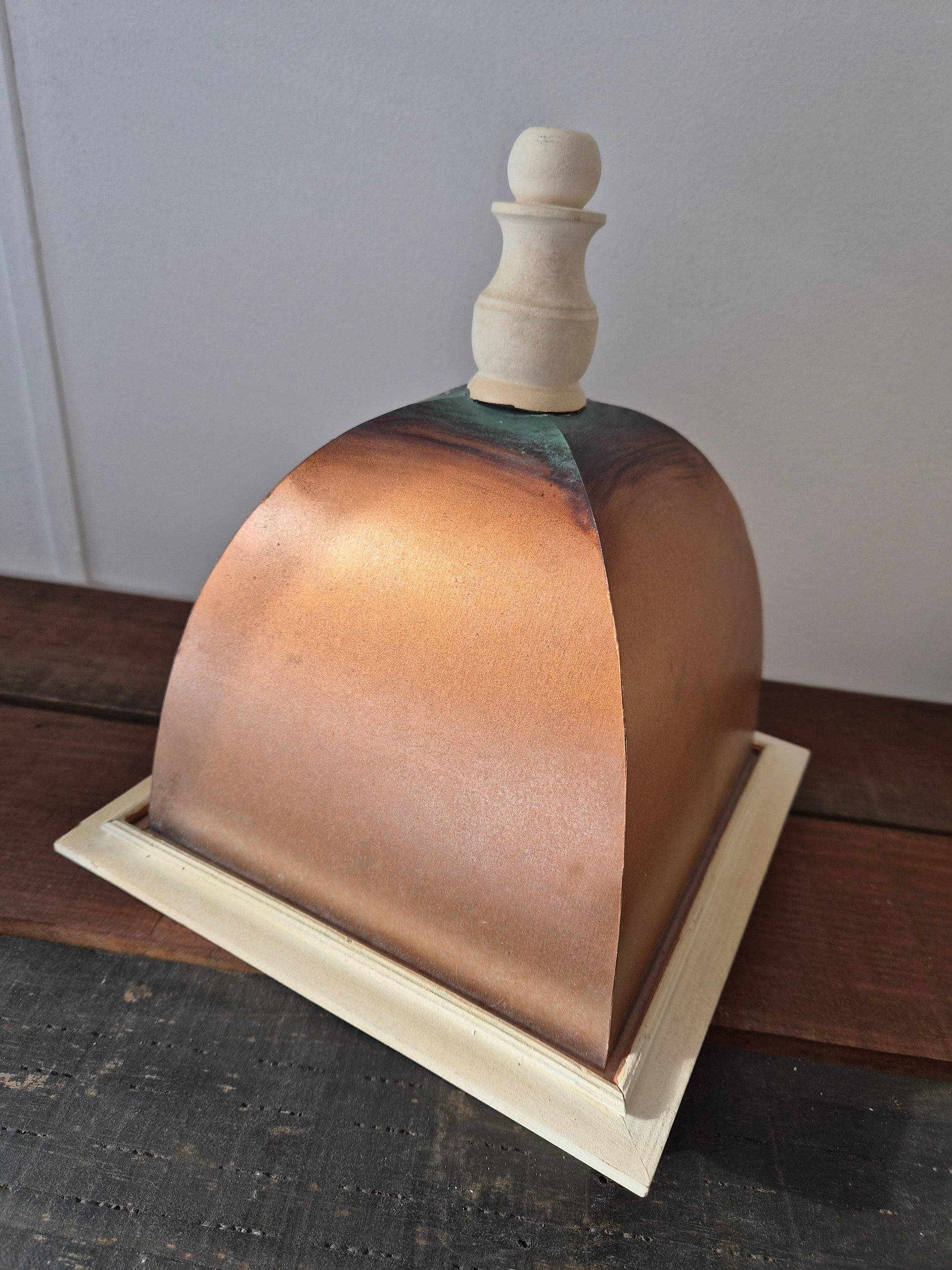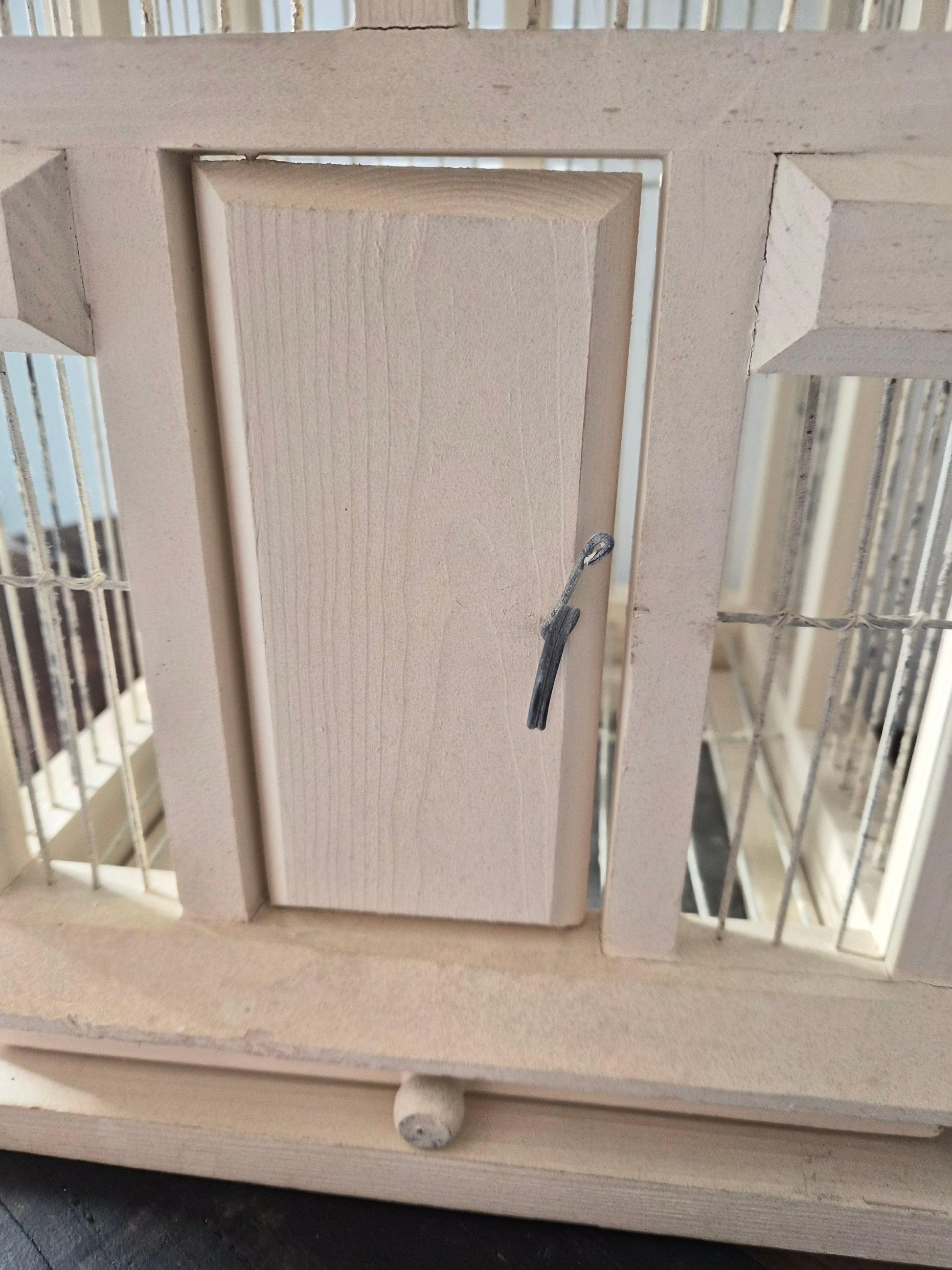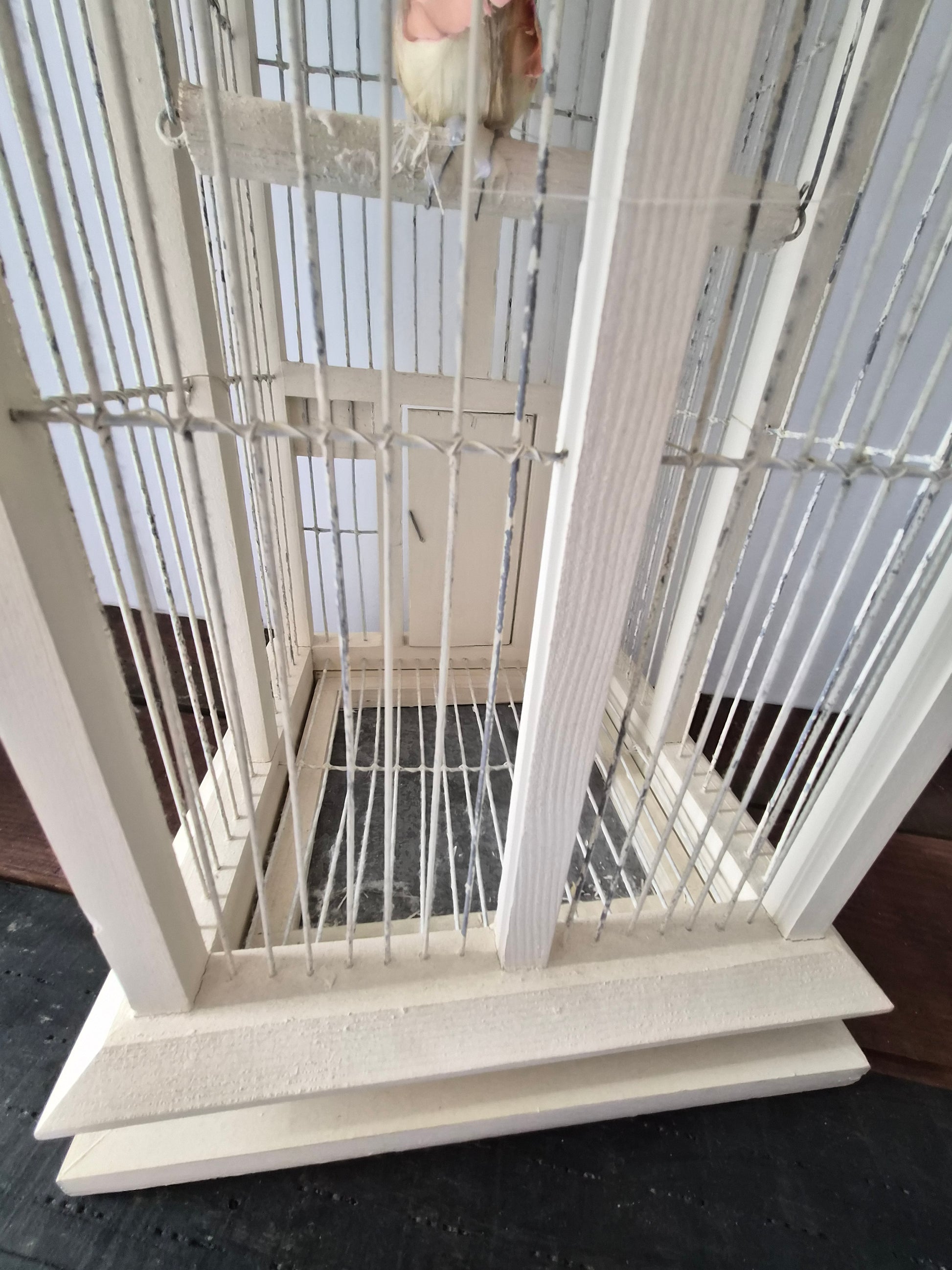 Amazing wooden and wire shabby chic tower bird cage with copper painted metal removable top, and pull-out bottom tray. Cage is an off-white, has a bird swing and door. Sample bird inside.