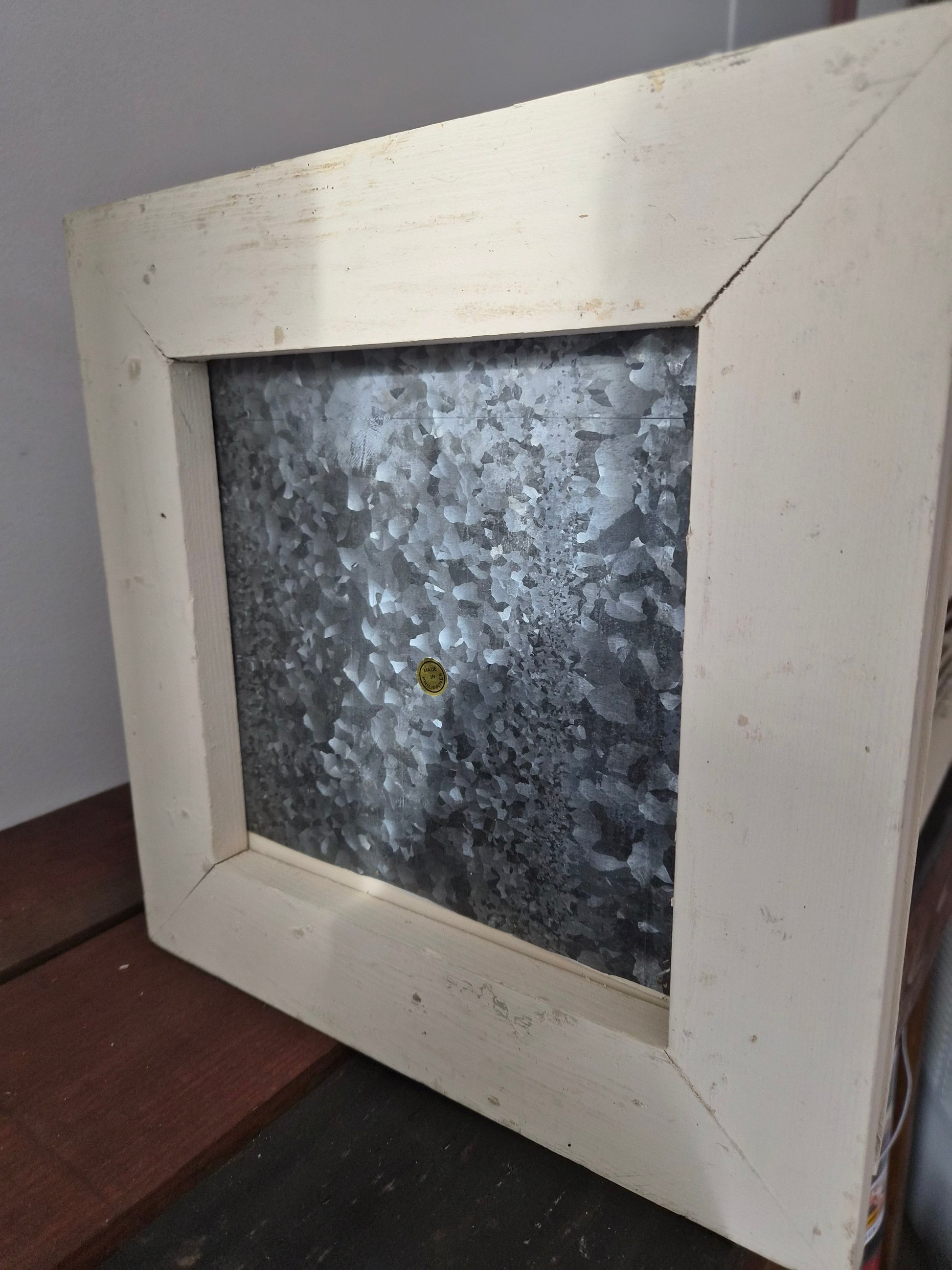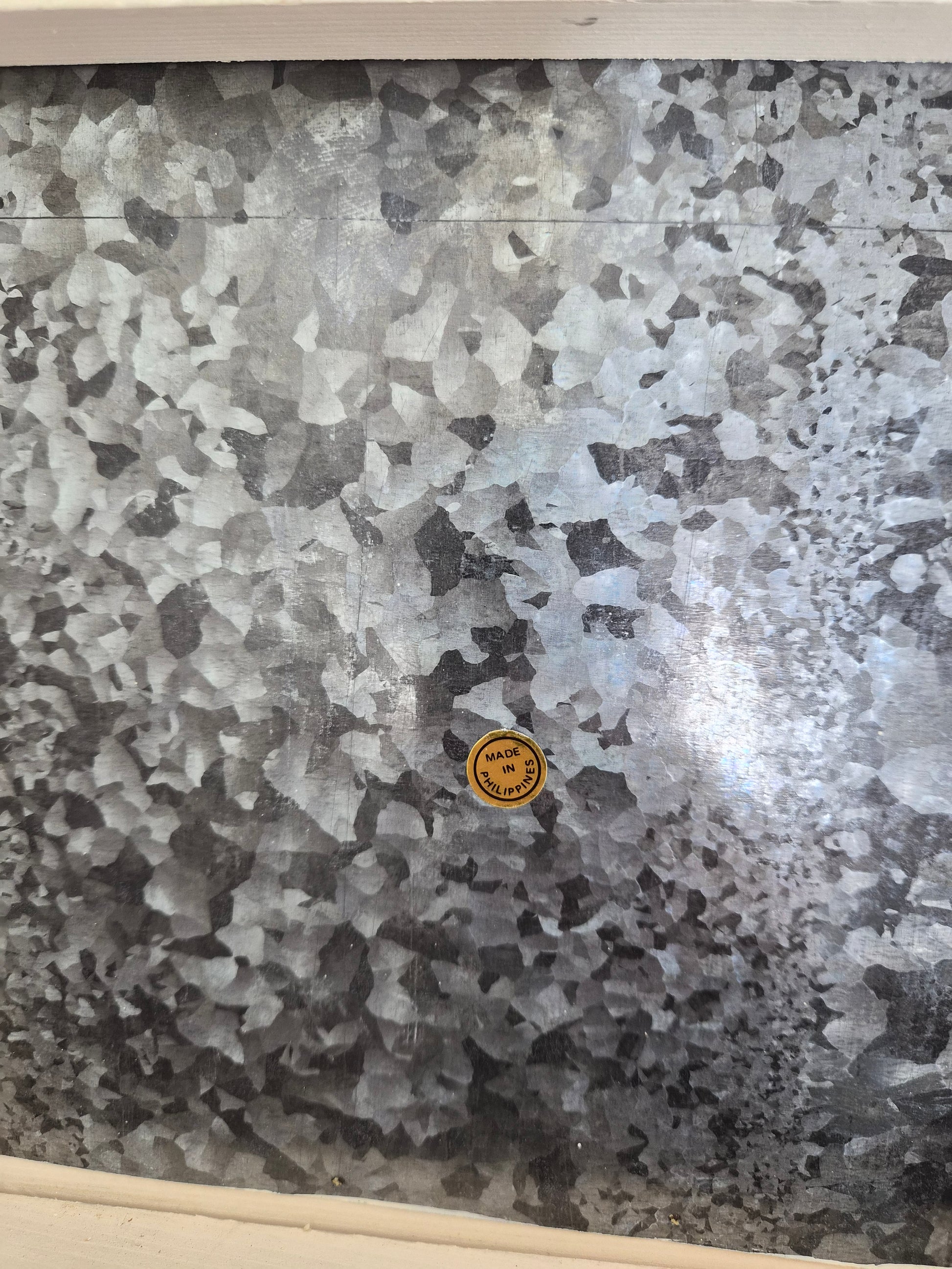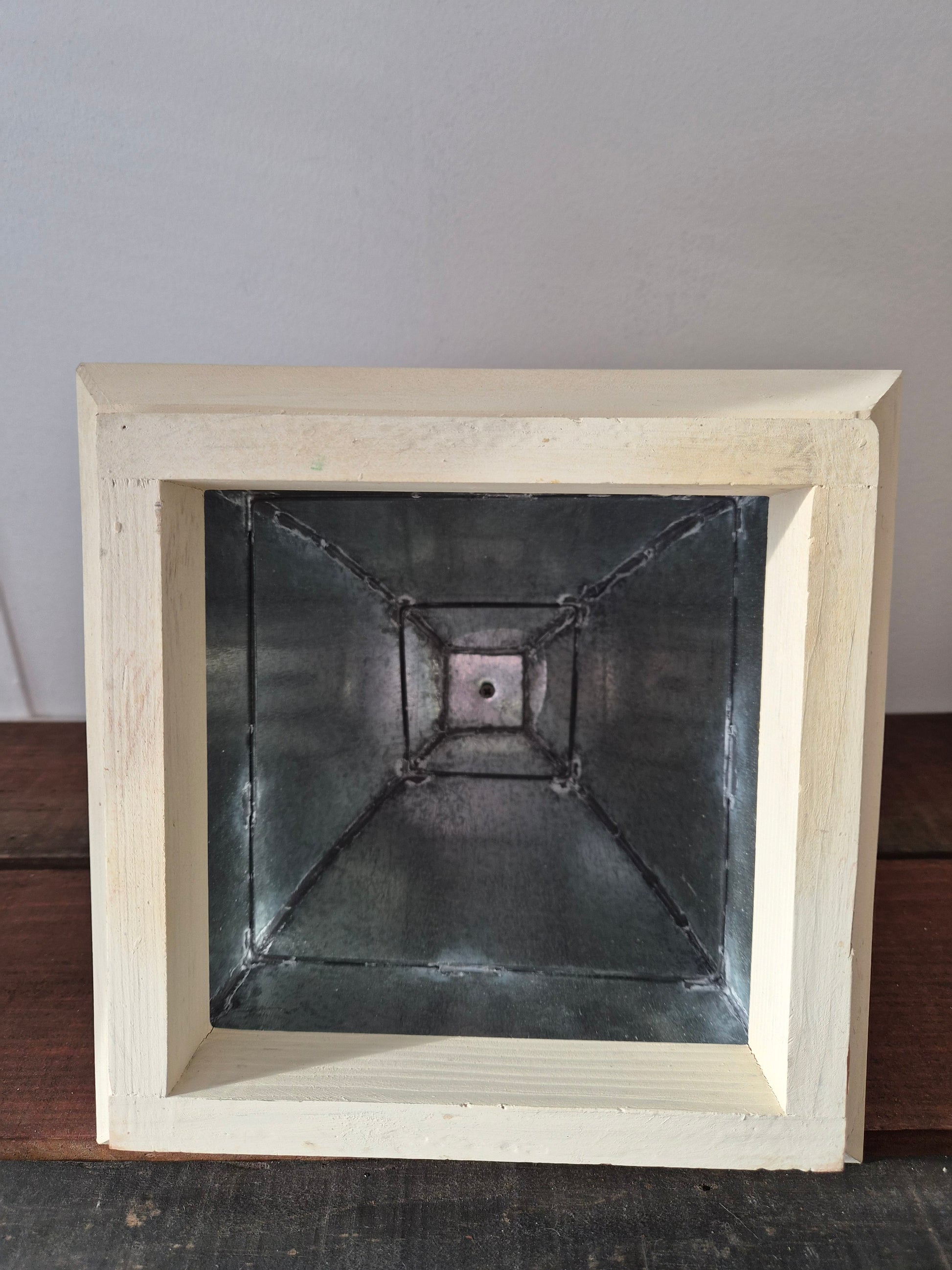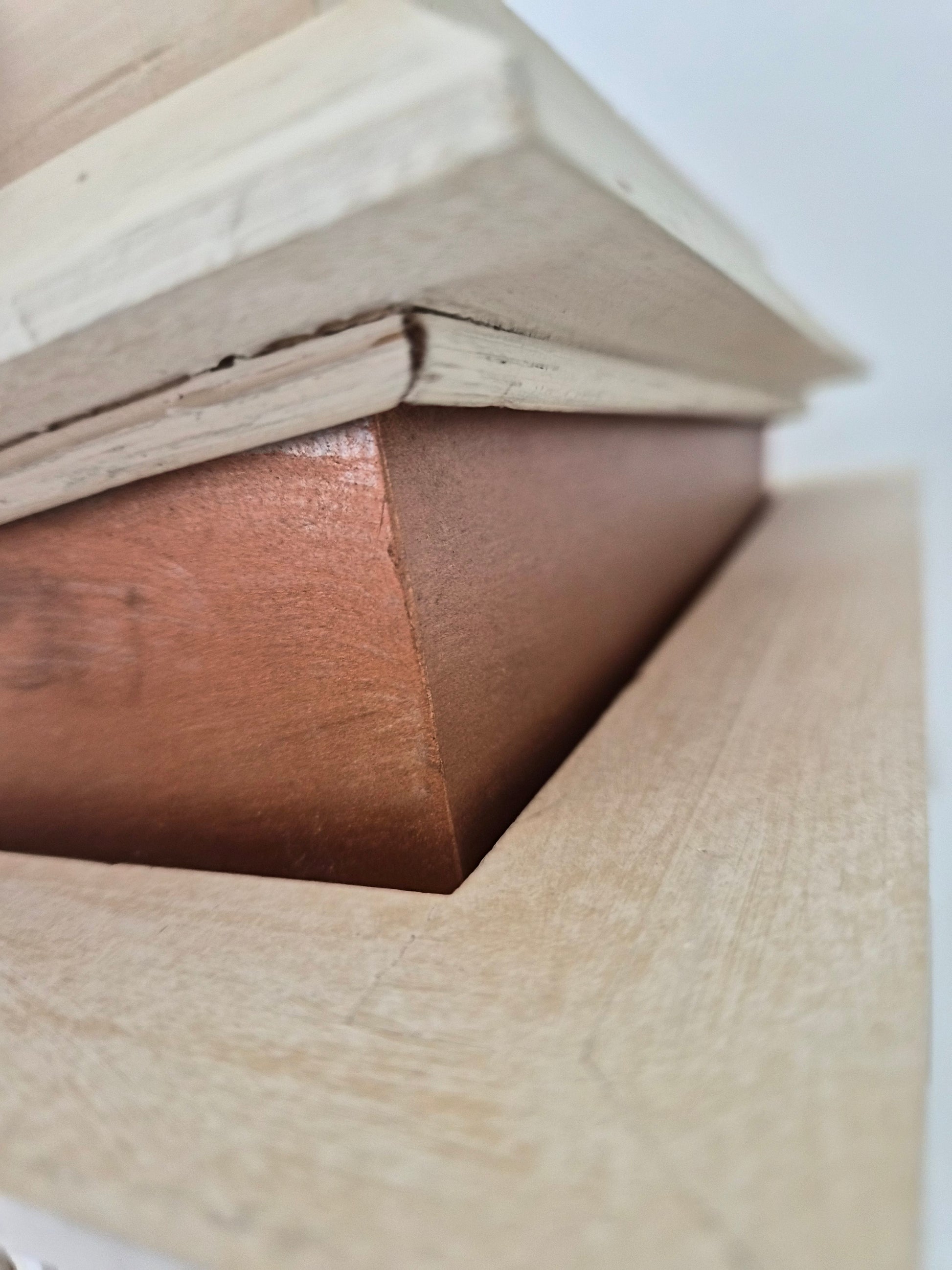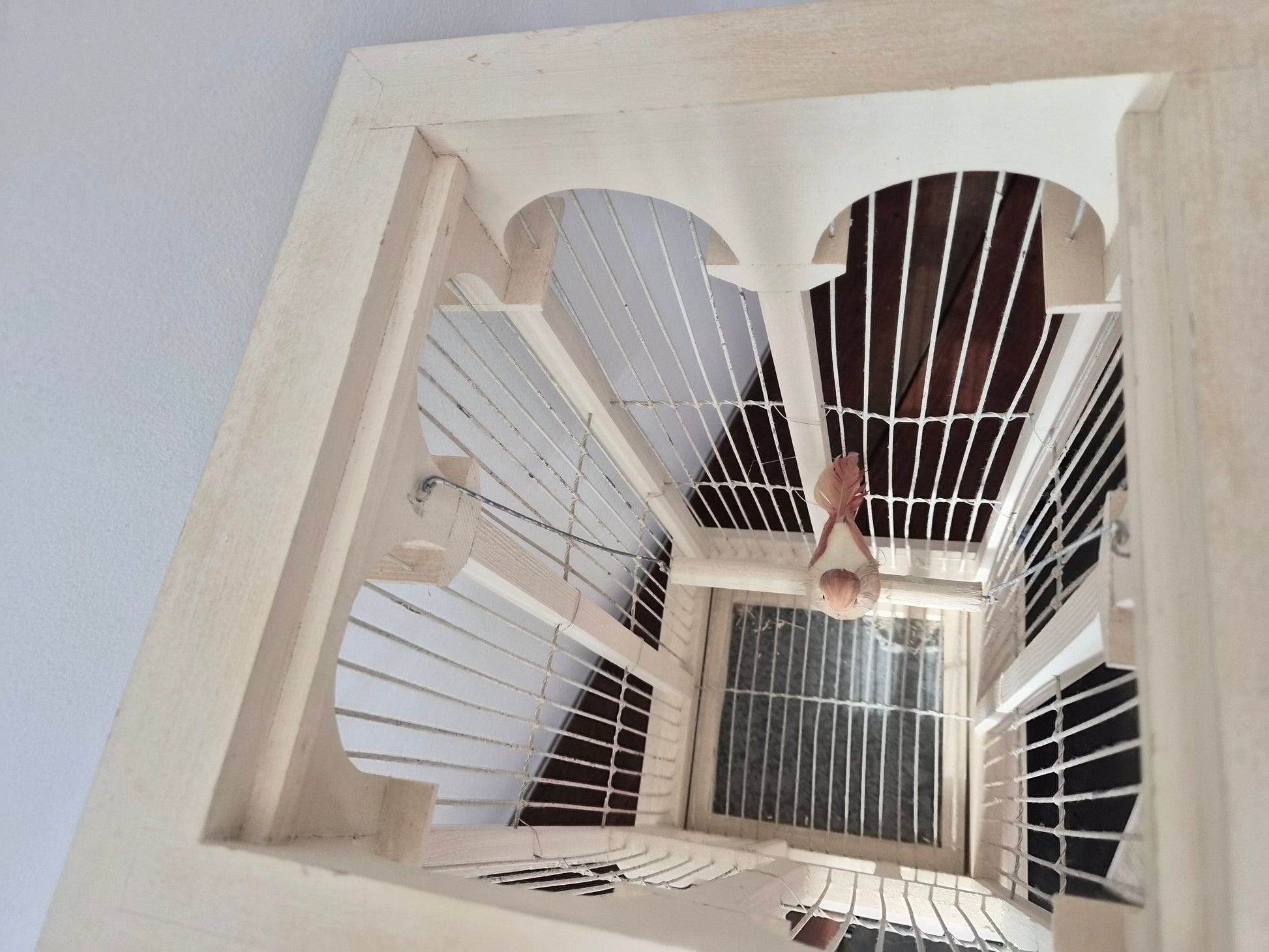 Amazing wooden and wire shabby chic tower bird cage with copper painted metal removable top, and pull-out bottom tray. Cage is an off-white, has a bird swing and door. Sample bird inside.