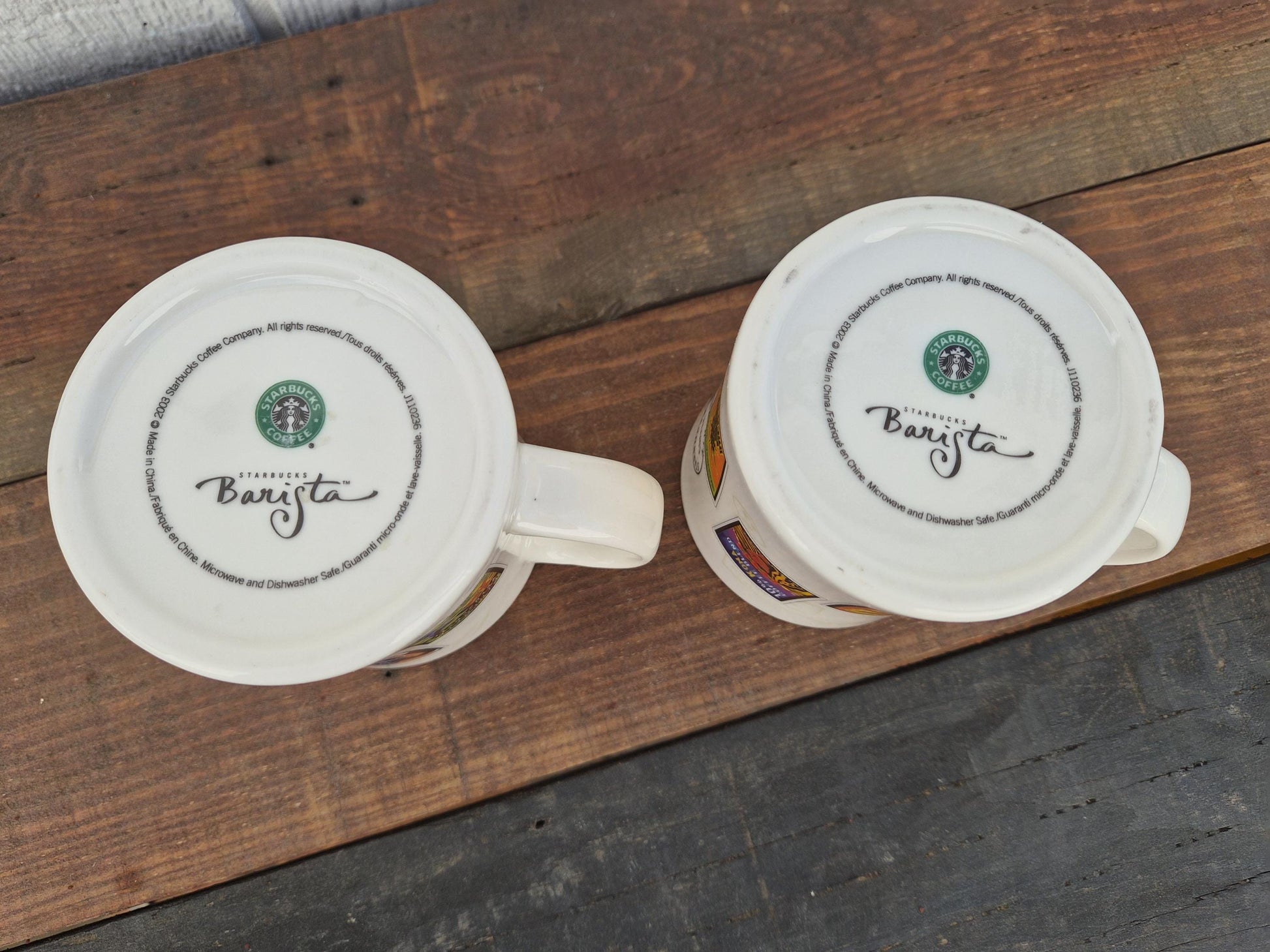 Pair of Starbucks Coffee Barista mugs. Ceramic Air Mail stamp mugs; Smooth and Bold.