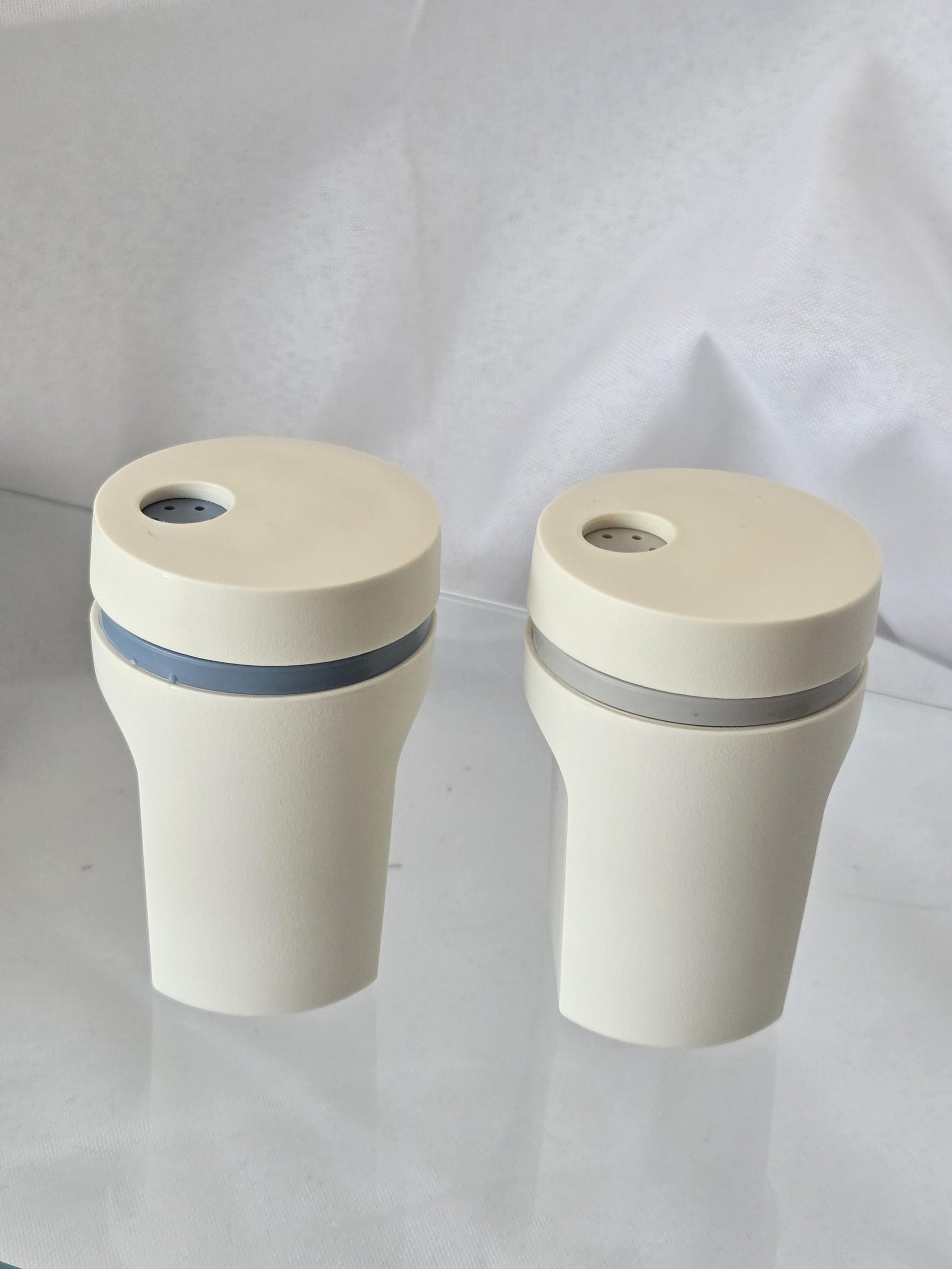 Vintage Tupperware Salt and Pepper shakers in gray and blue. Add to a collection, or use at your table!