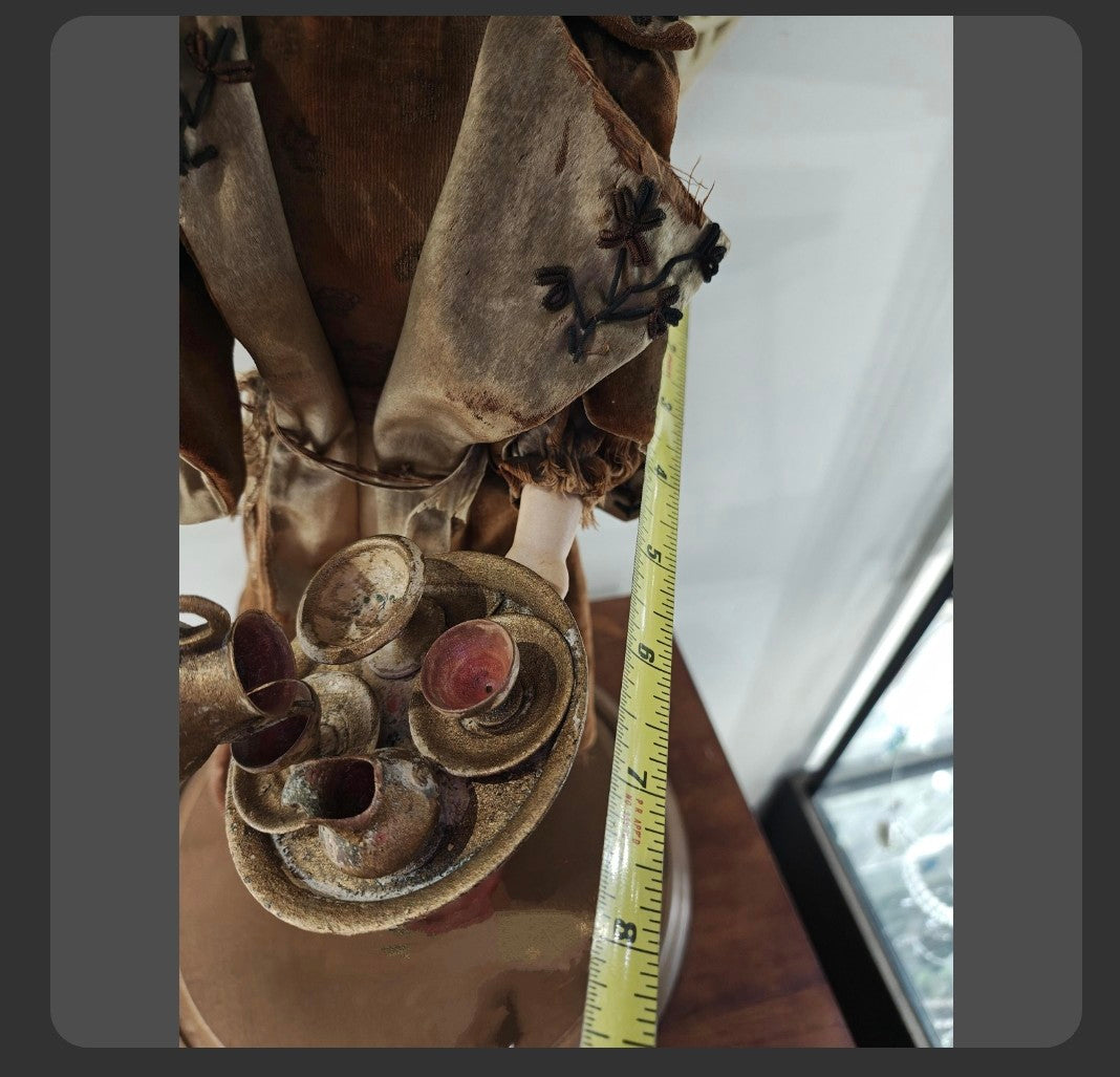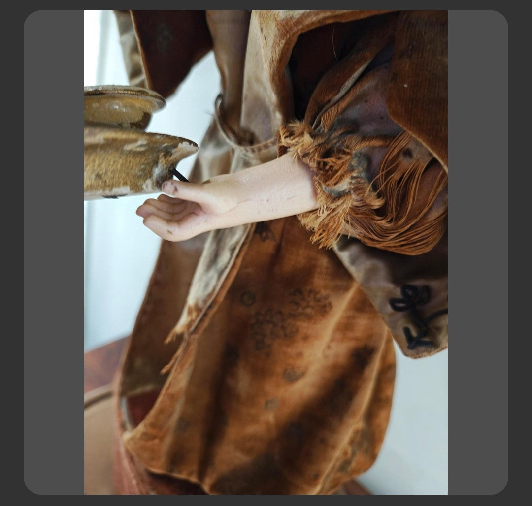 Condition is good for it's age. Automaton works well, it can be viewed in the link below. Clothing fabric shows typical wear consistent with its age, such as fraying, and some tears, and stains. Arm shows a possible hairline crack, not deep. Some hand bisque wear, too. Hair needs a little riding up.