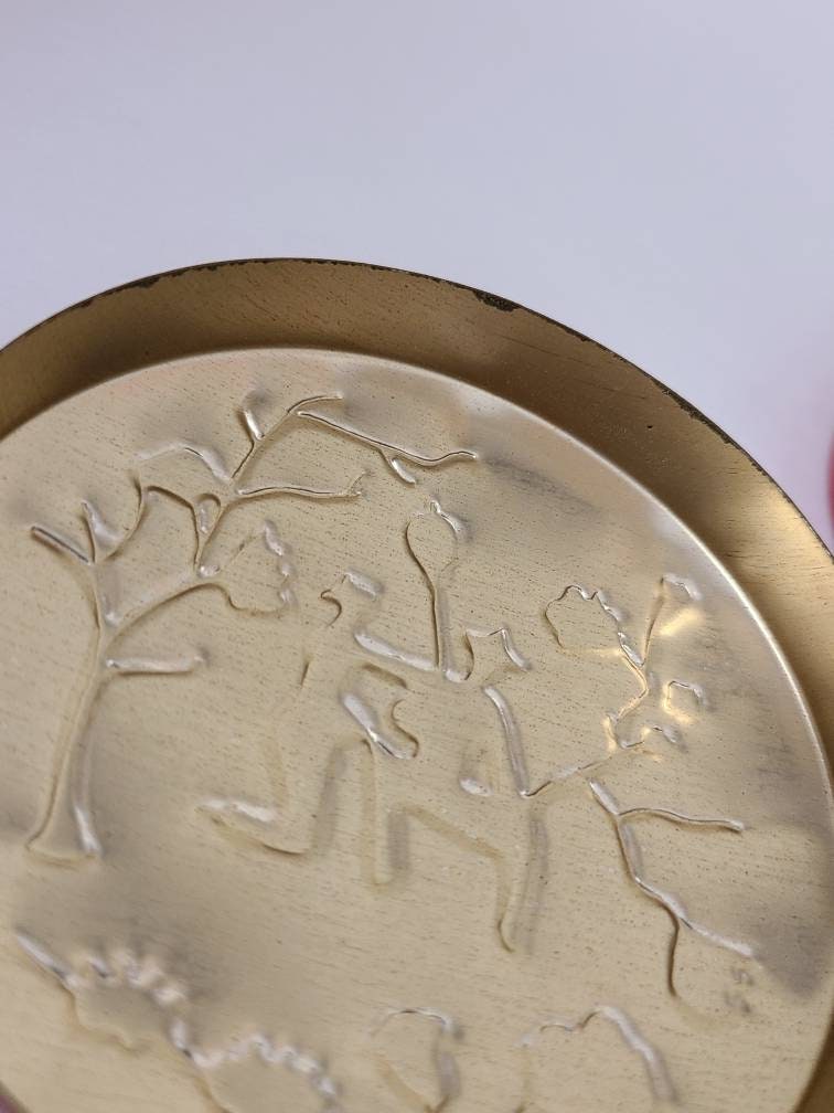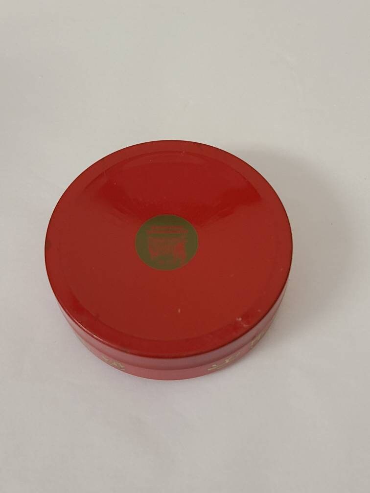 Little red tin depicts an Asian couple wearing coolie hats and sitting on a small hill - by Baret Ware England.
