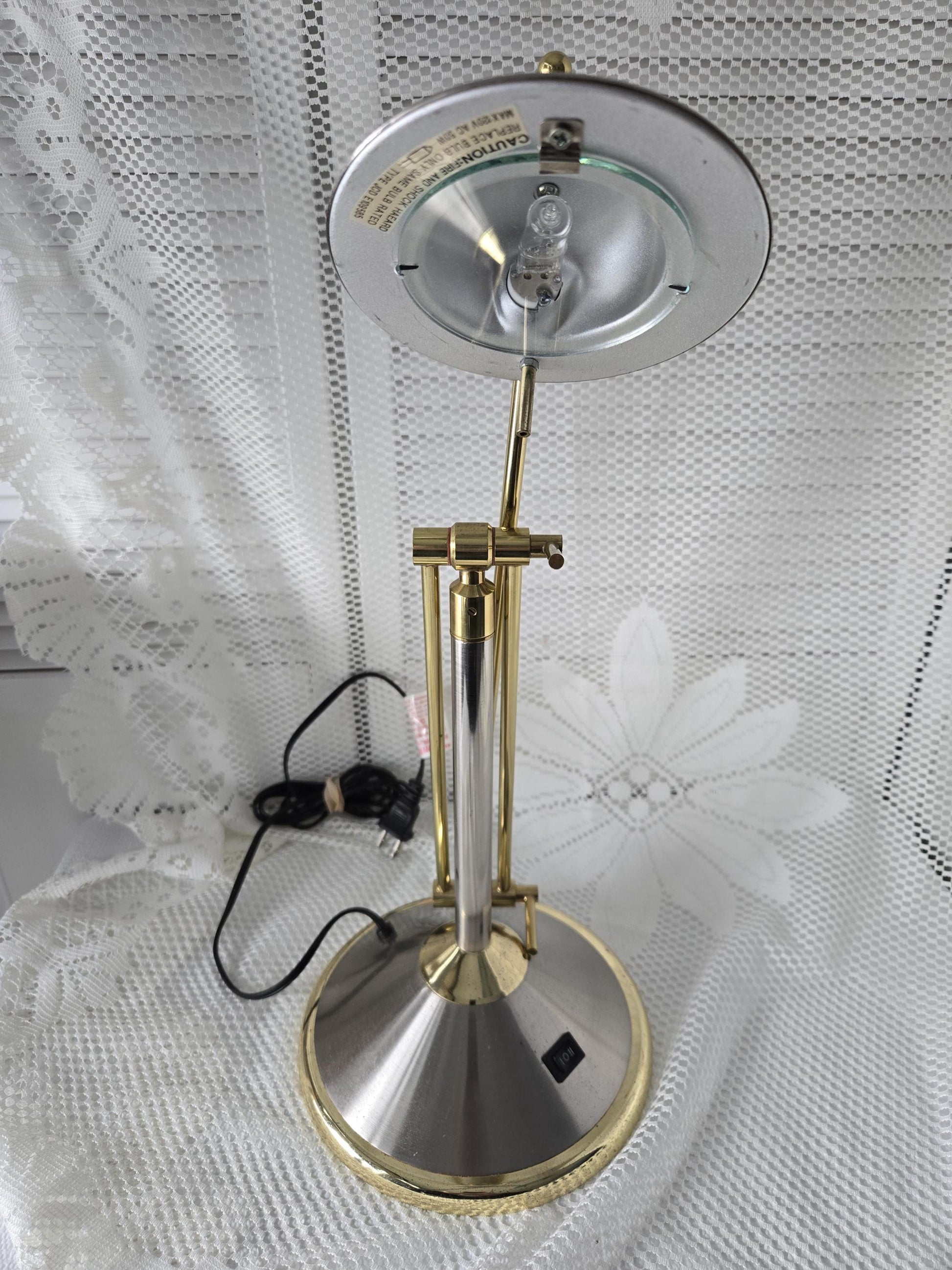 MCM brushed silver-tone, and shiny gold-tone adjustable metal desk lamp. The halogen lamp has a UFO-style dome shade and base - by Underwriters Laboratories. Requires 1 JCD 120V 50W Max. bulb.