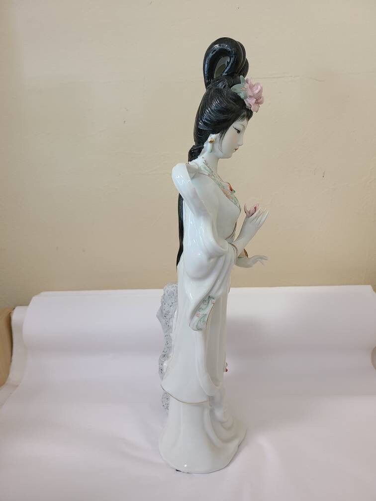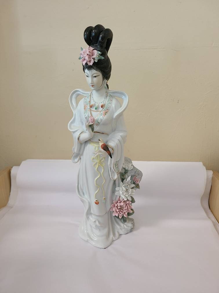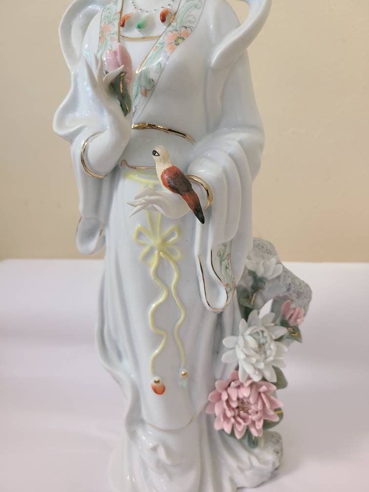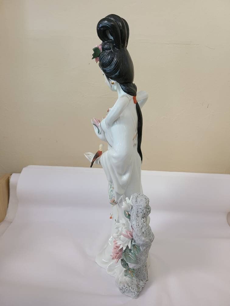 Gorgeous, Porcelain Geisha decor. She holds a flower and a bird, and her traditional kimono has hand painted peach, mint green, and gold trim accents.
