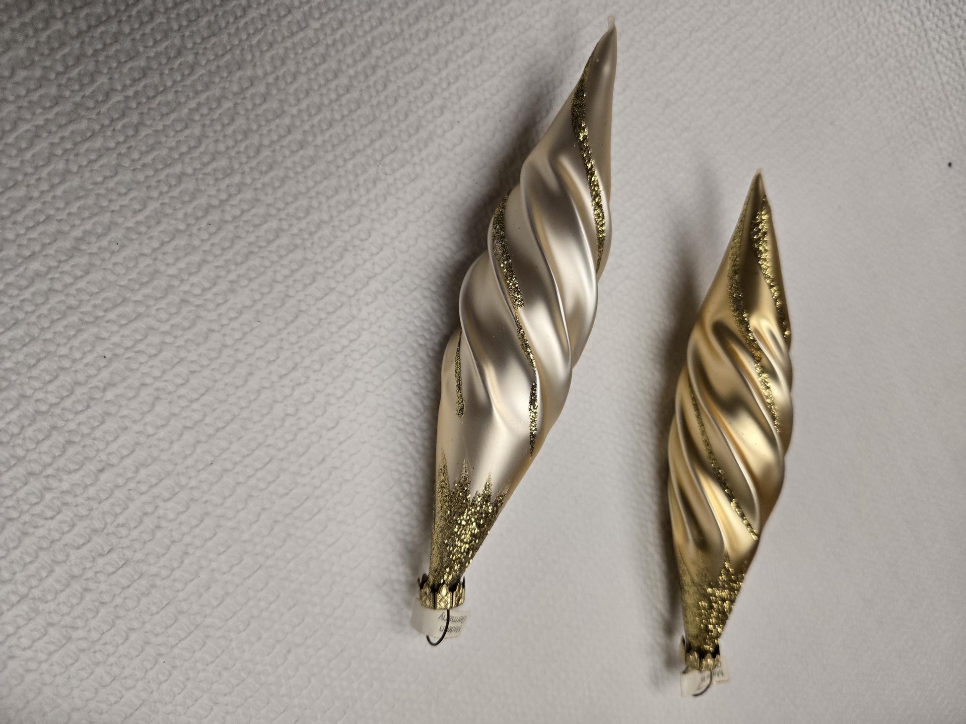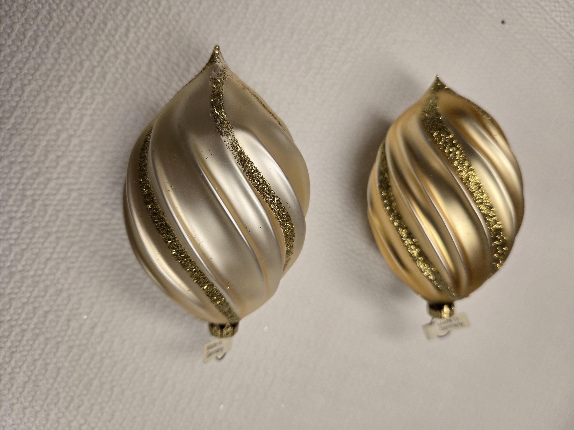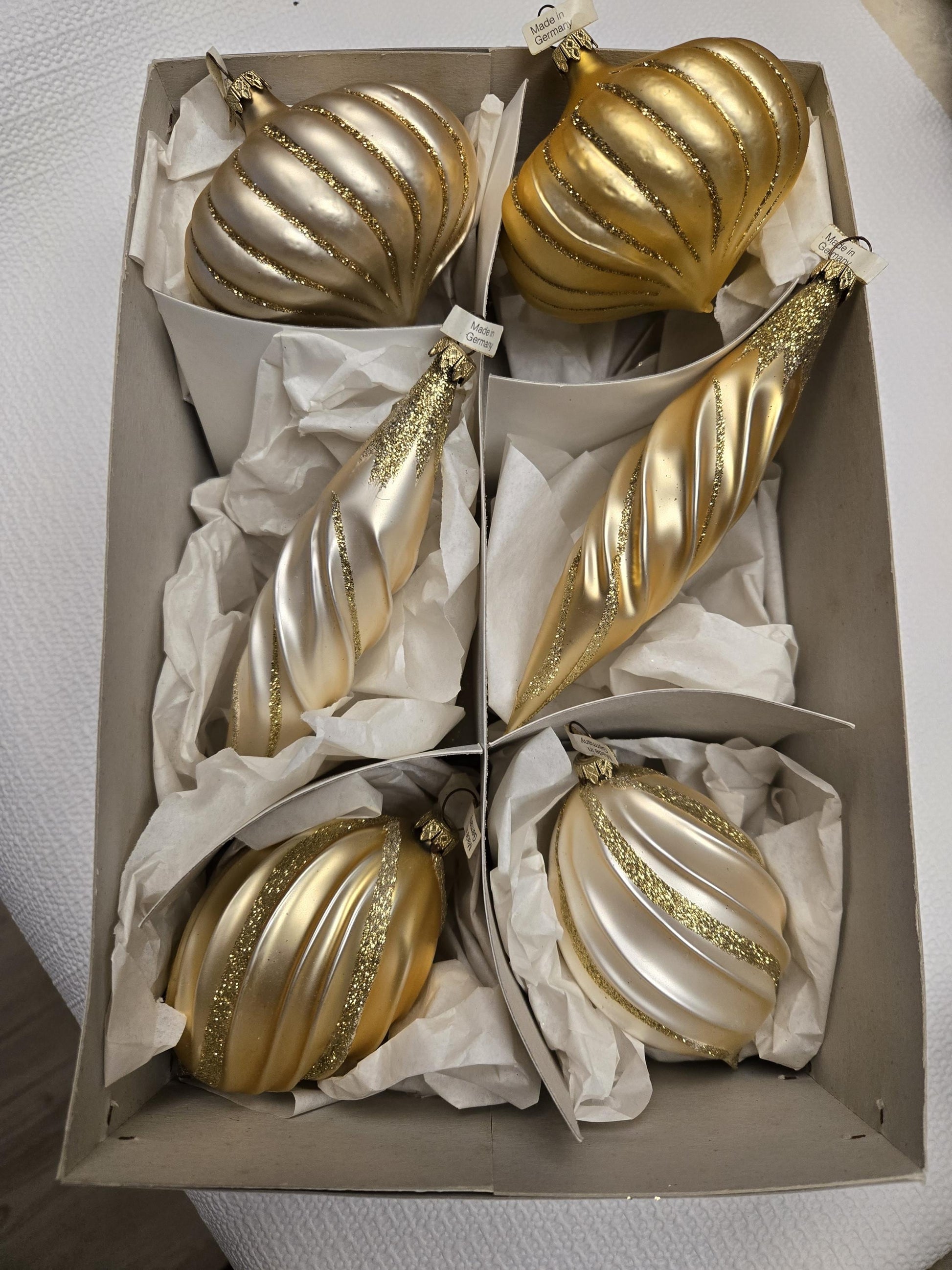There are 3 different designs, with 1 bulb in each group being golden and the other bulb champagne in color, all are made in Germany.