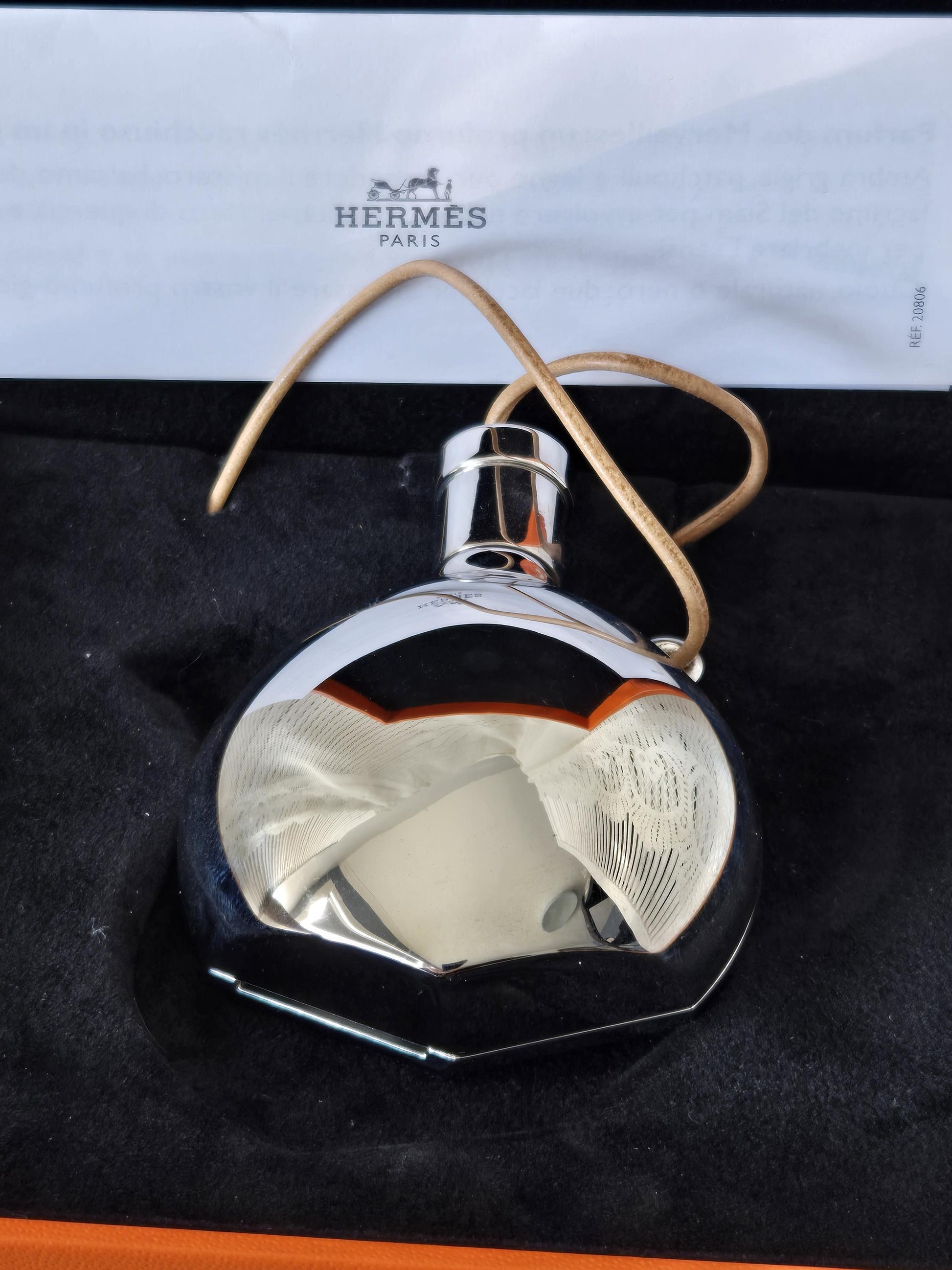 Authentic vintage Hermes Pure Perfume necklace. Necklace contains a .25ml spray full bottle of Parfum, and neck cord.