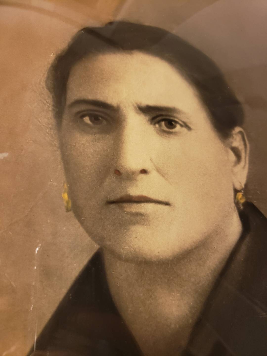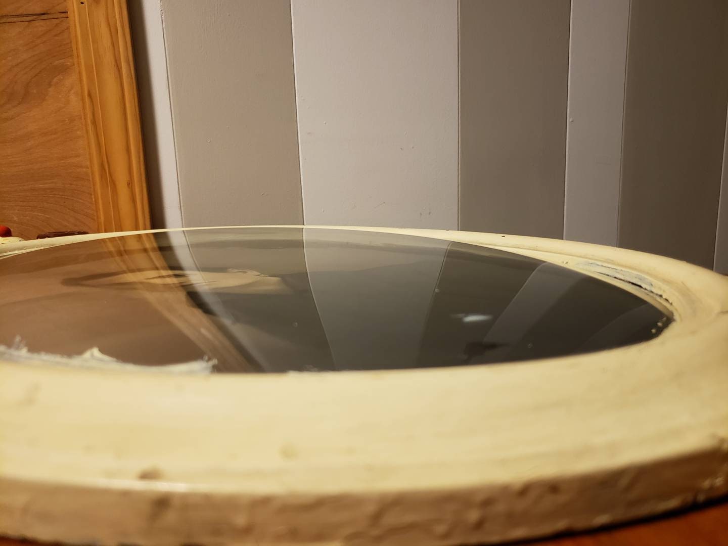 Vintage lady photograph set in an oval, cream-color painted, bubble glass frame. Subject has sepia undertones.