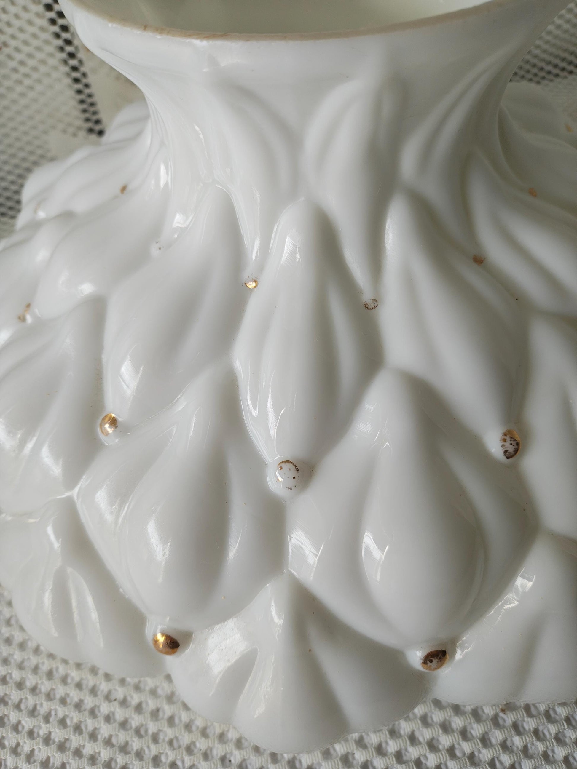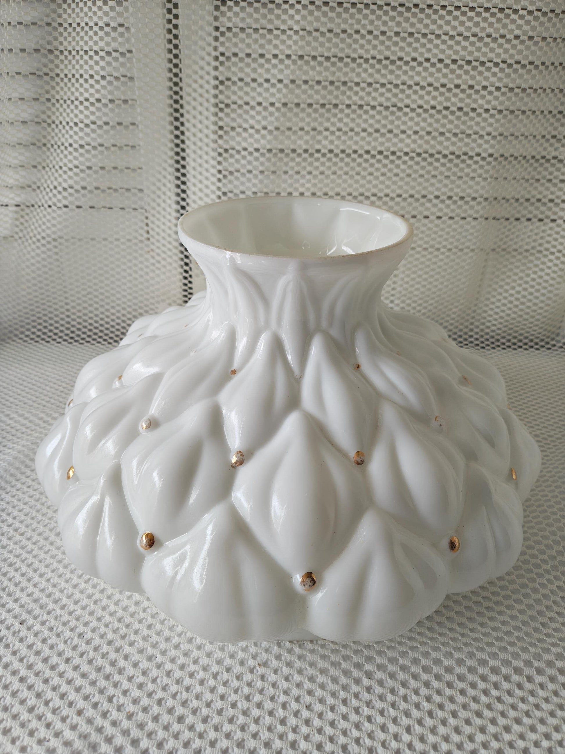 This vintage quilted-like, white glass shade with gold spots might be the fix! Likely a Hedco, but unmarked.