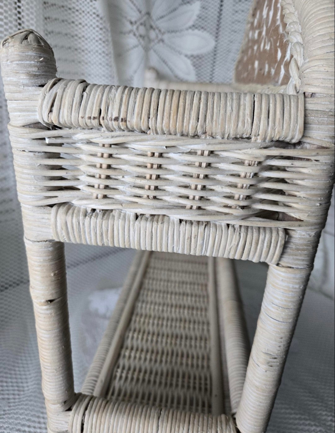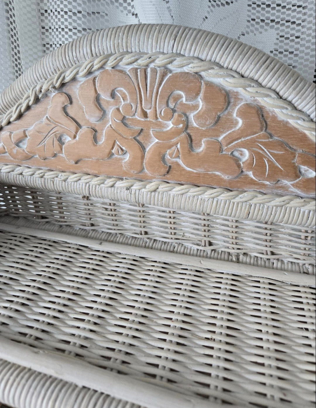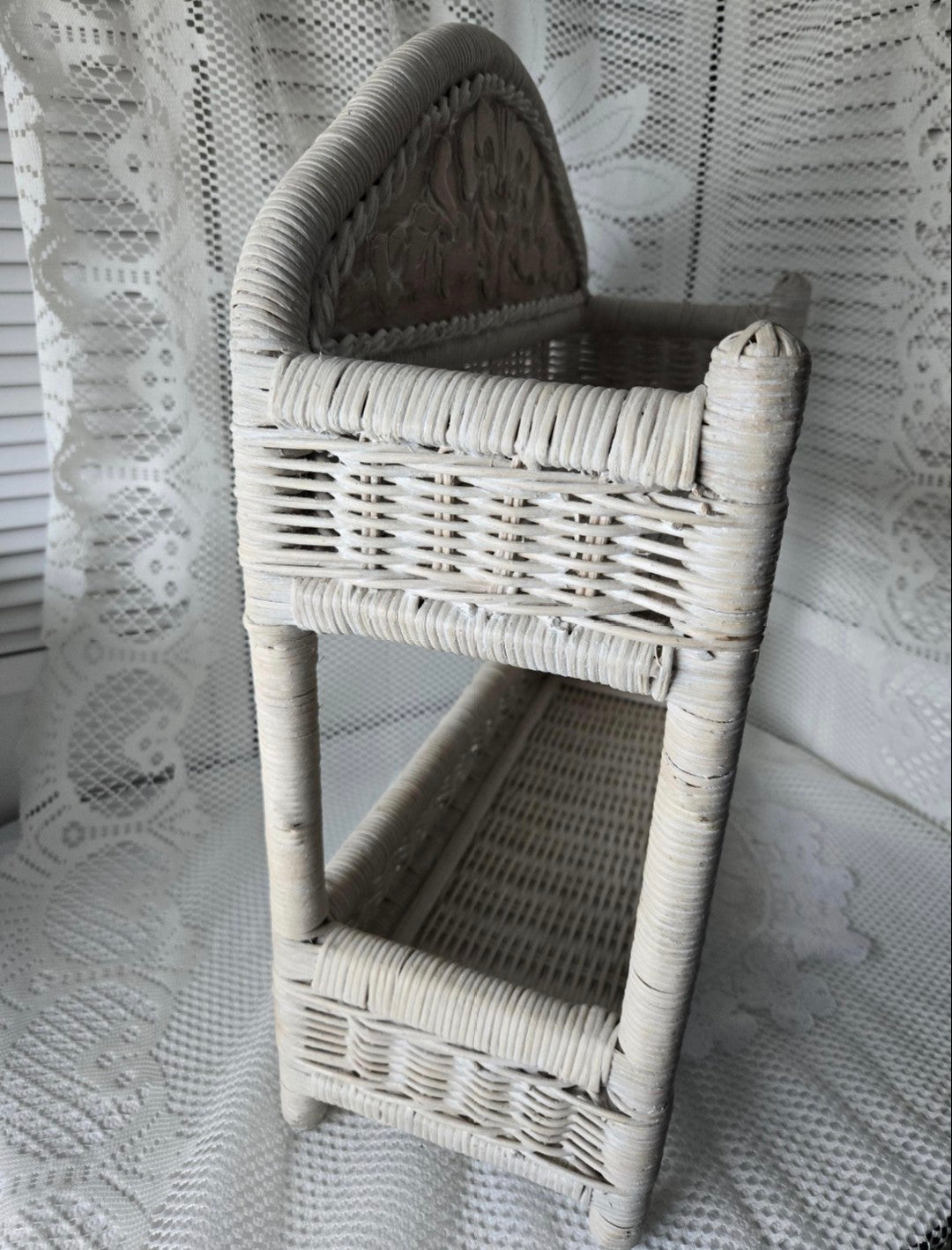 Unique, vintage, arched white wicker wall shelf with carved wood inset motif, and 2 wicker shelves. Can be hung on a wall or stand alone.