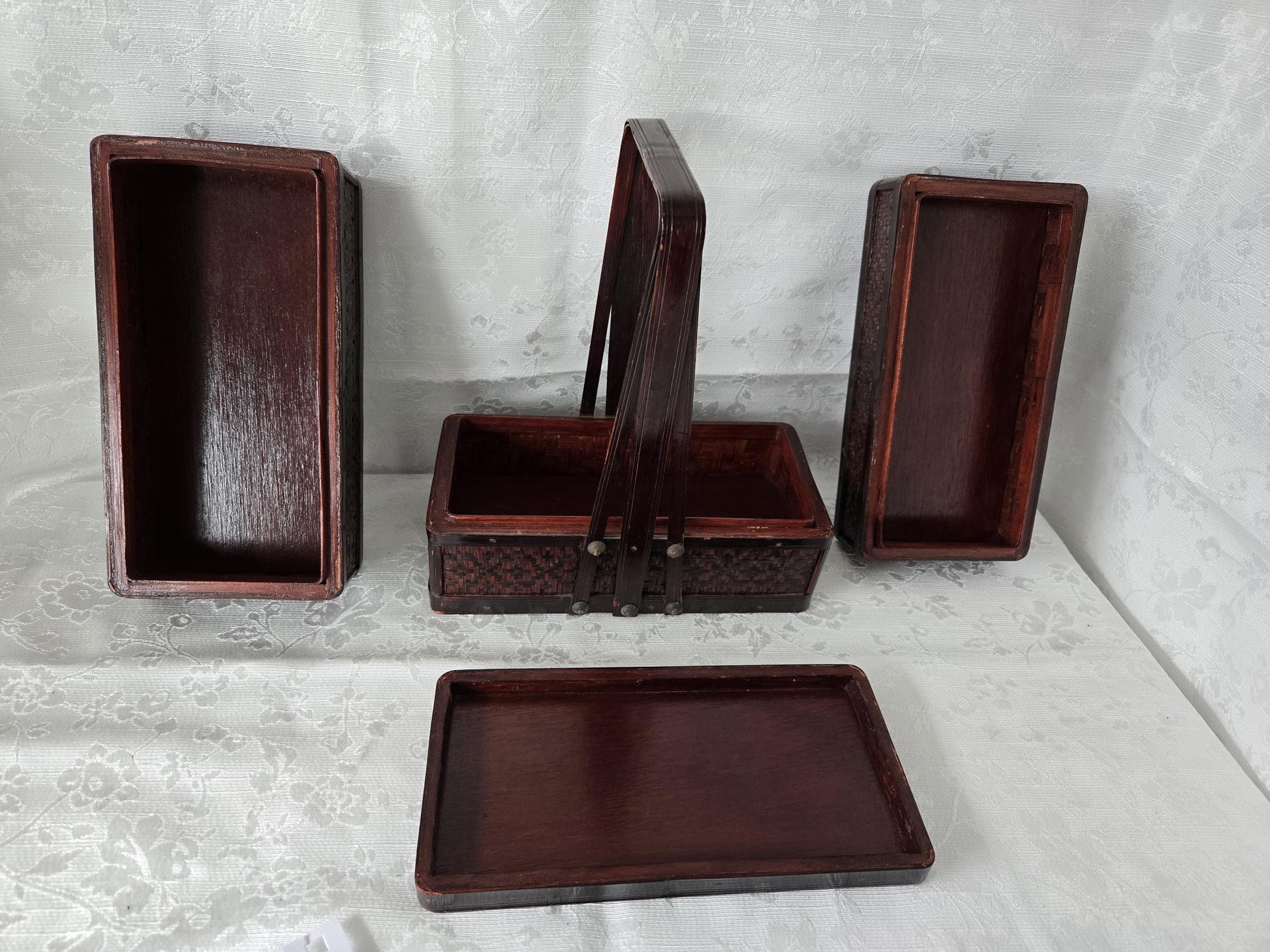 Charming, vintage Chinese petite wedding basket, Basket is woven rattan with a handle and top lid. Basket has 2 removable tiers and 1 stationery. Multiple uses.